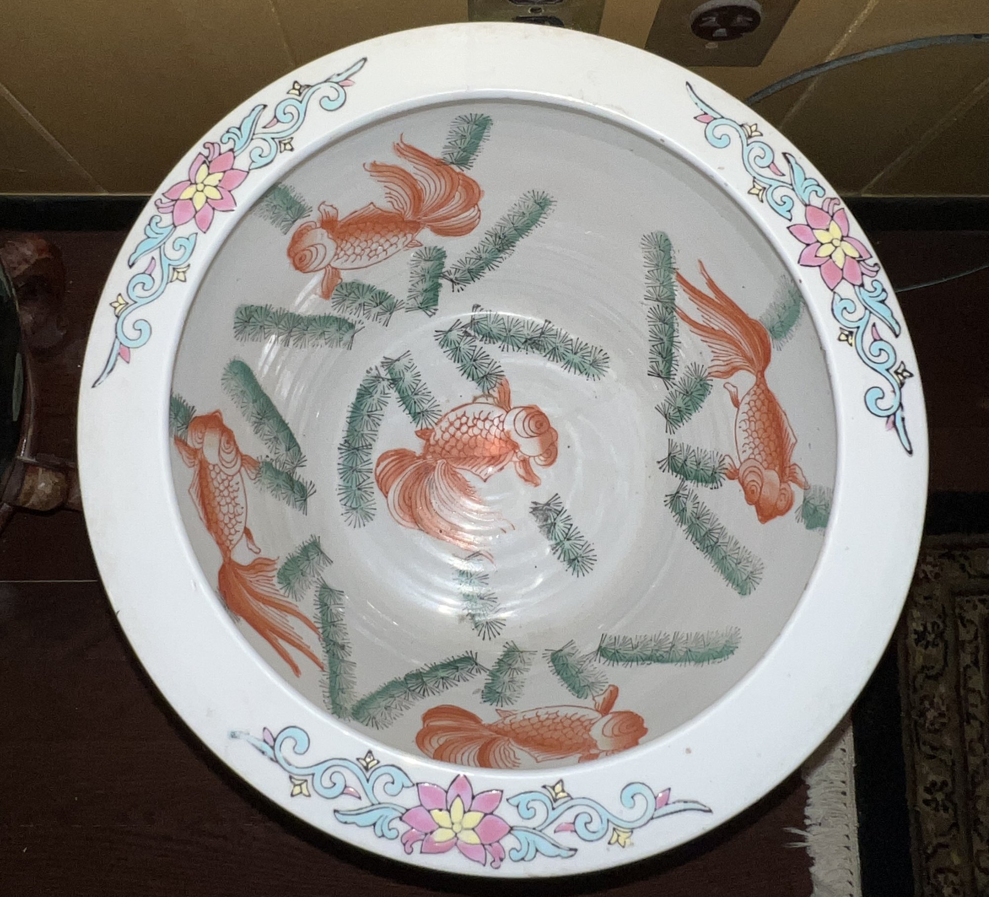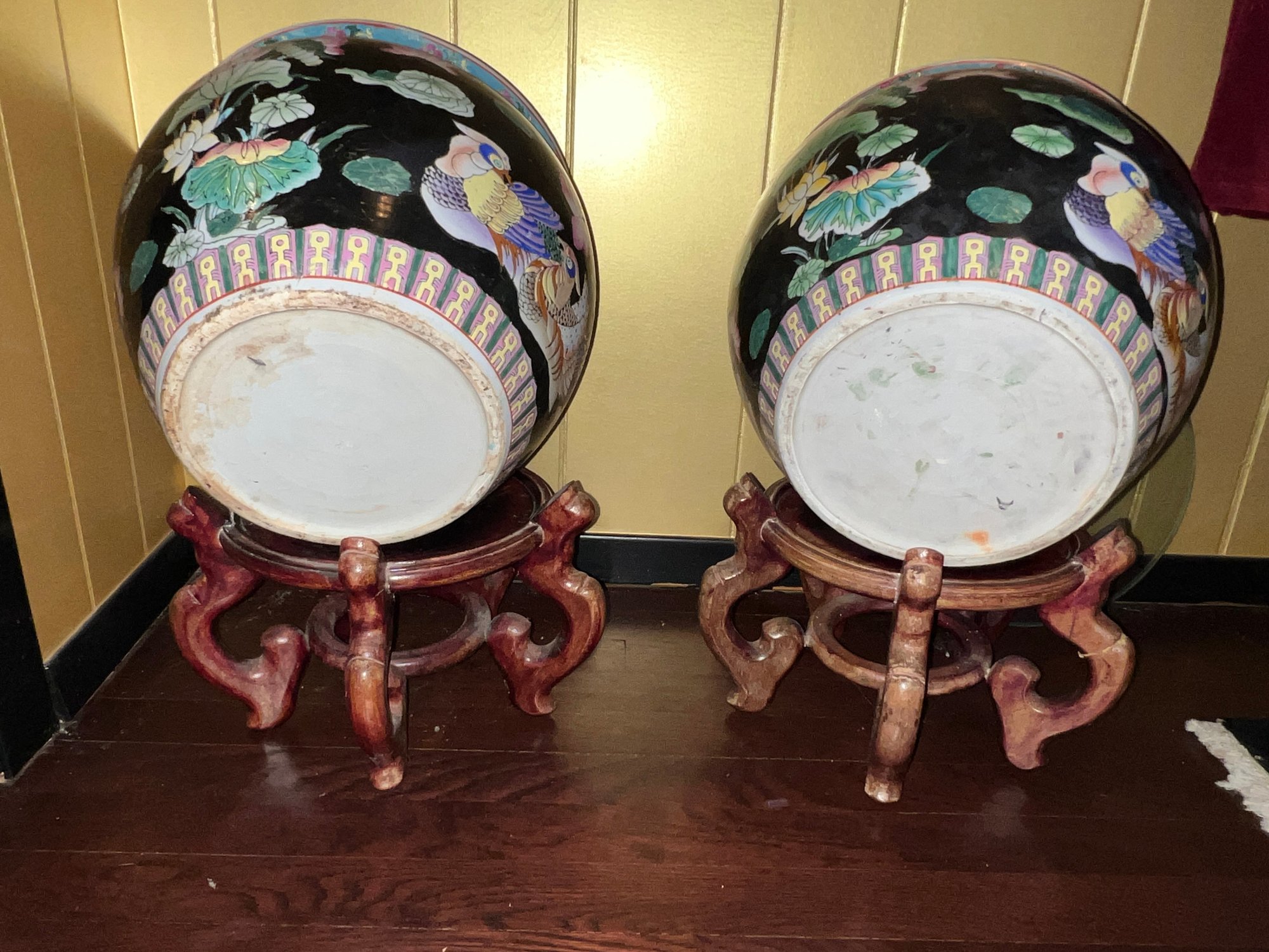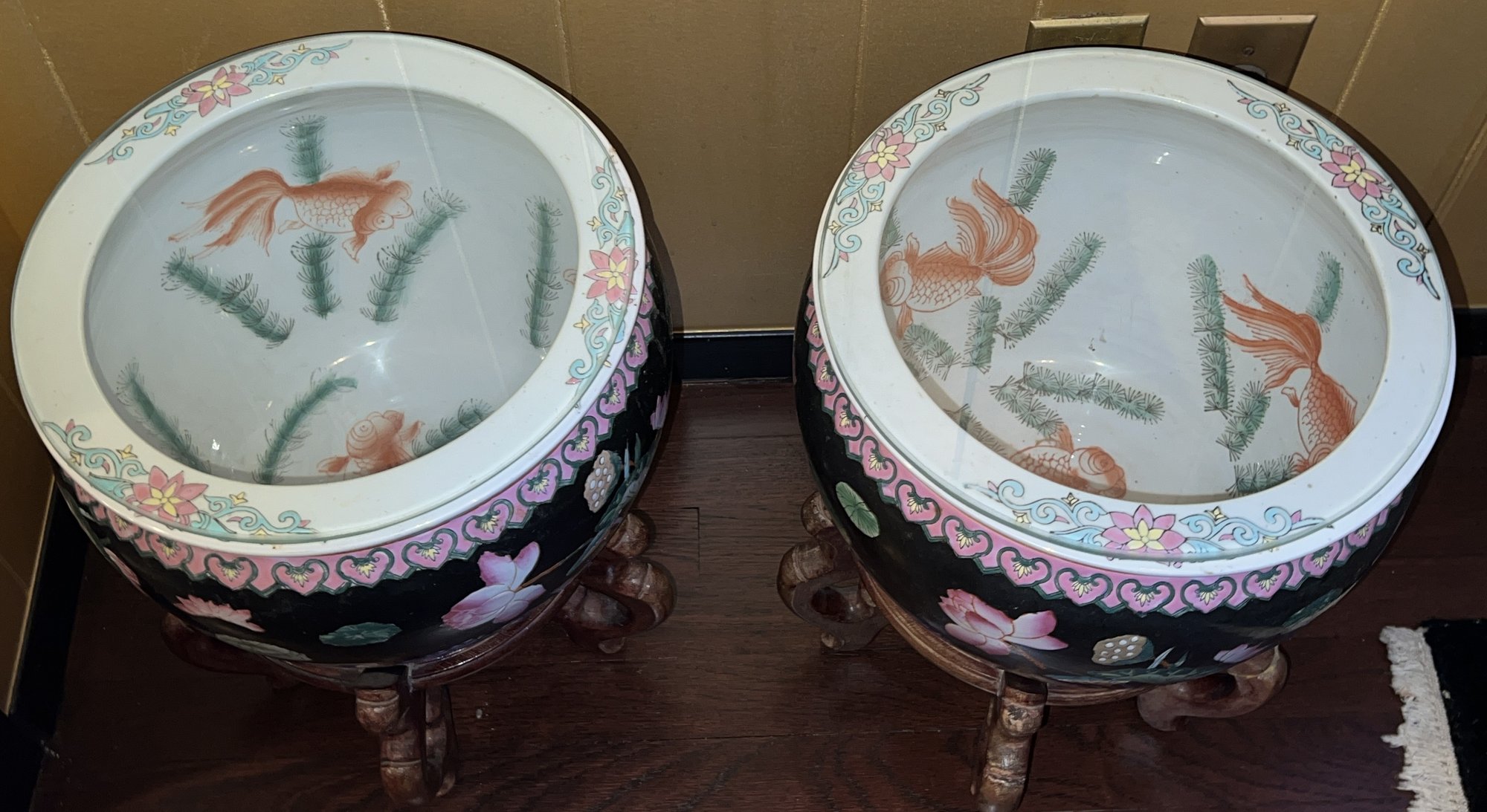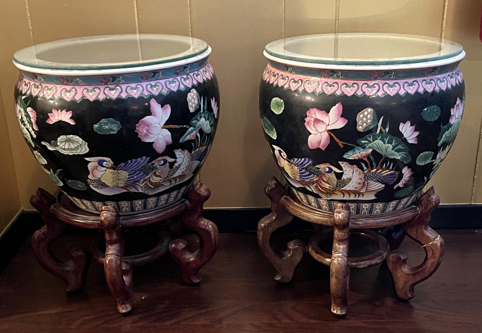 Matching Pair Of Vintage Chinese Porcelain Fish Bowl Planters, typically used for displaying plants or as a decorative accent with stands to elevate the pieces. Also comes with glass tops if wanted to use as tables.