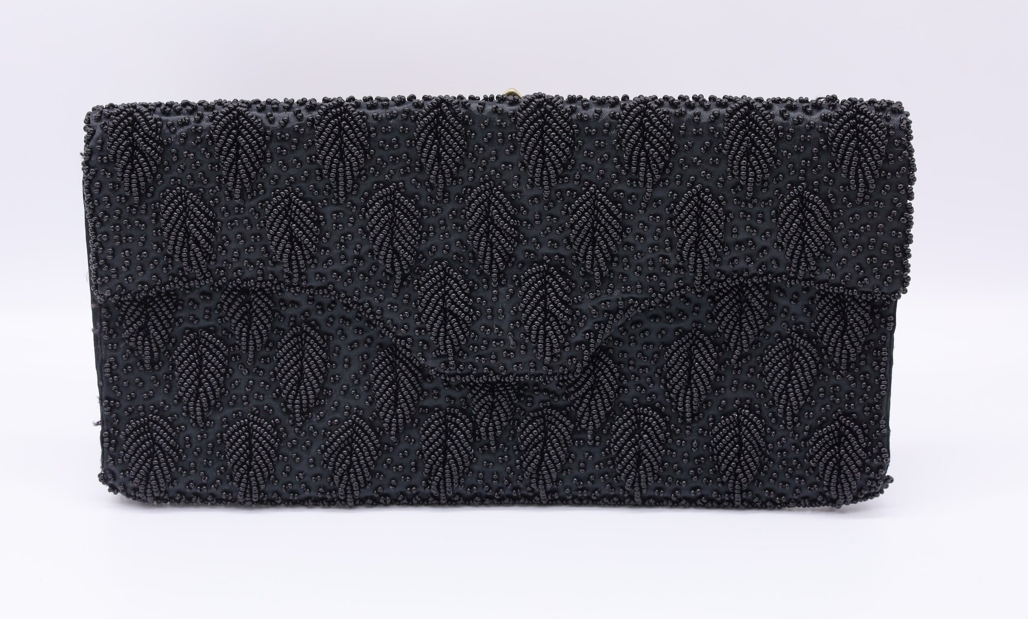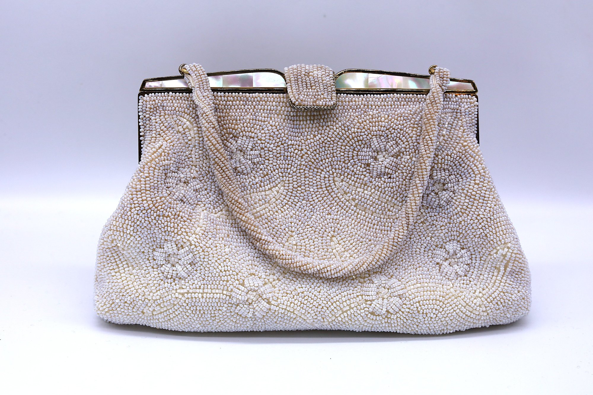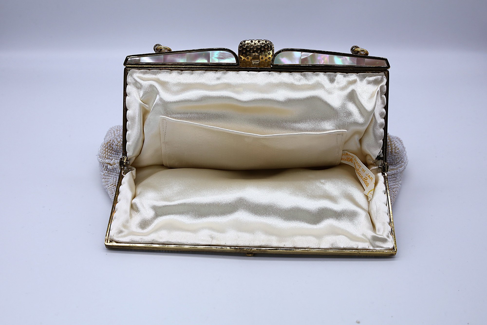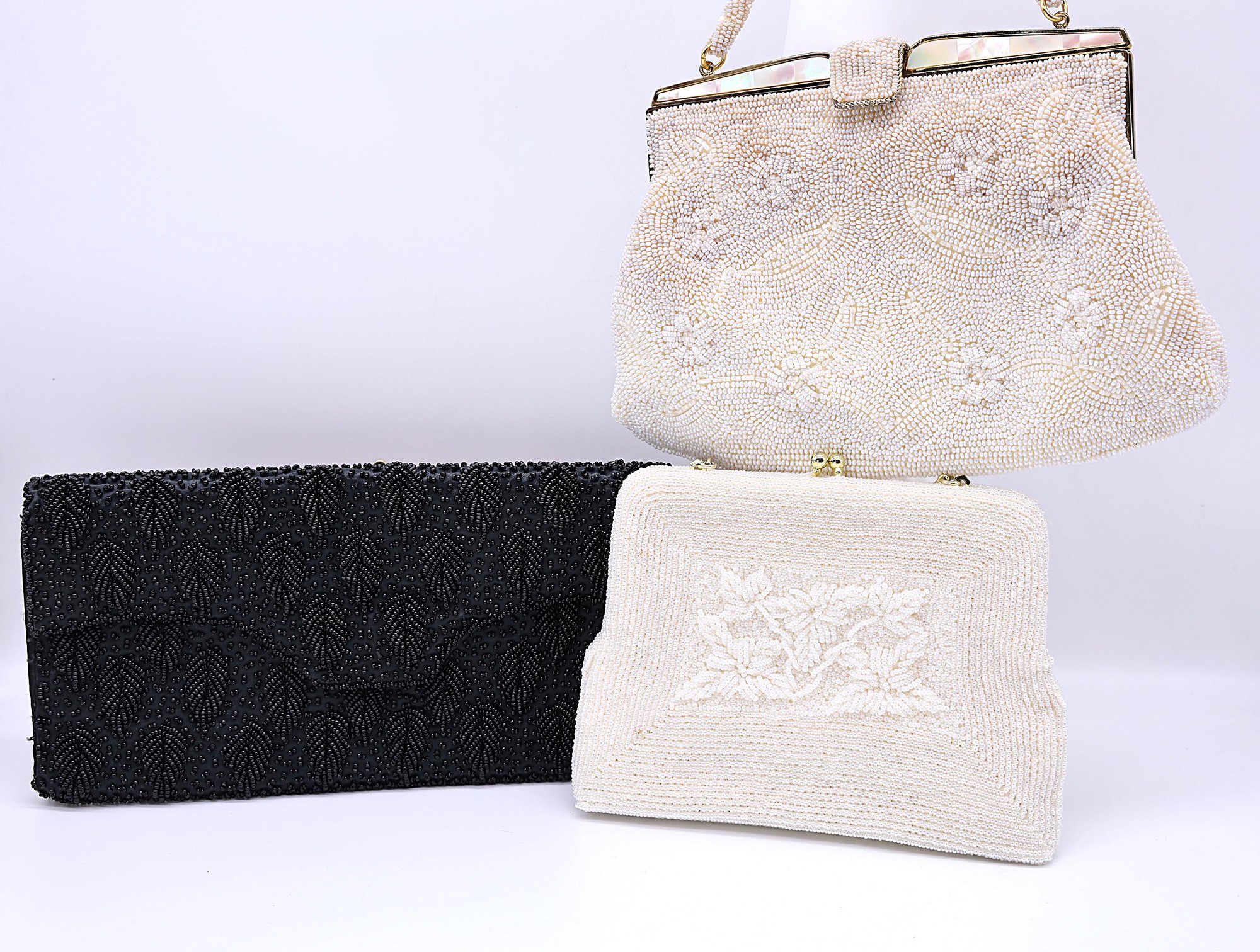 8.5" x 6" with a beaded handle and 4.5" drop - Made in Japan with Italian beads and a mother-of-pearl frame, along with a beaded clasp. 7" x 5" with a 5.5" drop gold chain handle - No label, kiss lock is tight. 9" x 5" Richere black beaded Walborg clutch—minor beads are missing—see photos. I will include some bags to replace those that are lost. All in estate condition - see photos.