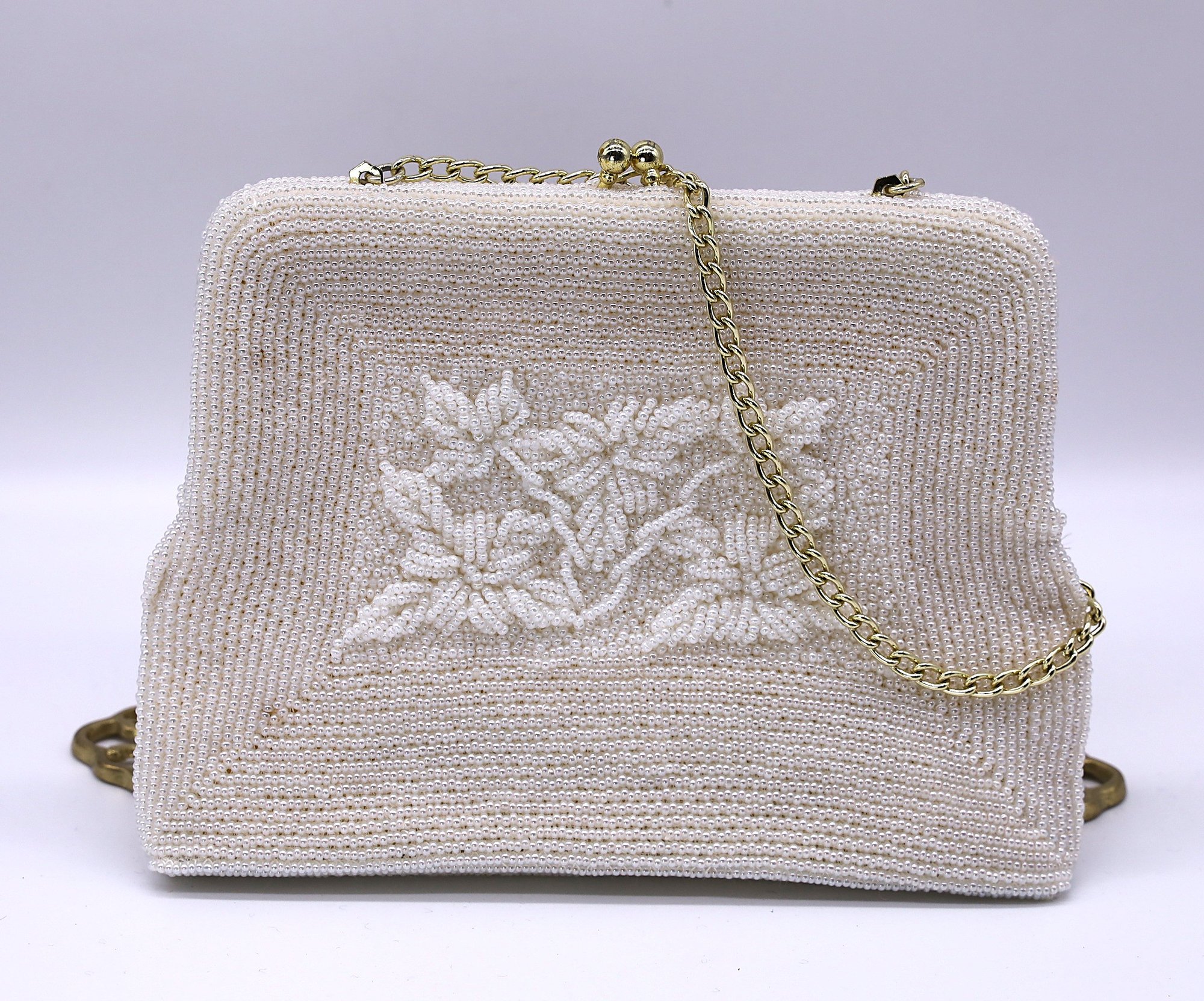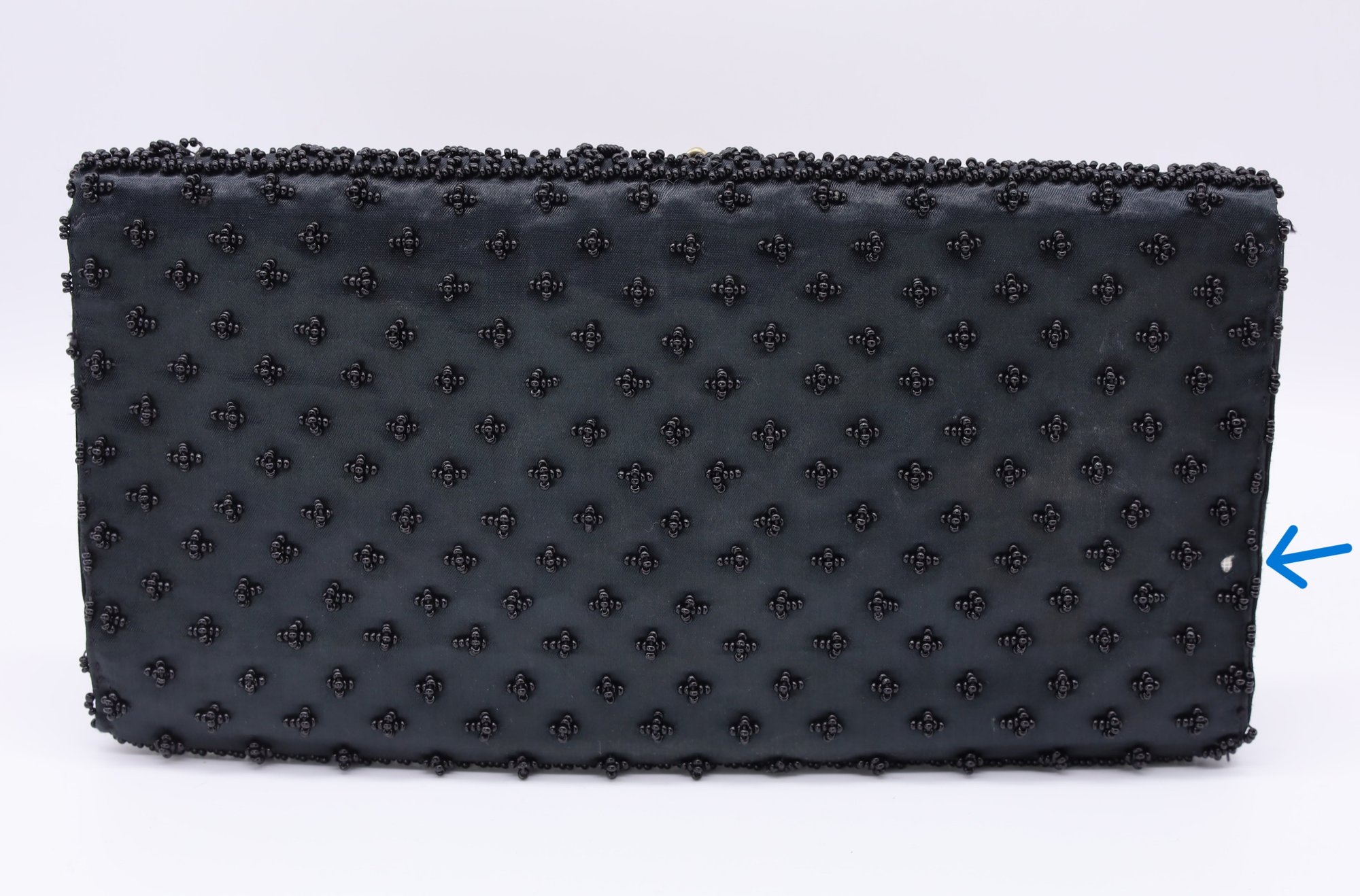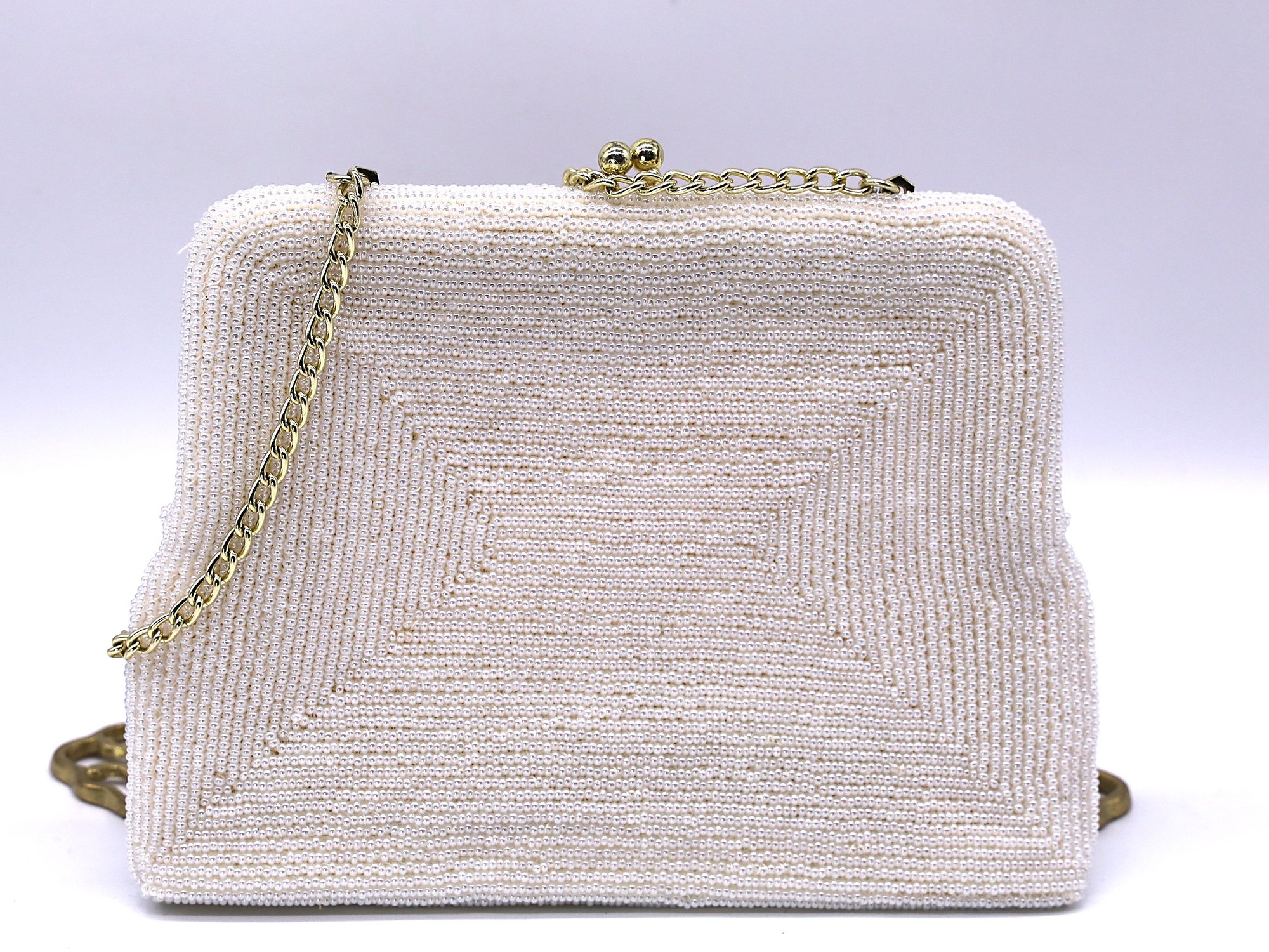 8.5" x 6" with a beaded handle and 4.5" drop - Made in Japan with Italian beads and a mother-of-pearl frame, along with a beaded clasp. 7" x 5" with a 5.5" drop gold chain handle - No label, kiss lock is tight. 9" x 5" Richere black beaded Walborg clutch—minor beads are missing—see photos. I will include some bags to replace those that are lost. All in estate condition - see photos.