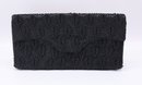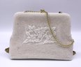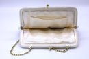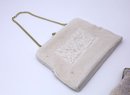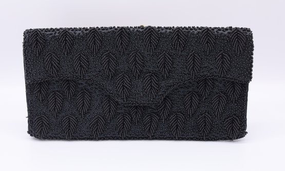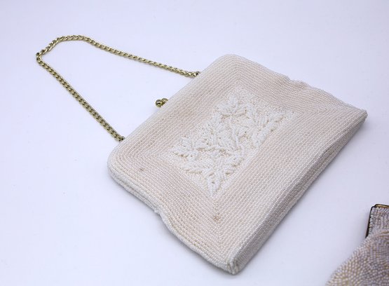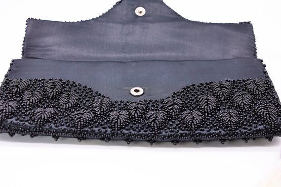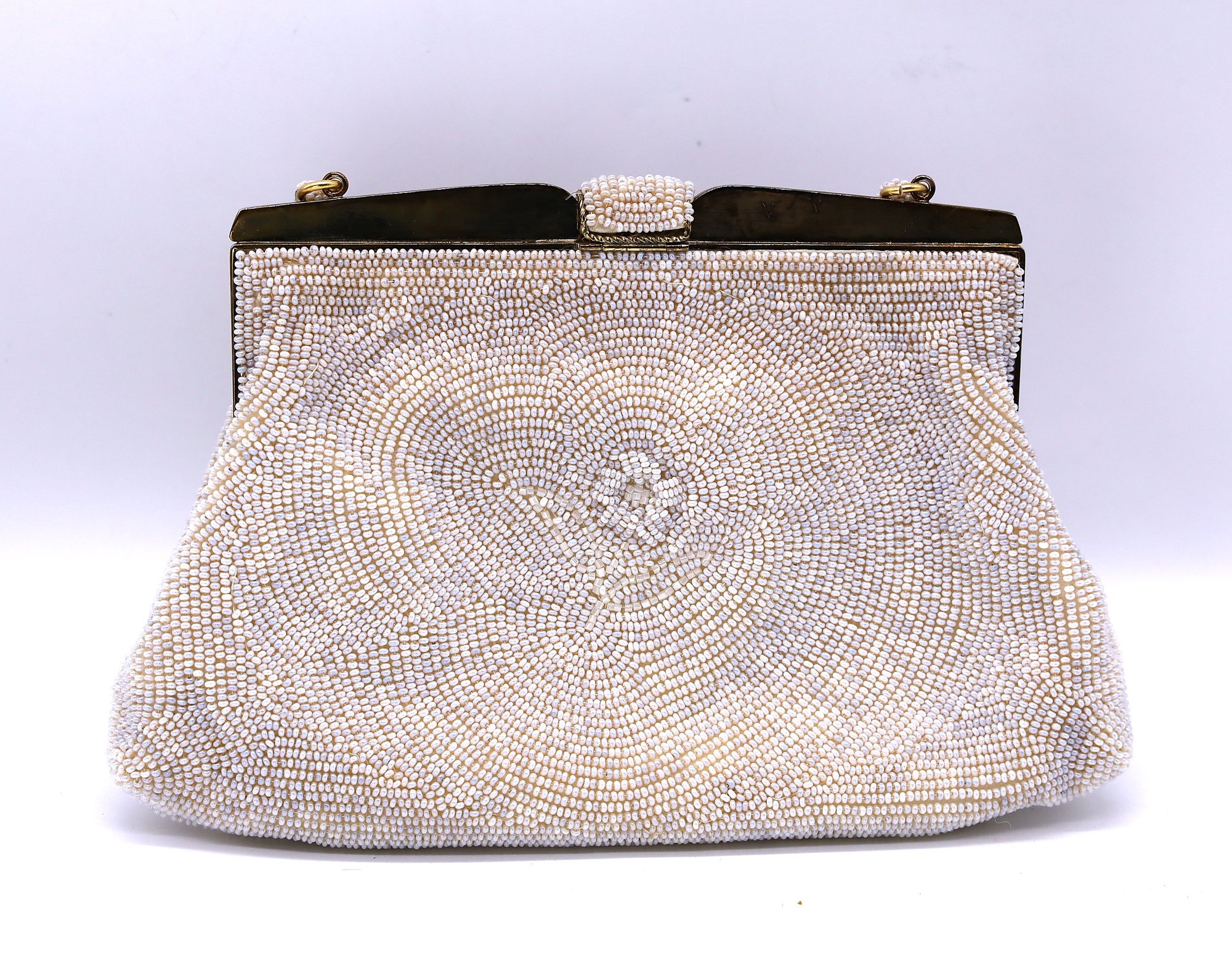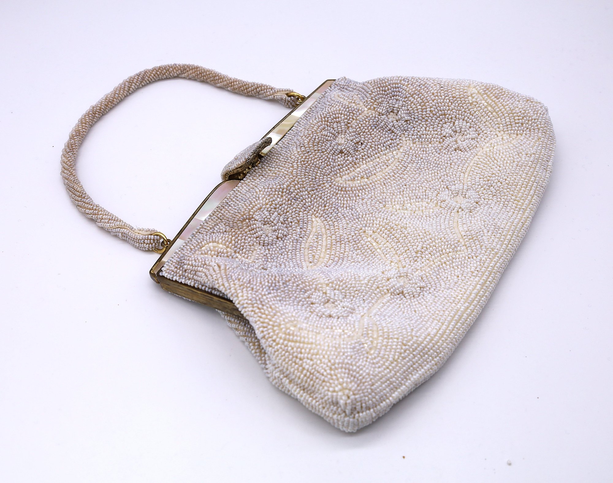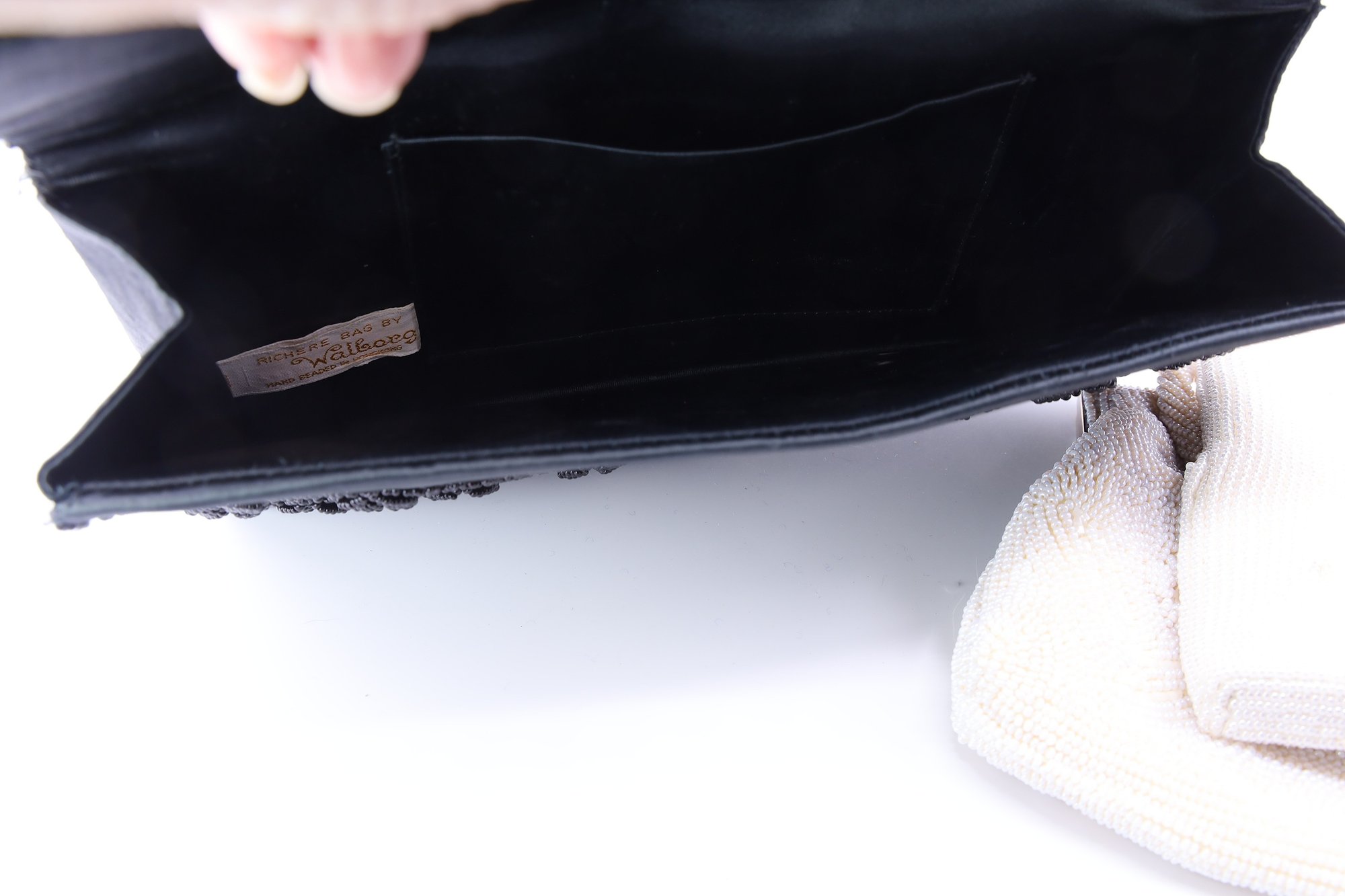 8.5" x 6" with a beaded handle and 4.5" drop - Made in Japan with Italian beads and a mother-of-pearl frame, along with a beaded clasp. 7" x 5" with a 5.5" drop gold chain handle - No label, kiss lock is tight. 9" x 5" Richere black beaded Walborg clutch—minor beads are missing—see photos. I will include some bags to replace those that are lost. All in estate condition - see photos.