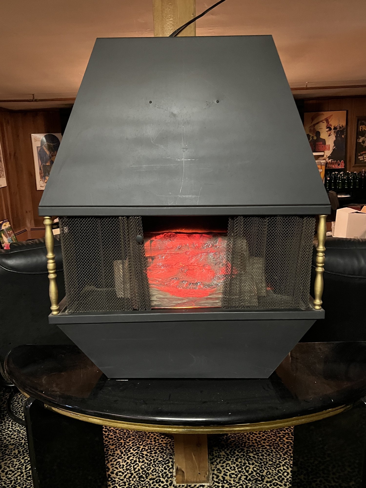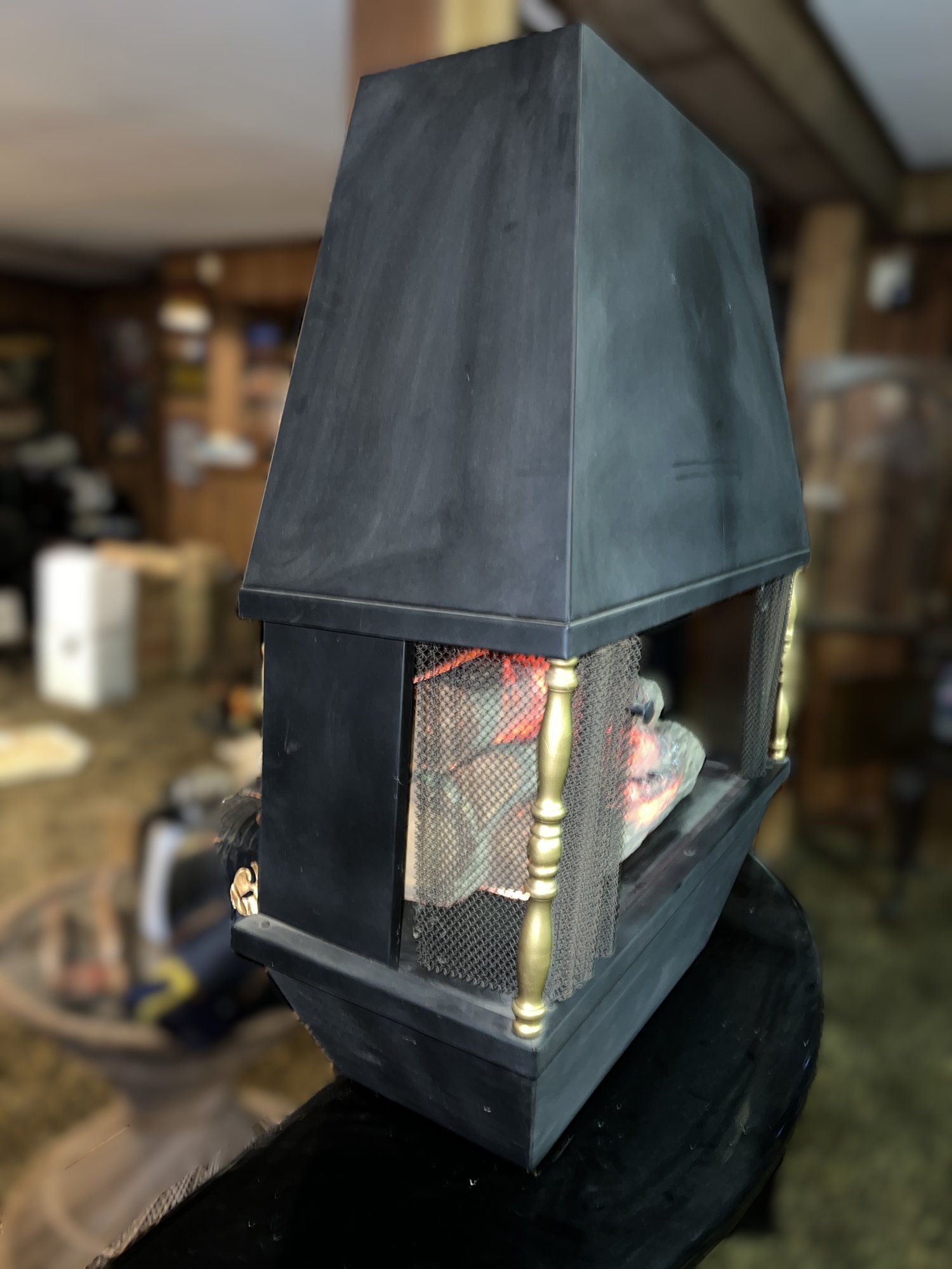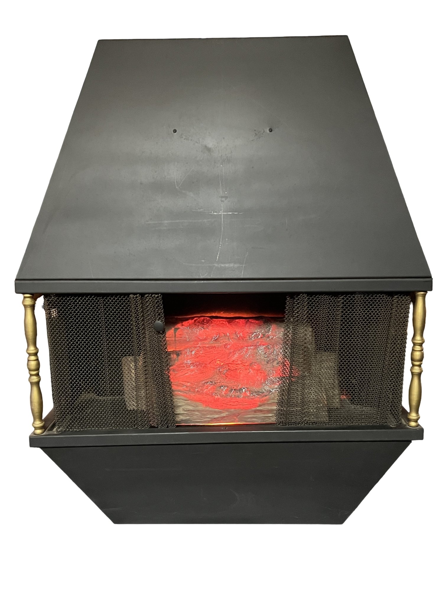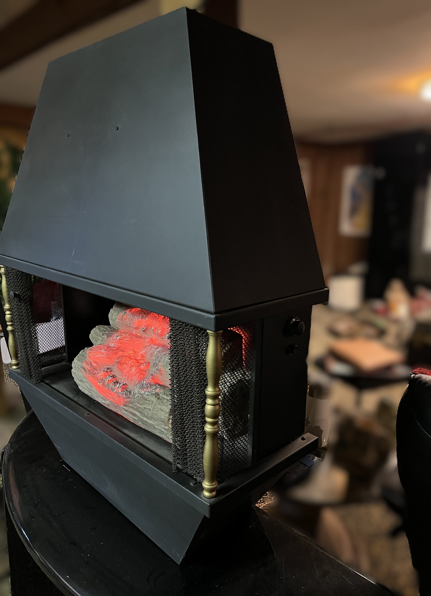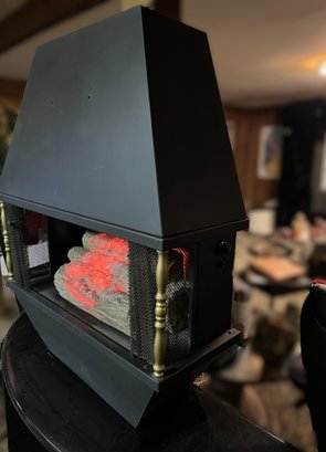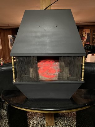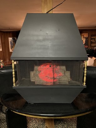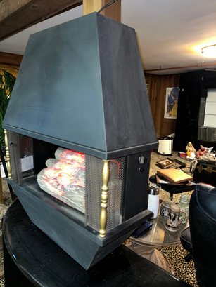 It showcases a unique hexagonal or hood-shaped metal body finished in black with brass-colored accents. The unit is equipped with a mesh chain screen that opens and closes easily. It serves as both a decorative item and a space heater, featuring a realistic log set and ember bed effect.