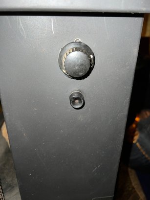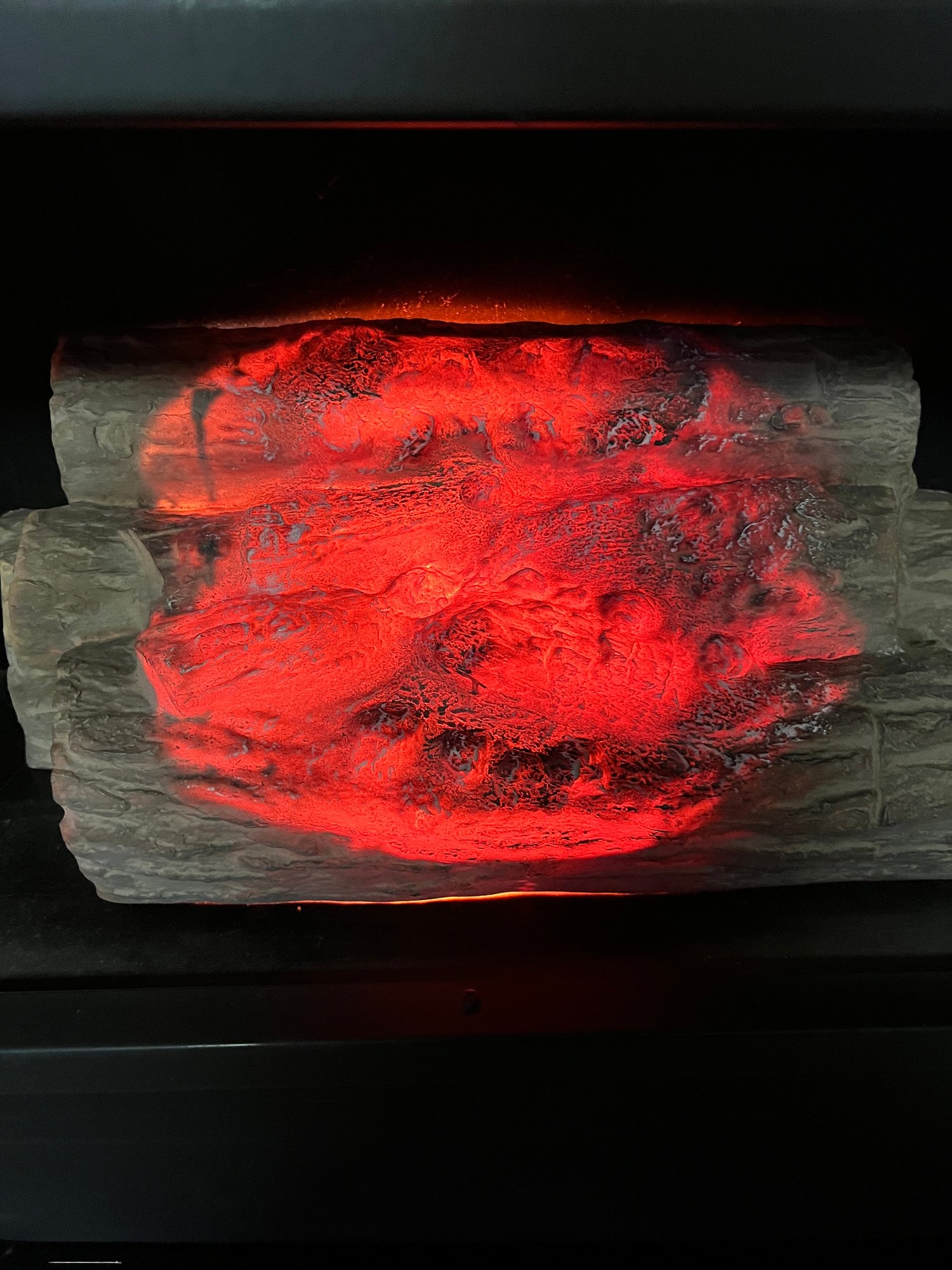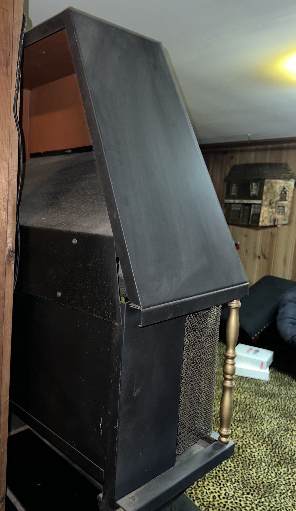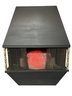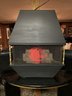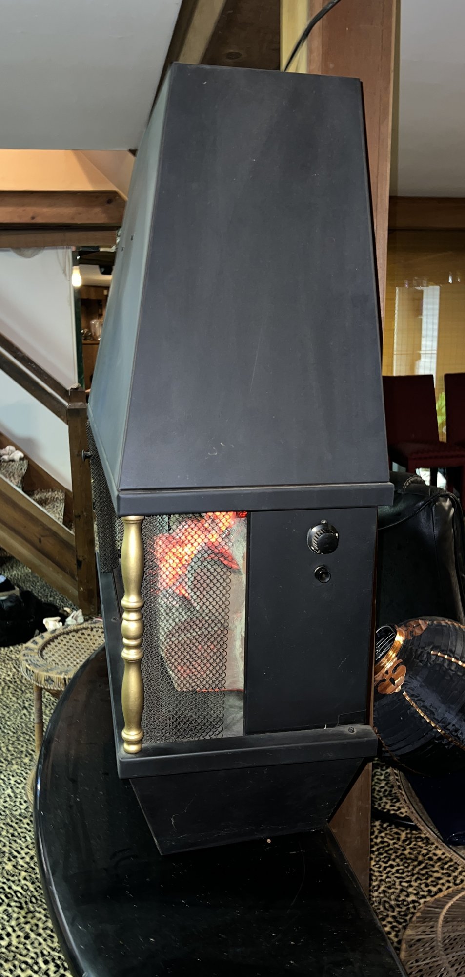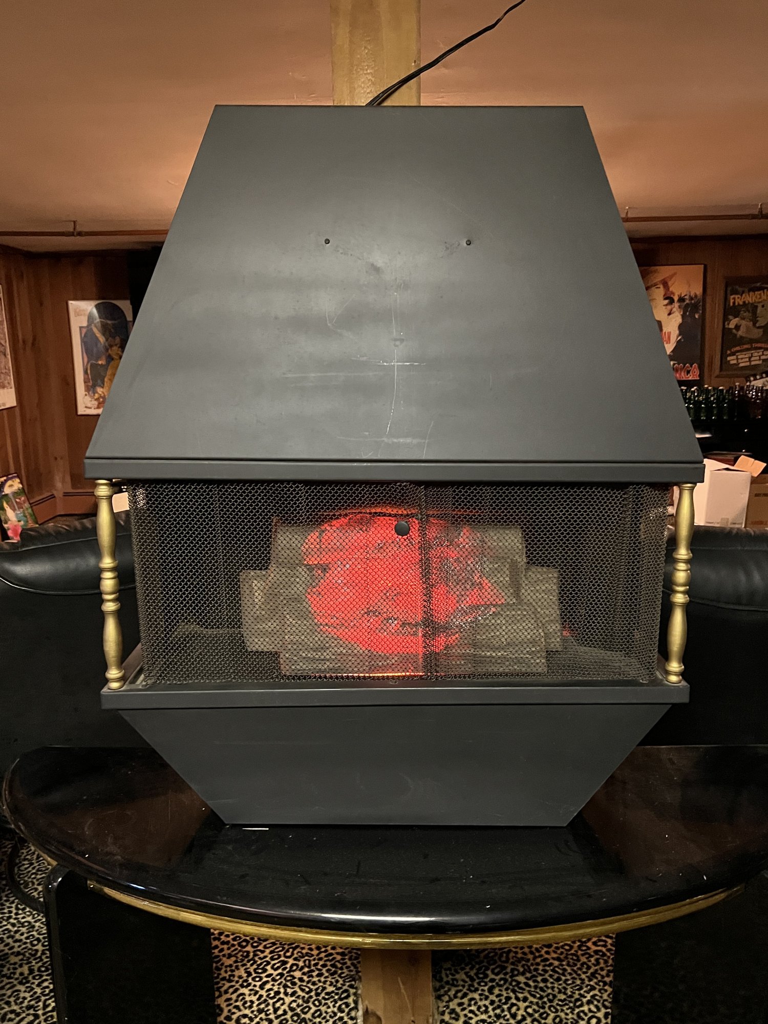 It showcases a unique hexagonal or hood-shaped metal body finished in black with brass-colored accents. The unit is equipped with a mesh chain screen that opens and closes easily. It serves as both a decorative item and a space heater, featuring a realistic log set and ember bed effect.