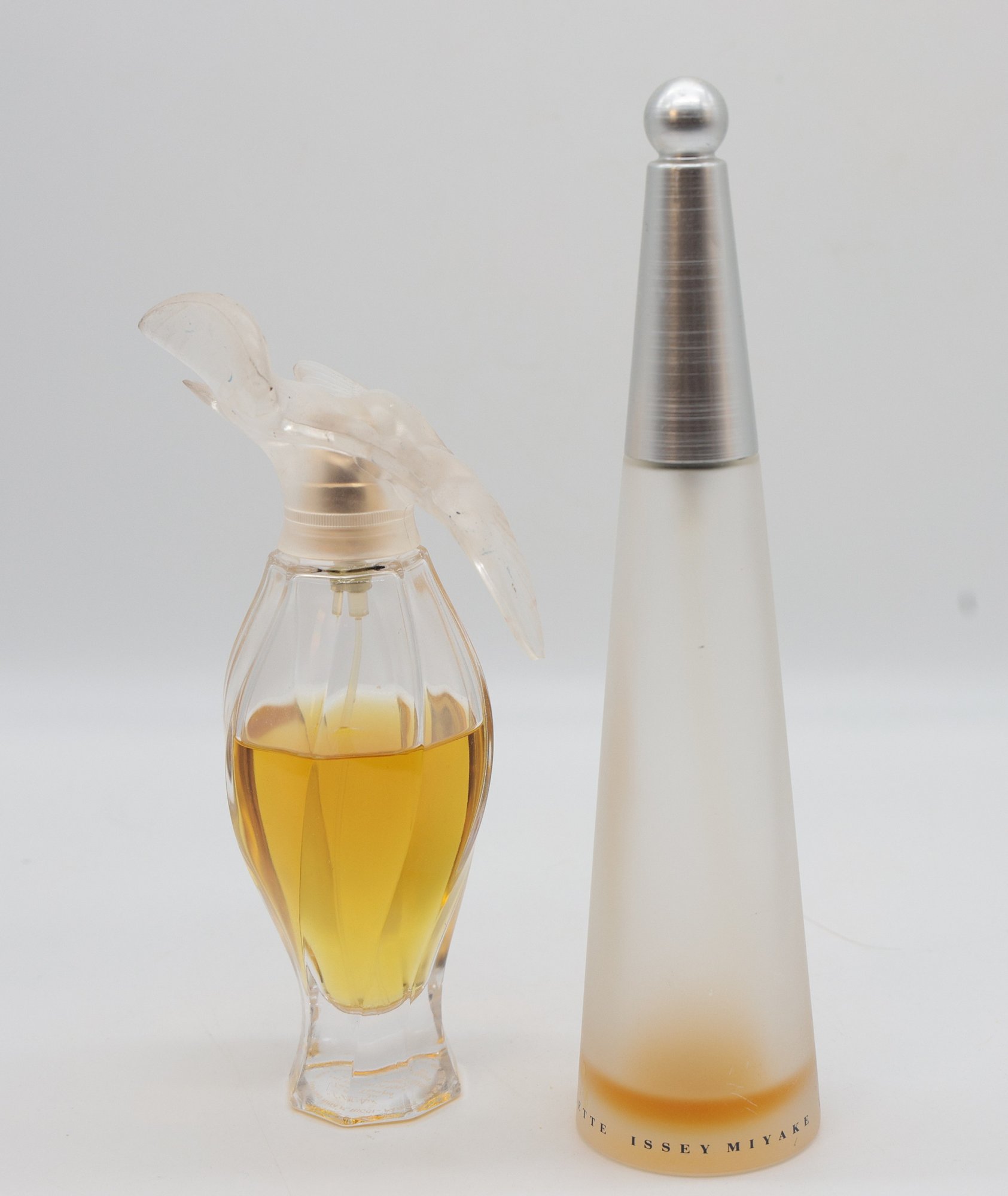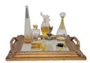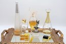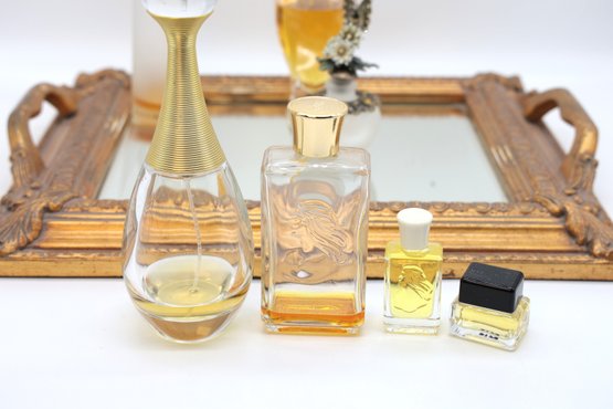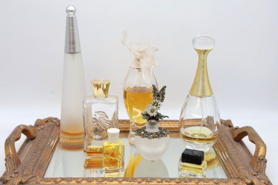 Mirrored tray with handles and seven used perfumes, including Marc Jacobs, Nina Ricci, Jadore, and White Shouder.