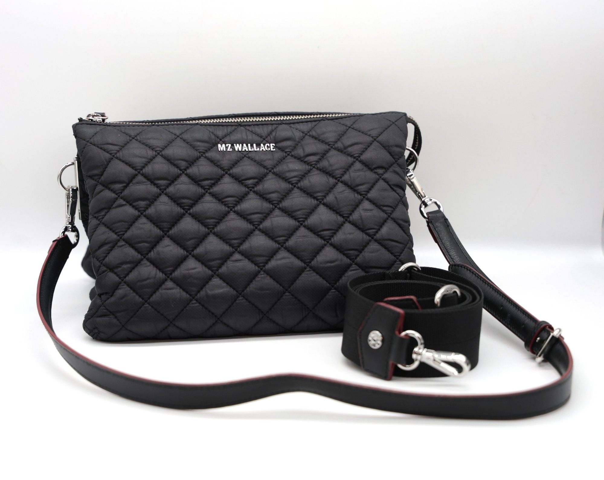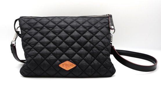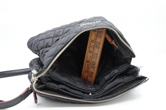 MZ Wallace Large Crosby Pippa Crossbody Bag with black quilted nylon and red accents. Zipper closure, " x ccordian style interiorwith multiple compartments. Comes with Nylon strap. Very nice condition.