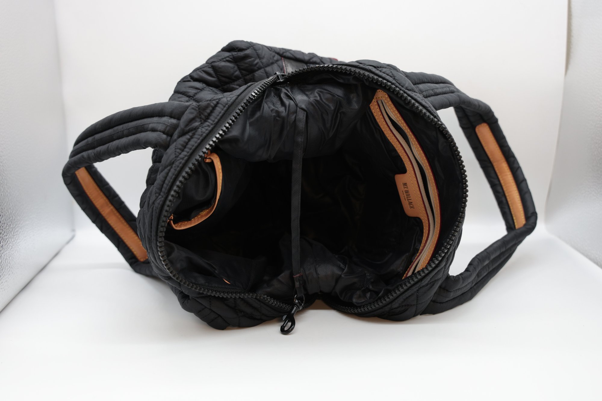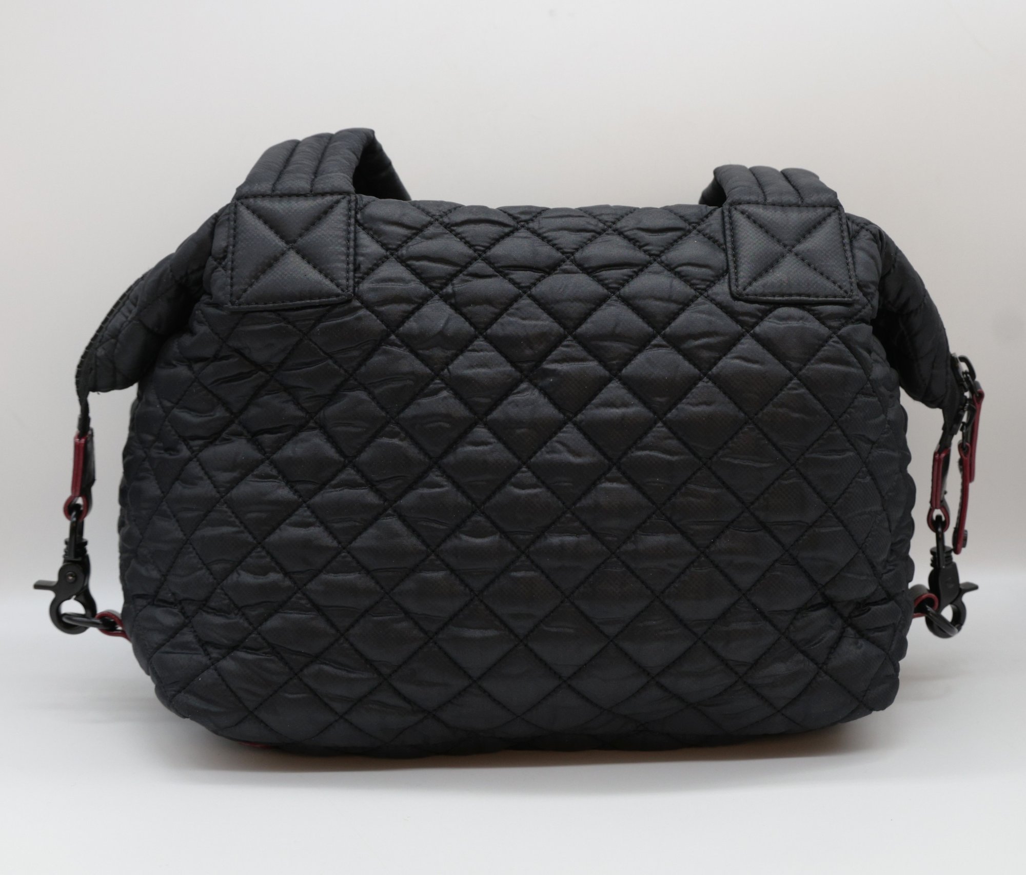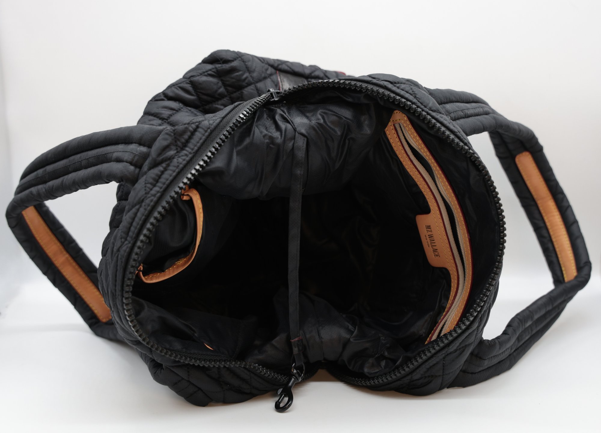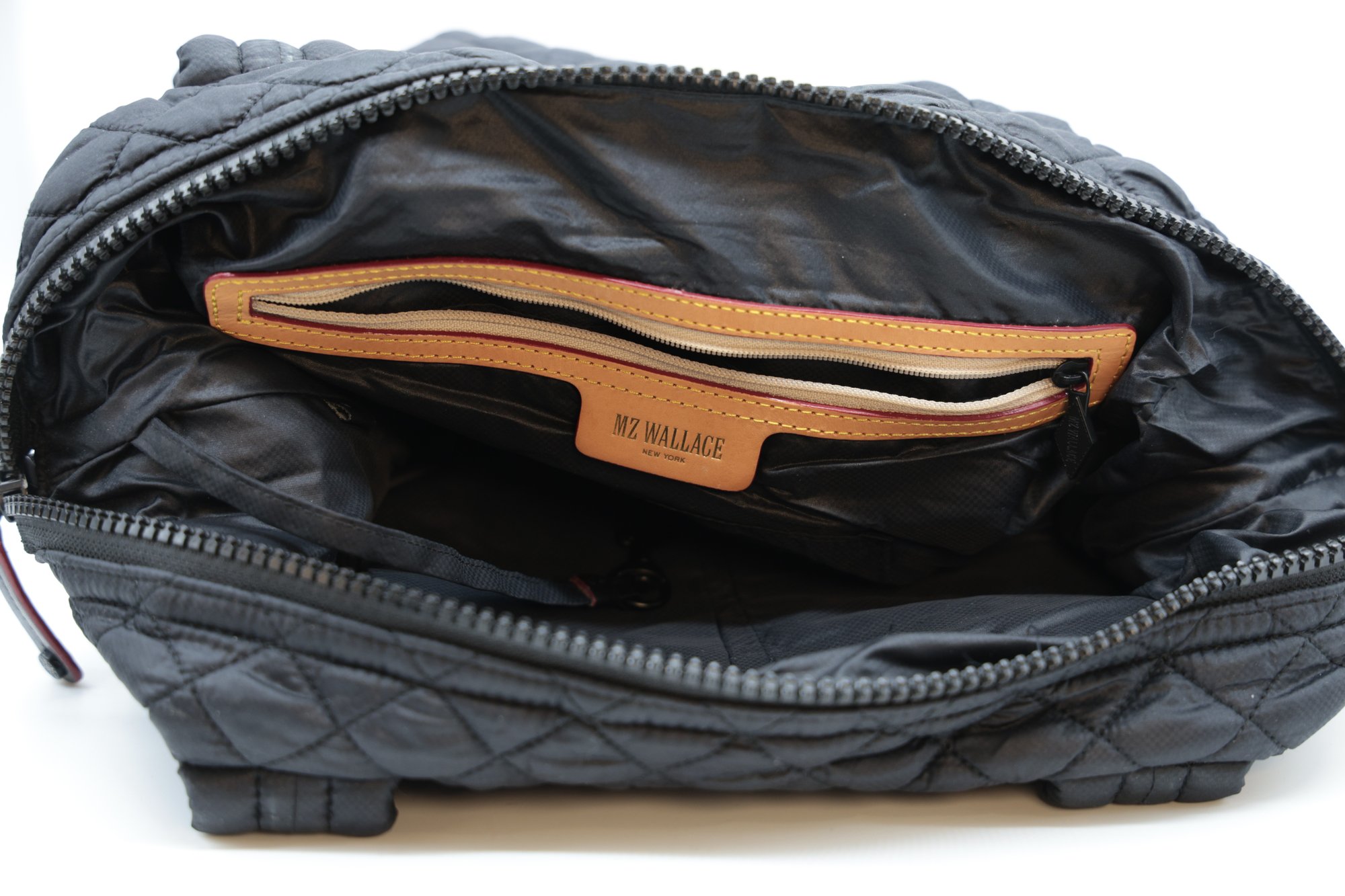 MZ Wallace Sutton Deluxe Quilted Tote with a large zipper inside, 2 pockets in black. 90% Nylon, 10% leather- Made in USA