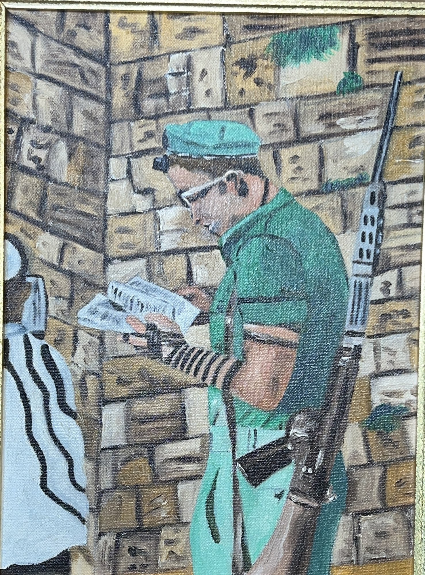 Oil on board depicts a soldier in a green uniform standing at the western wall in Jerusalem