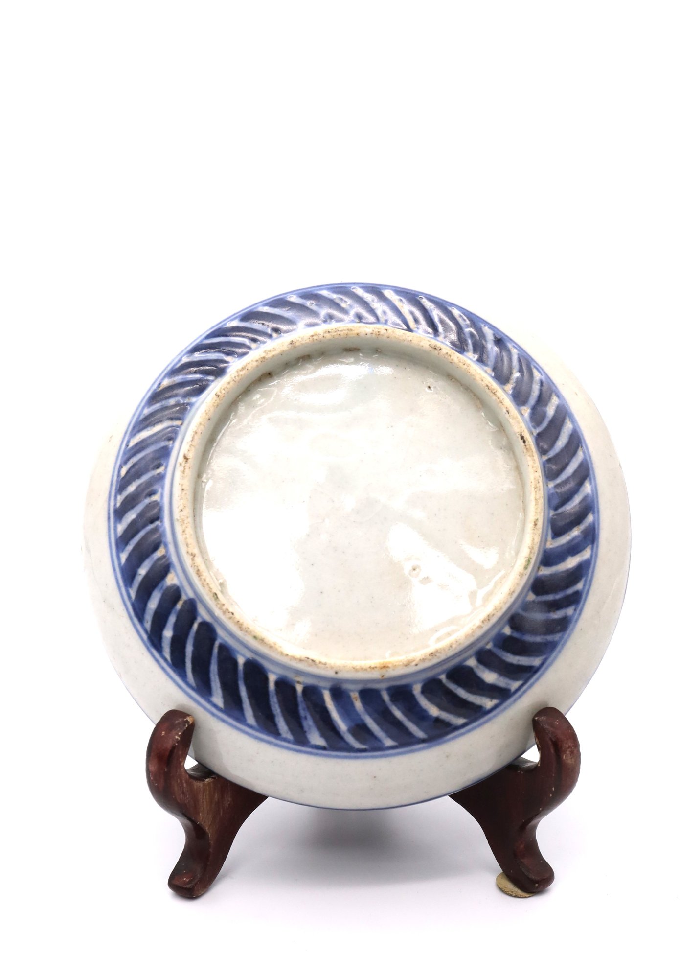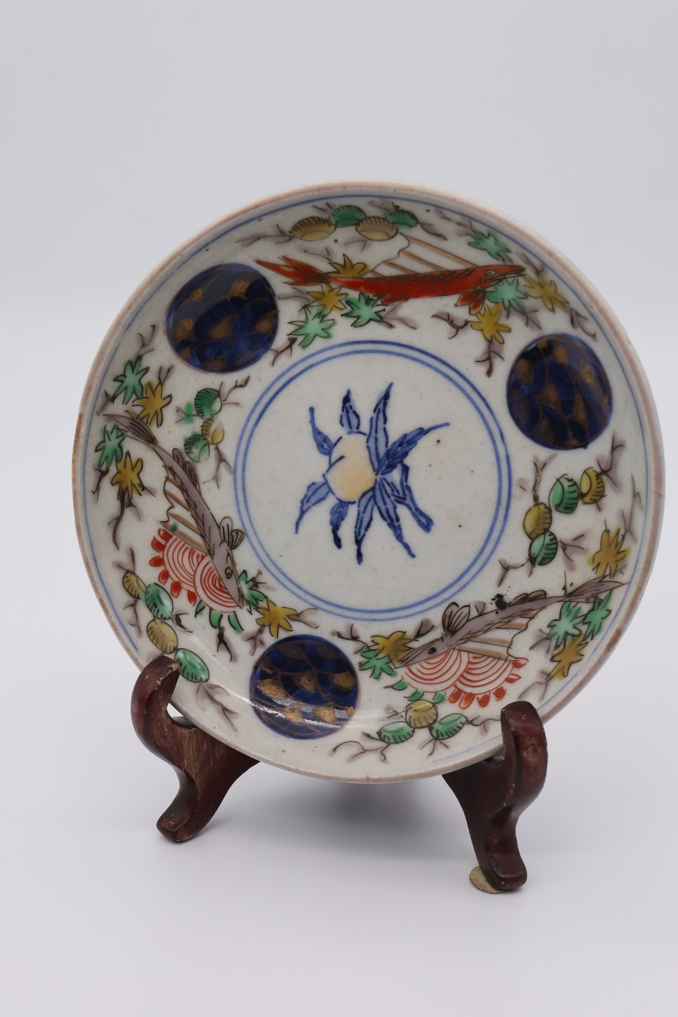 old rare Japanese Beautiful Antique Porcelain Dish with 3 fish and decorations . No markings - some crazing