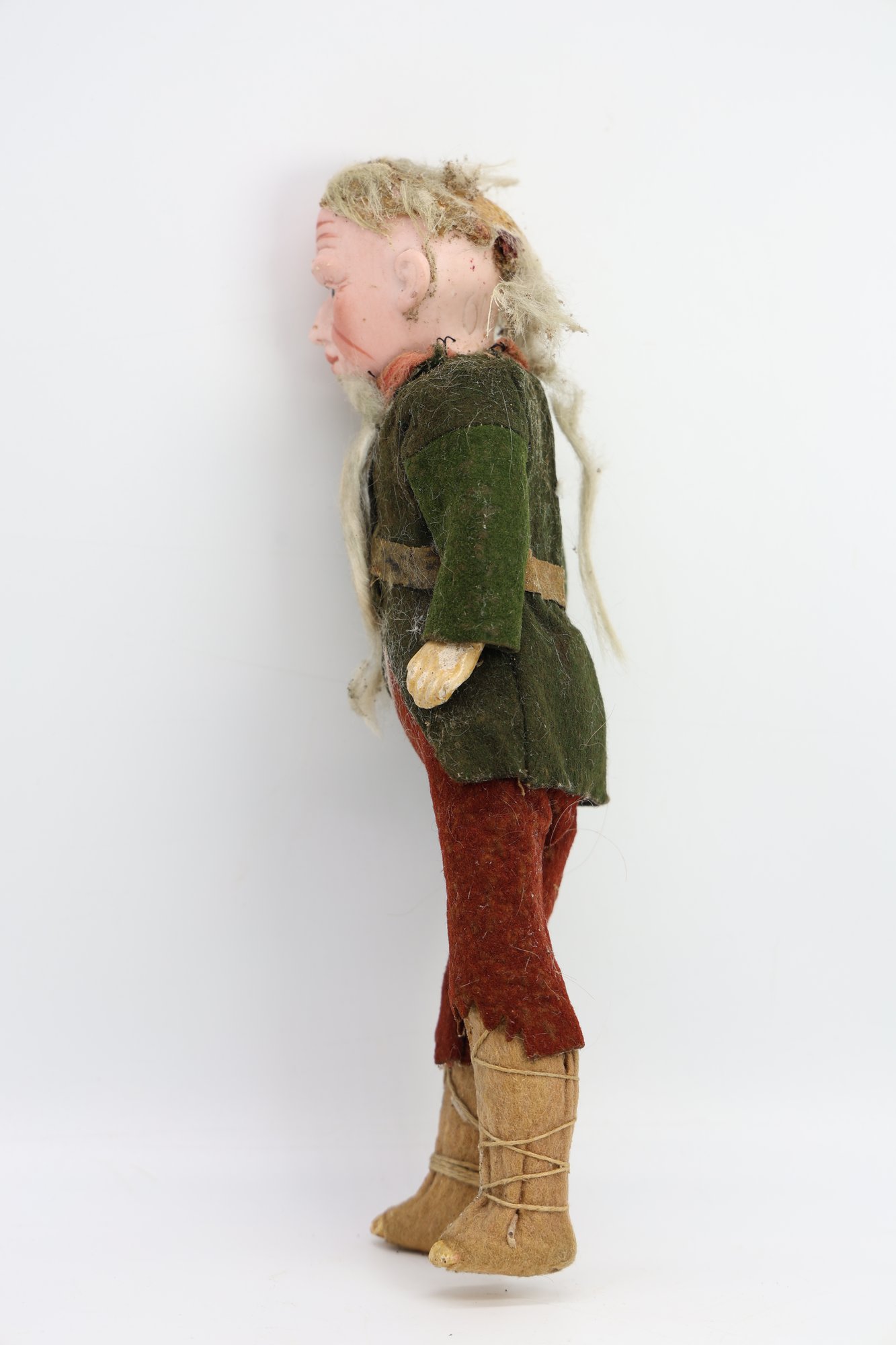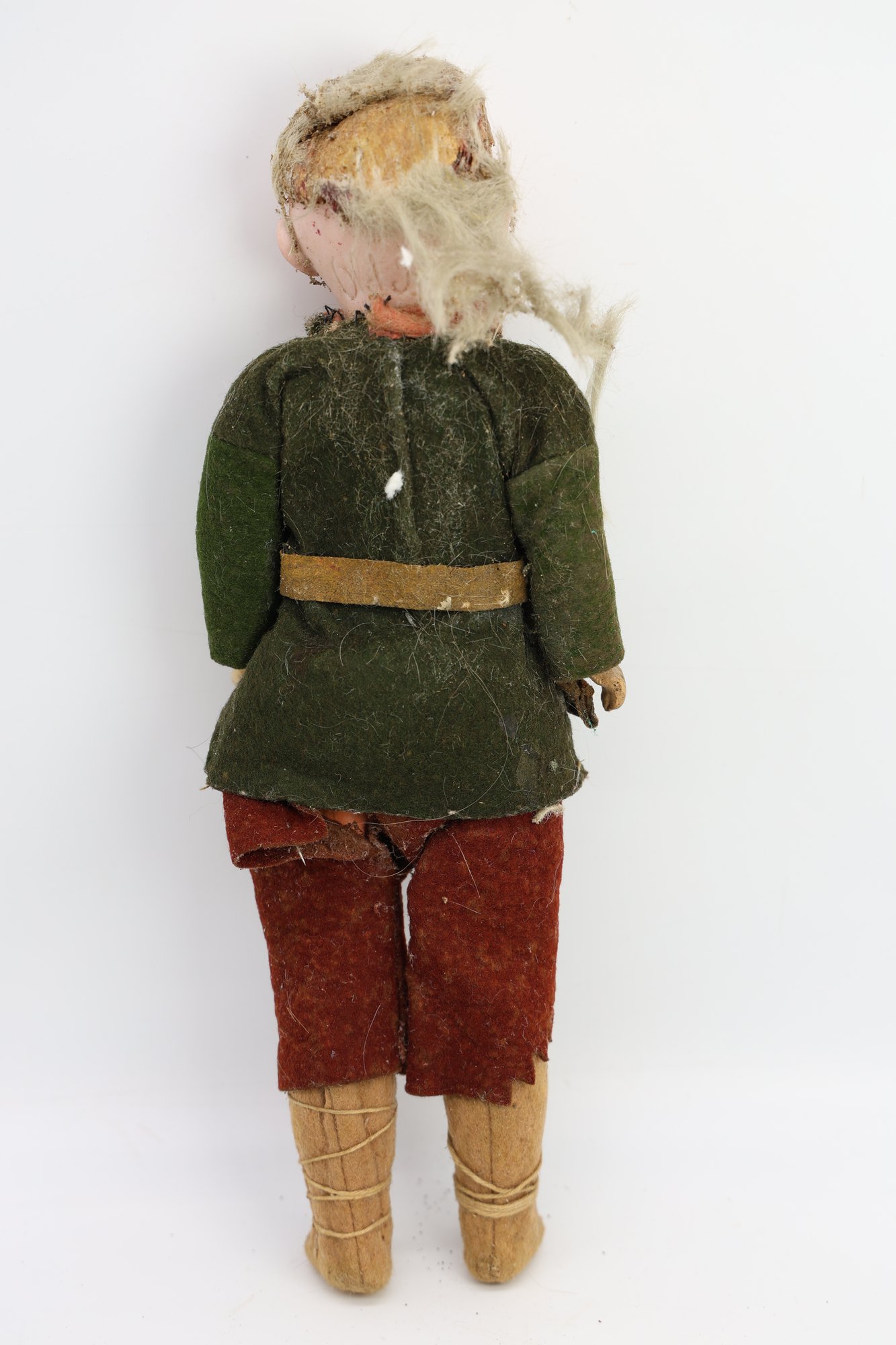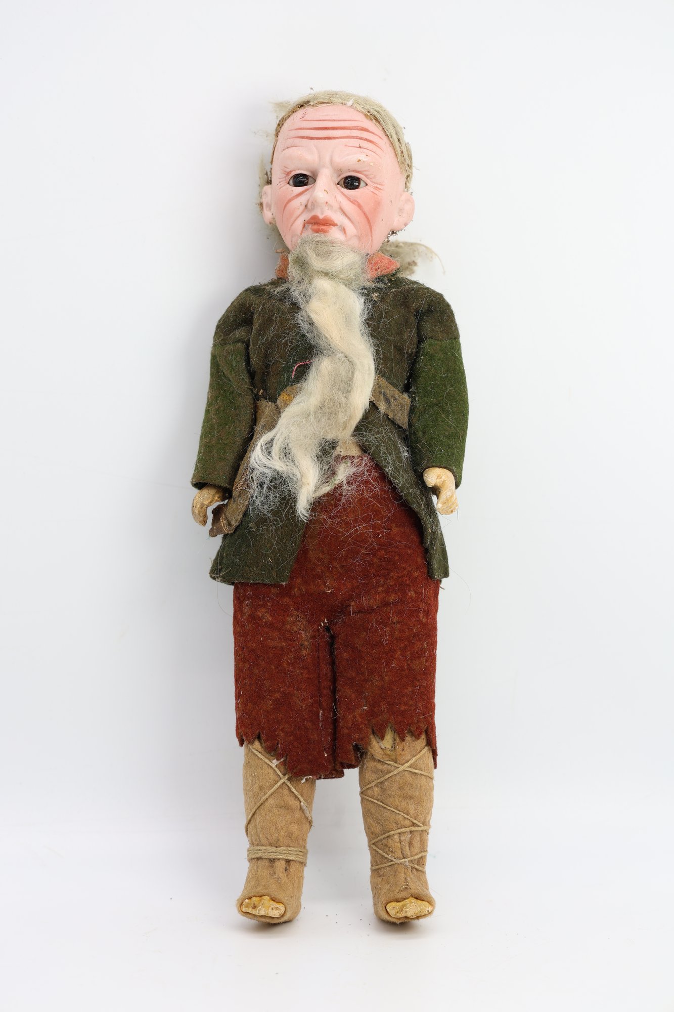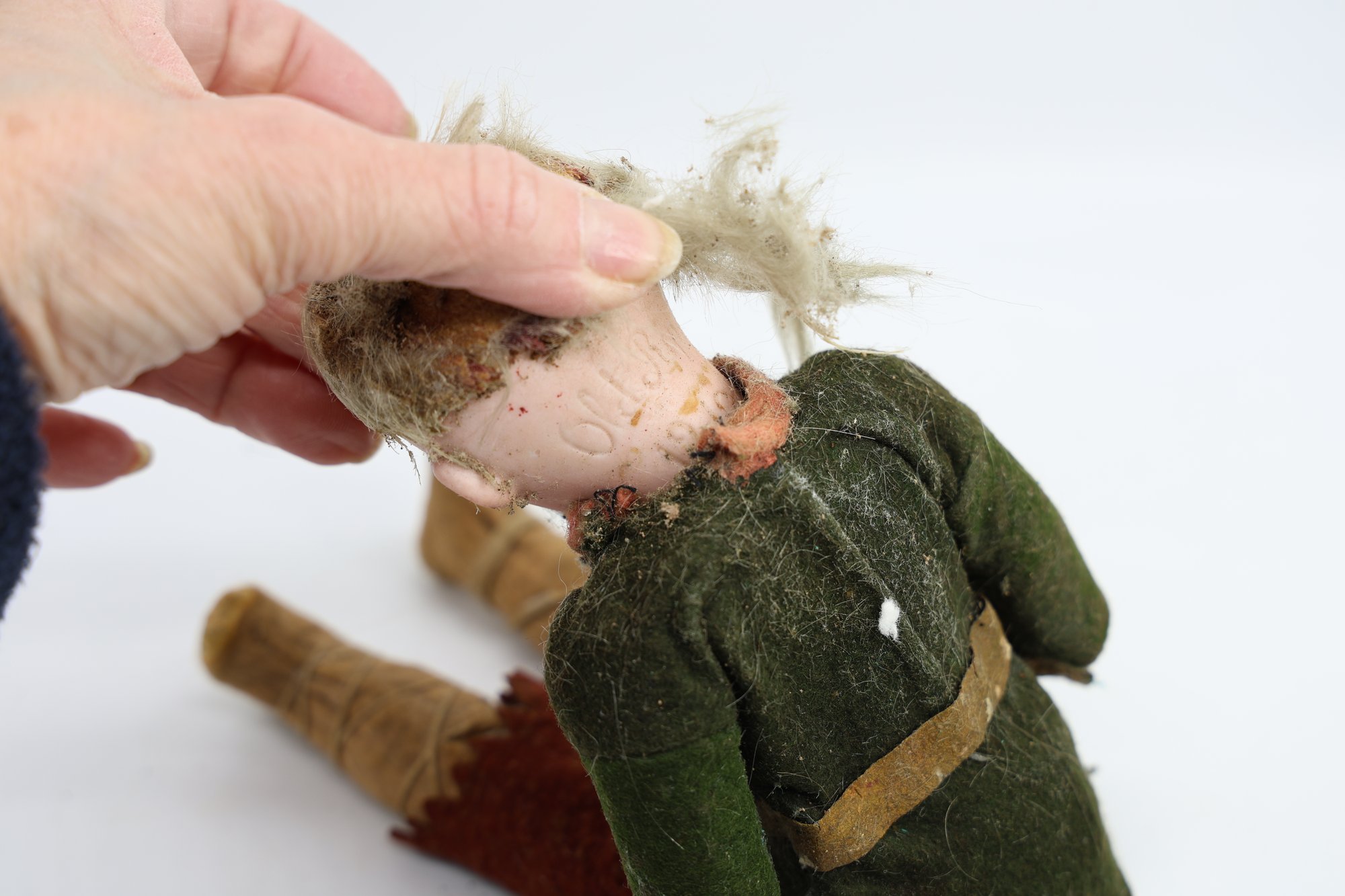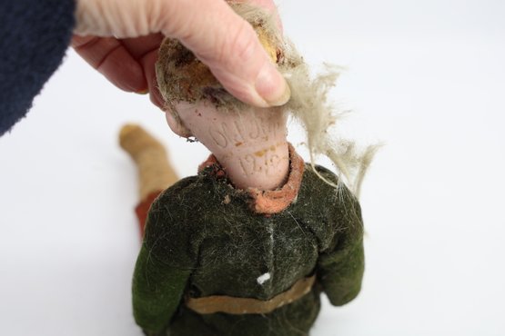 "Old Rip" on back of neck 12/0- bisque head painted. Felt clothing . Mohair worn.