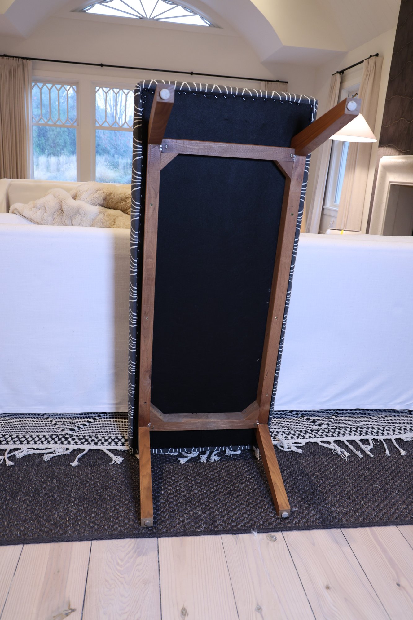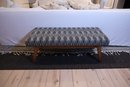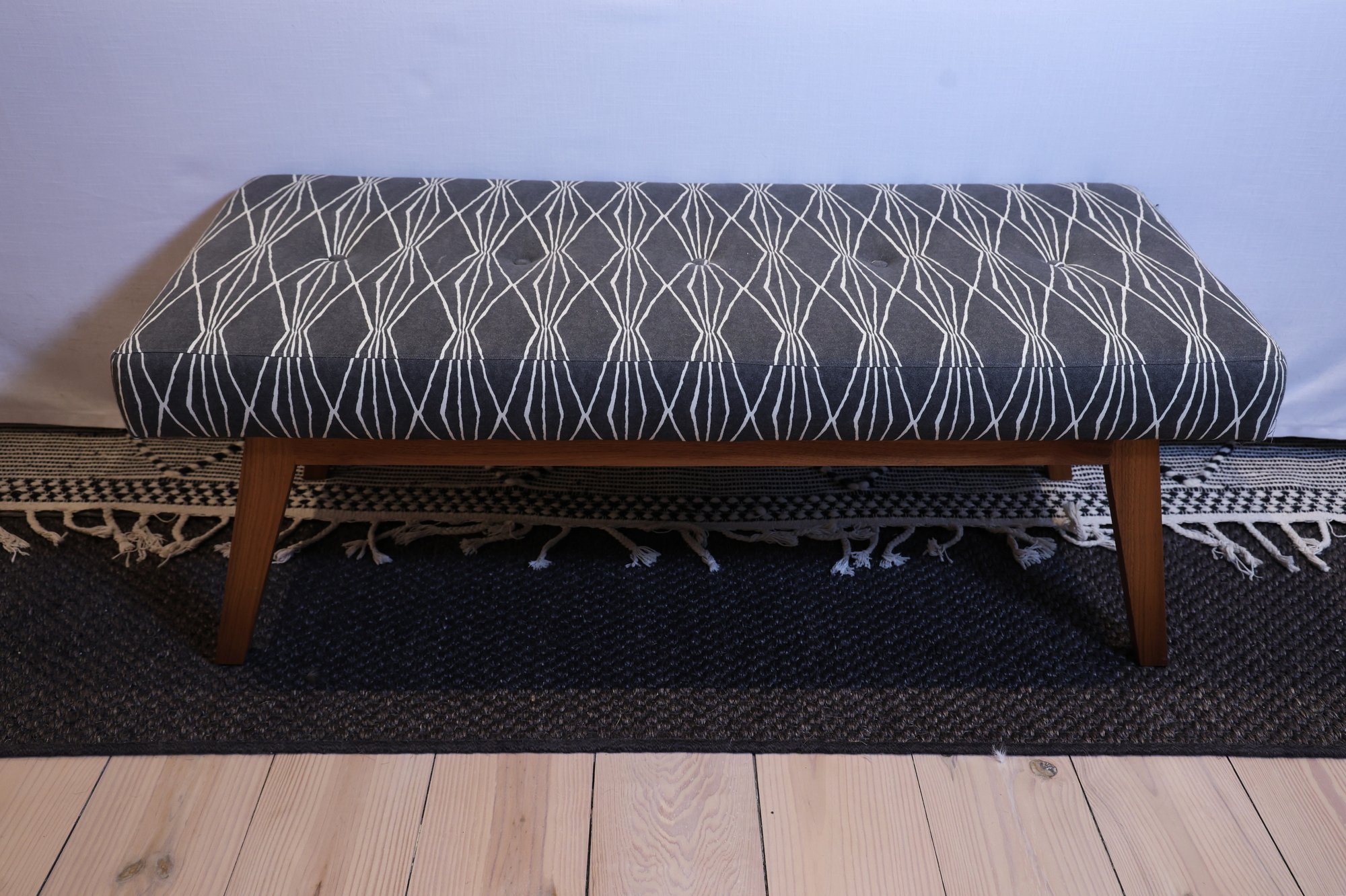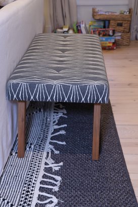 Lovely One kings lane Upholstered bench in the image of mid Century modern style featuring gray and white tufted fabric with white geometric pattern and light wood angled legs. Nice condition and sturdy