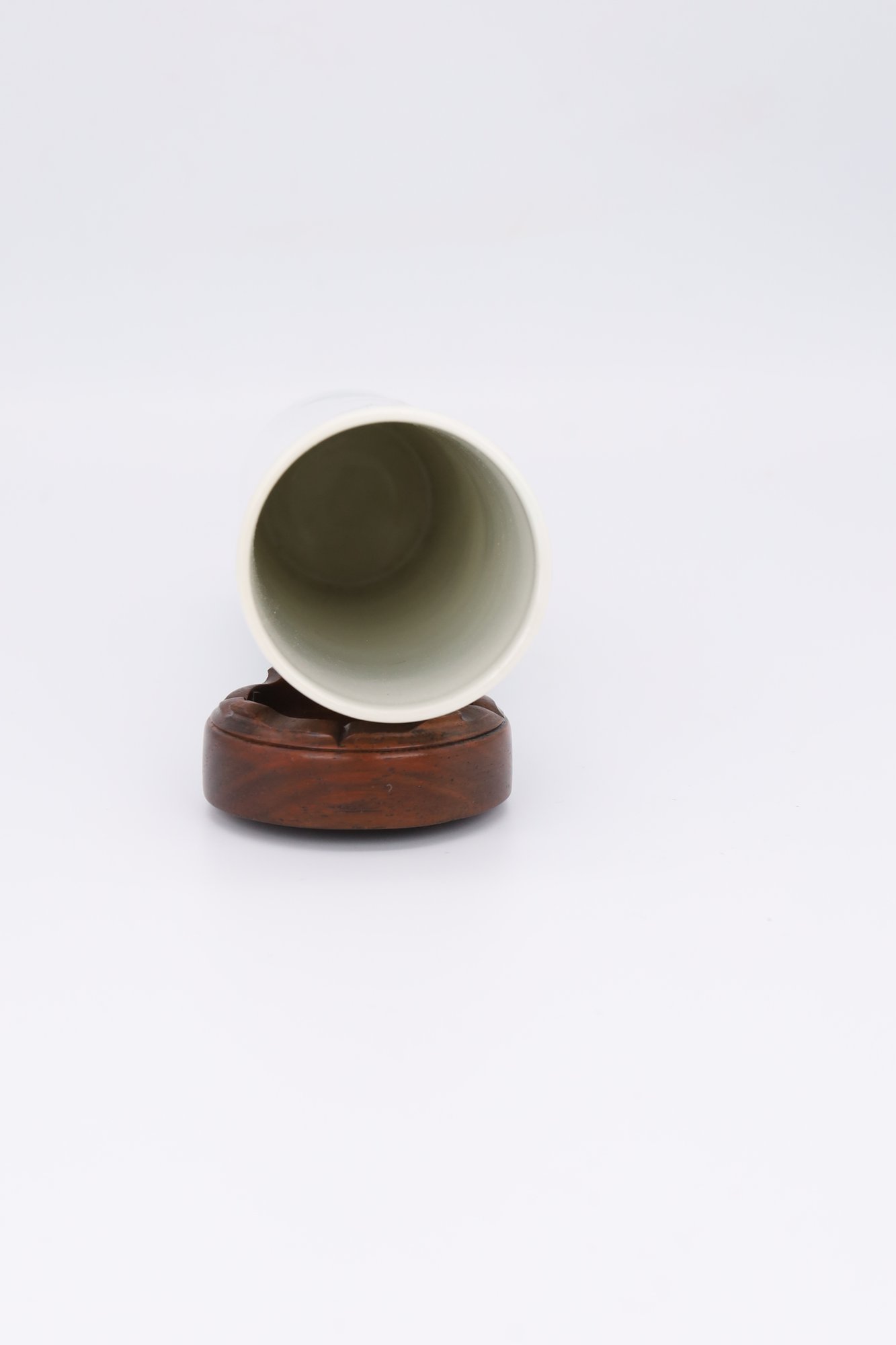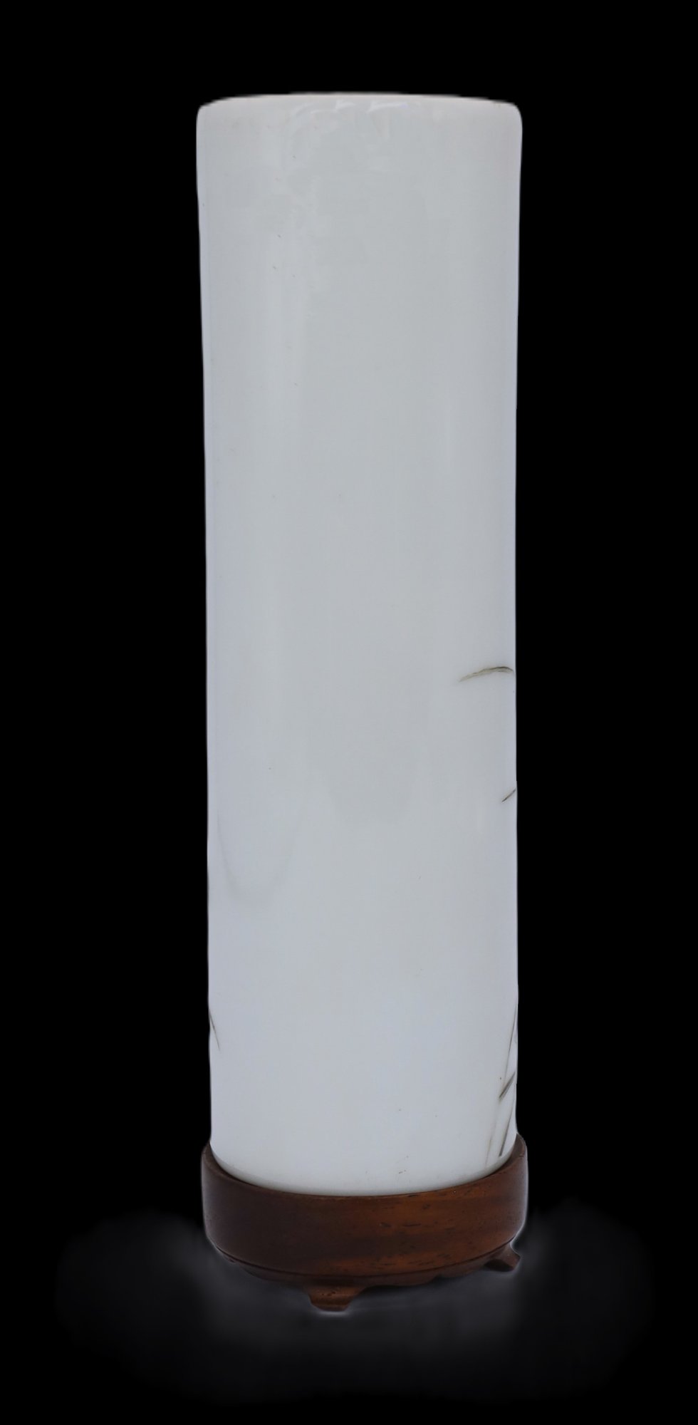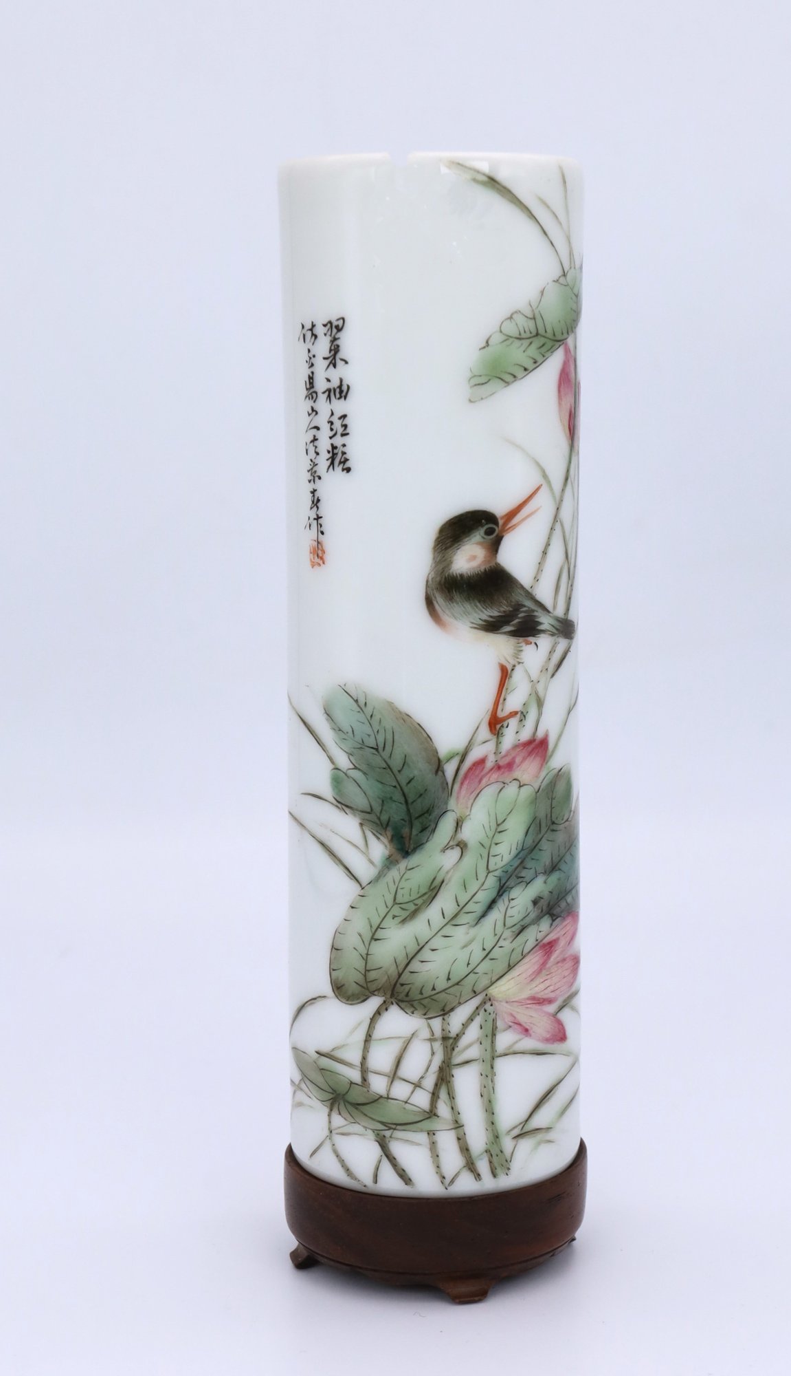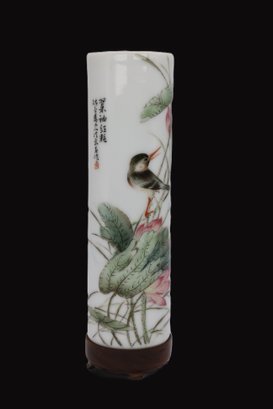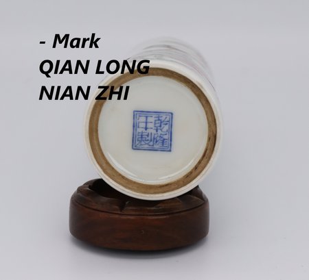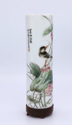 Qian Long Nian Zhi Chinese Vase With Wooden Base - hand painted with a bird, flowers and base characters in a square in Blue.