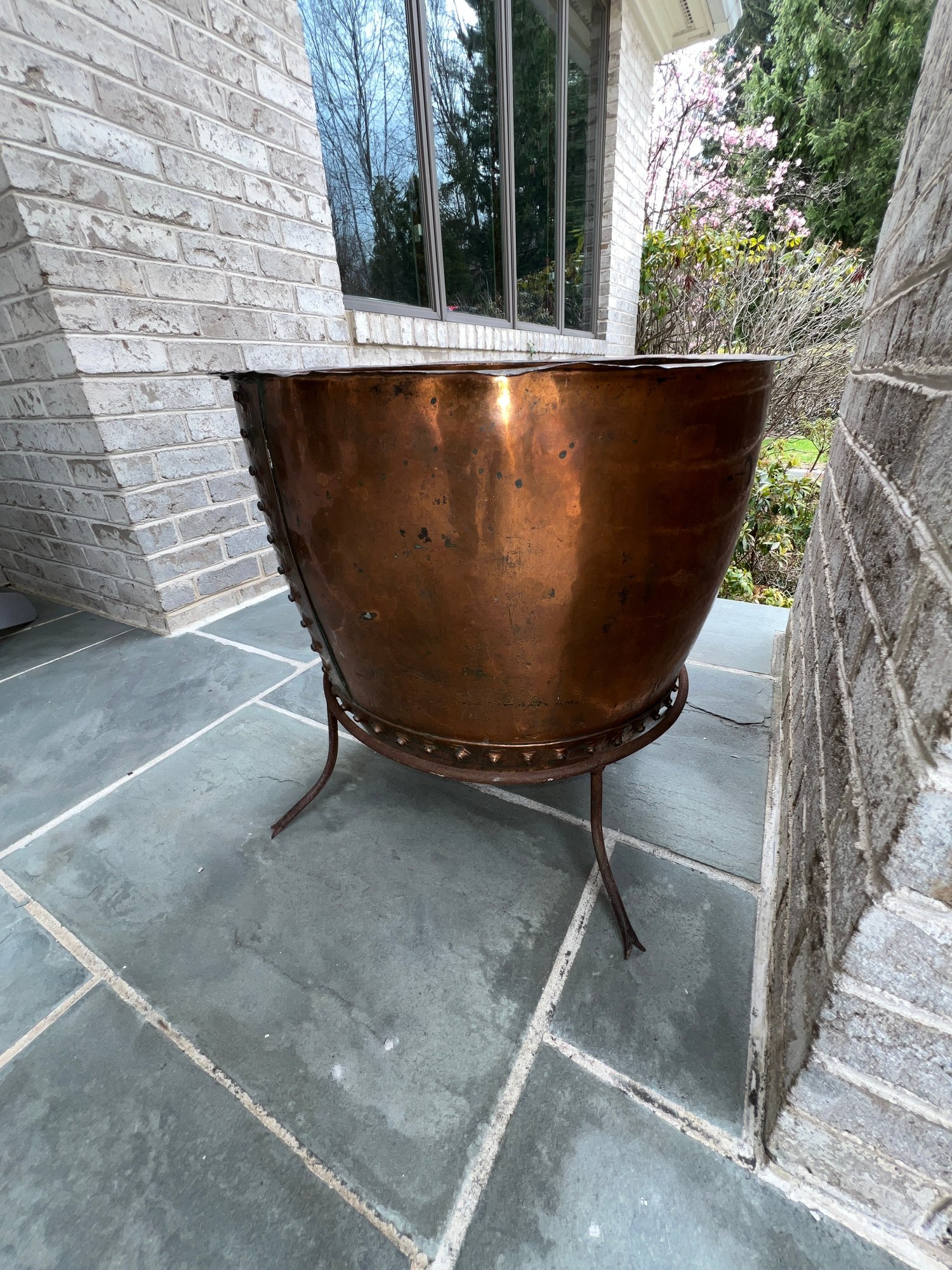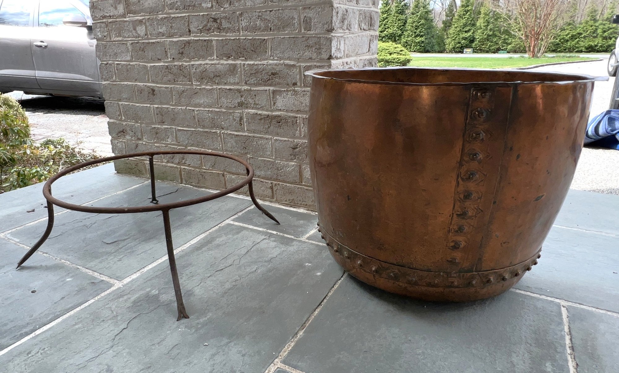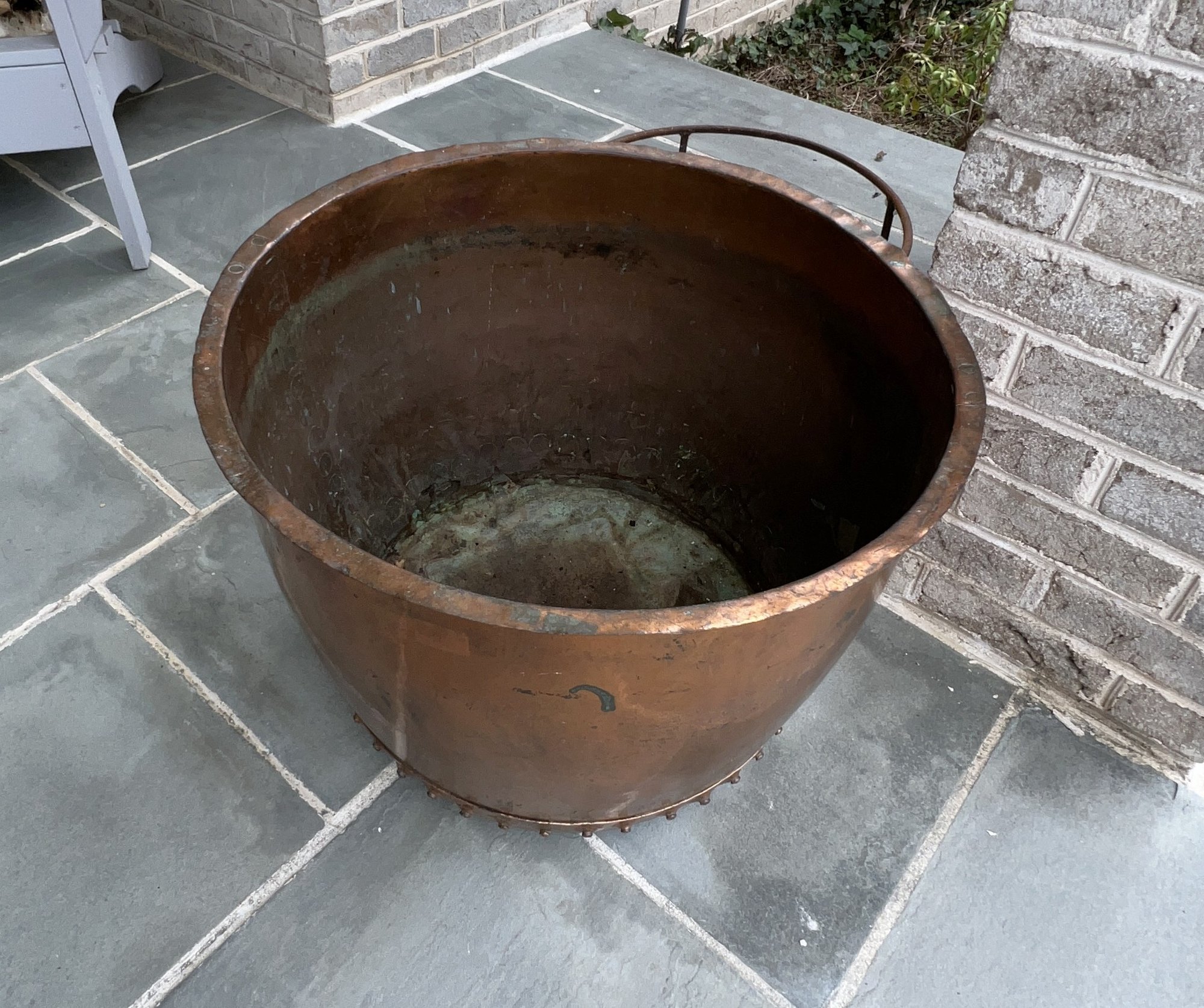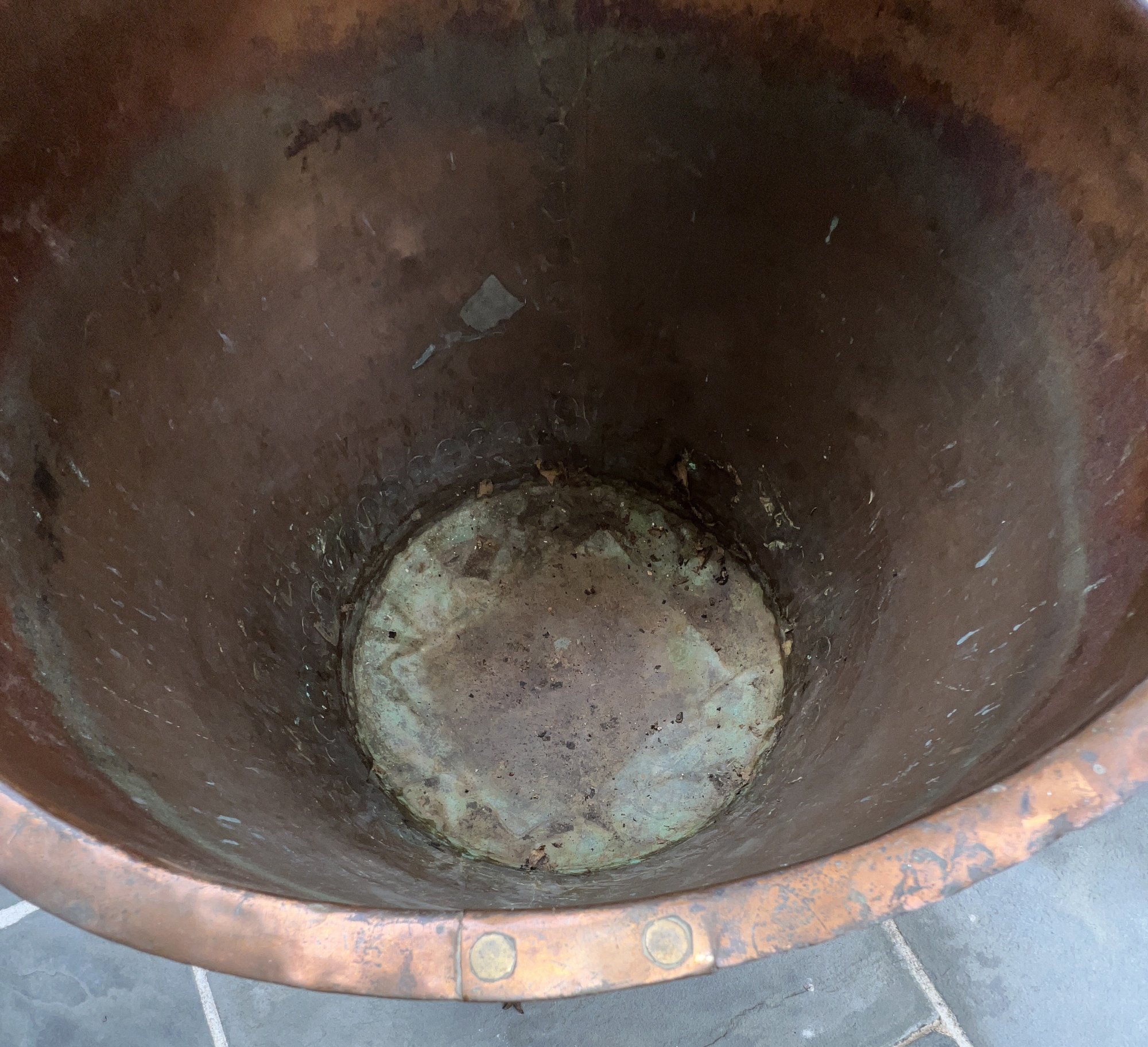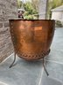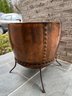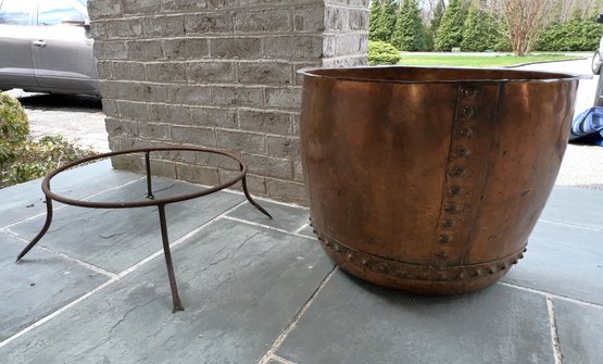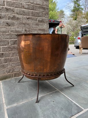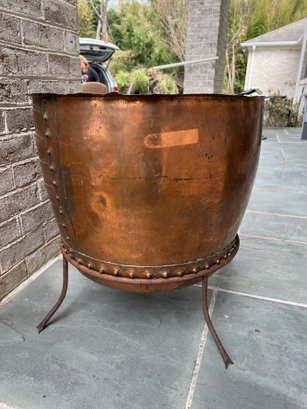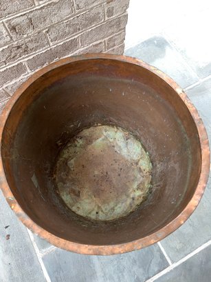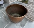 Stunning, rare antique copper cauldron /planter. Late 19th to early 20th C. The piece is suitable and sturdy for potted plants or for use as firewood near the fireplace. England. This can be polished for a bright copper look, or, if you like, the patina can be left to achieve a nice verde look.
