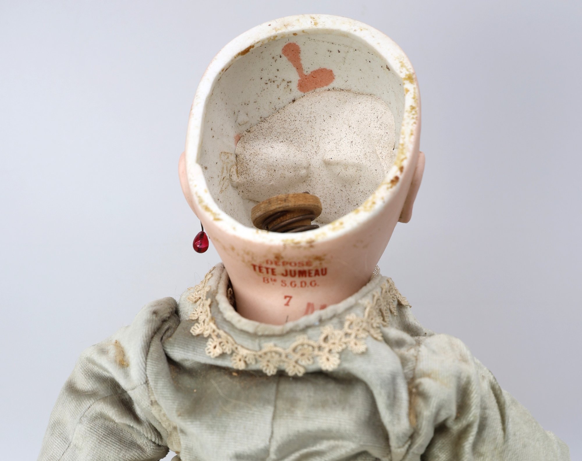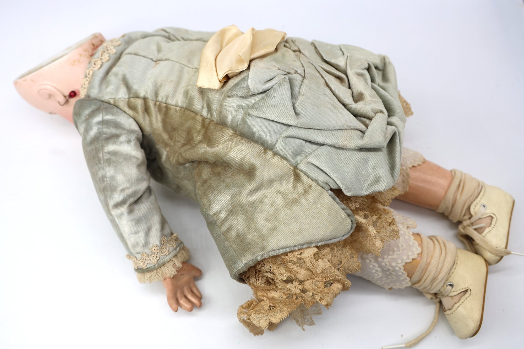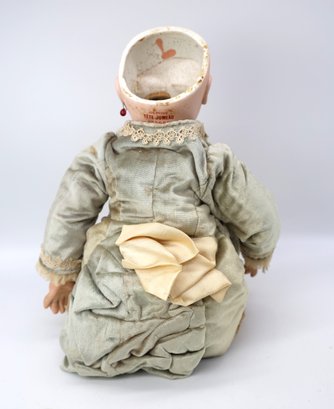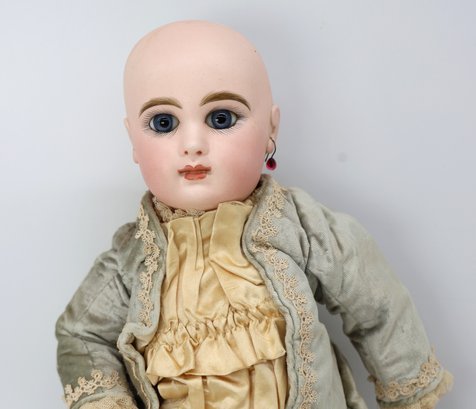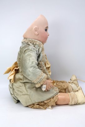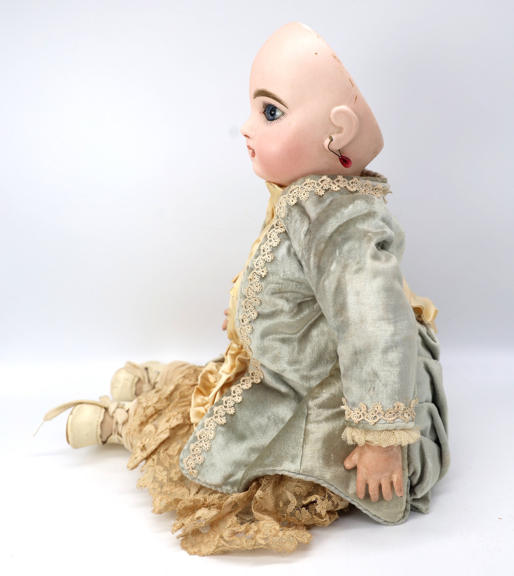 Marked on neck this beautiful French bisque head with blue eyes, painted upper & lower lashes, thick brow, pierced earrings, Fully jointed body . Blond mohair wig in loose curls with cork plate.