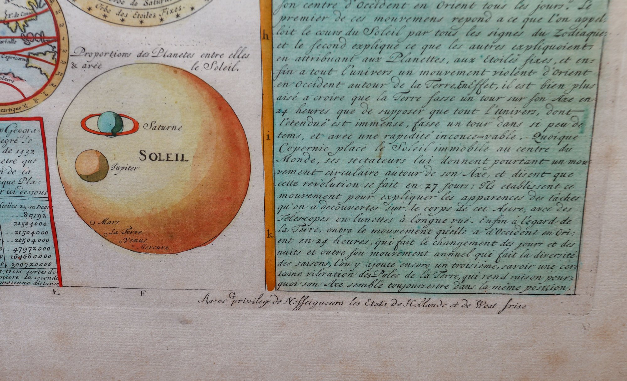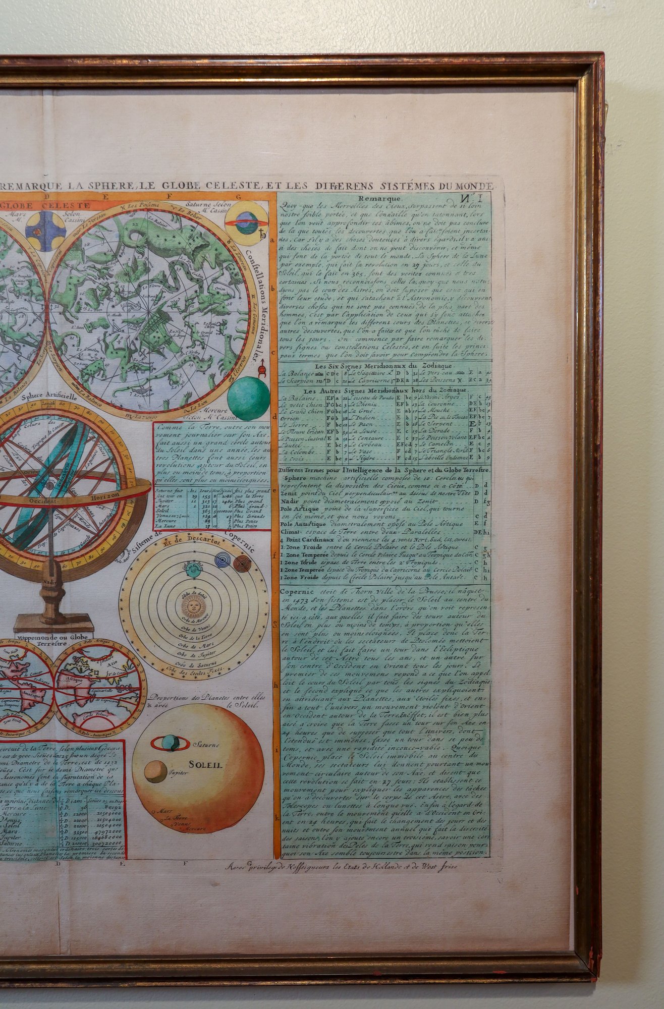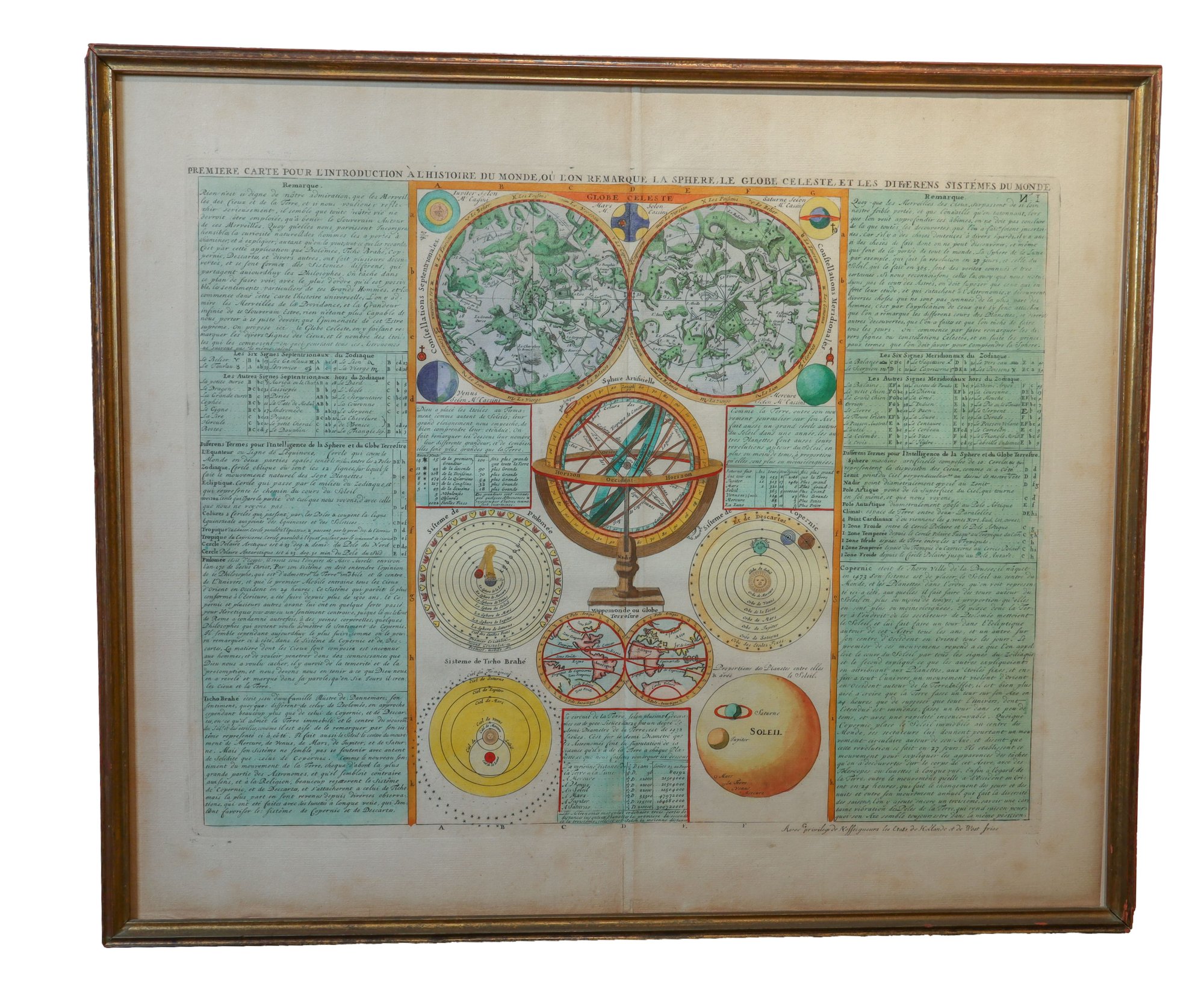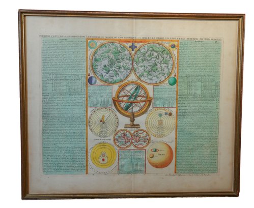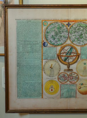 This is a hand-painted map called "La Globe Celeste" which displays a double hemisphere view of the world. It also includes 11 astronomical representations with explanations on both the right and left sides. The map features a celestial hemisphere chart, armillary sphere, a small double hemisphere terrestrial map, as well as diagrams of the solar system and planets. This map is finely crafted, in great condition, and was created by Henri Abraham Chatelain (1684-1743). It is framed and measures 21.25" x 18".