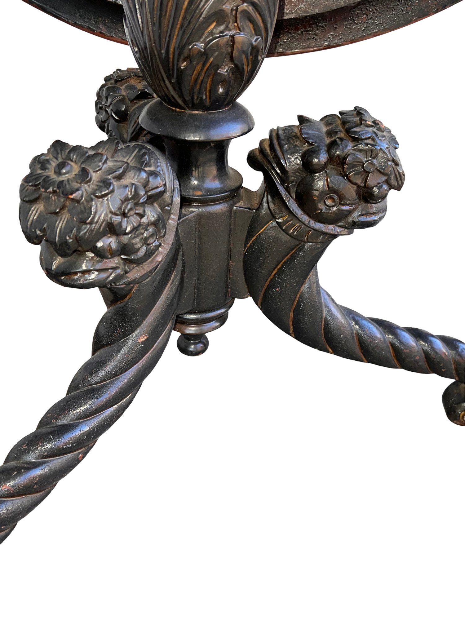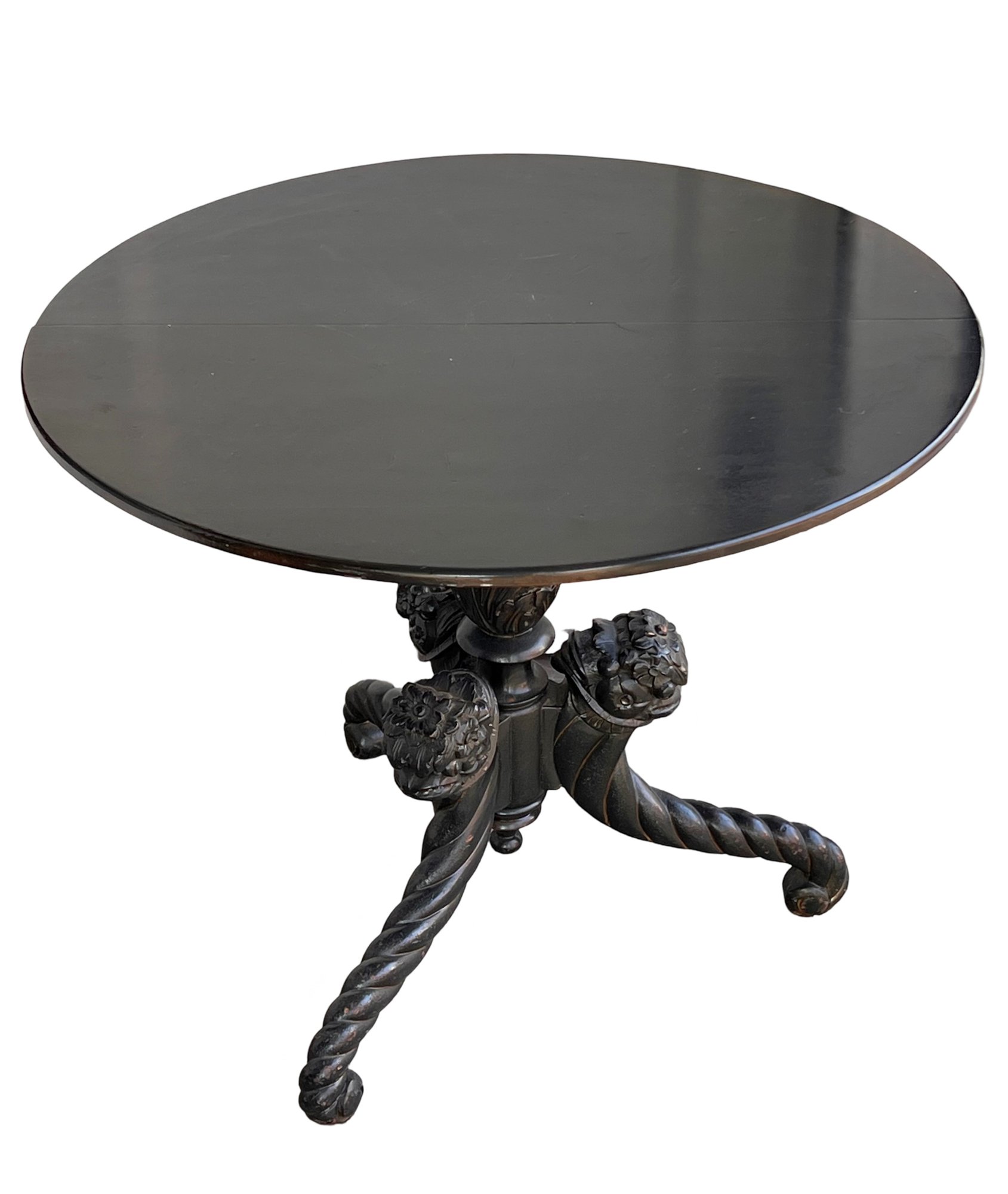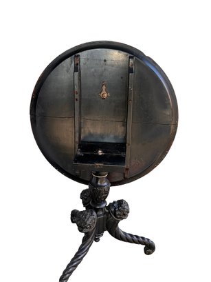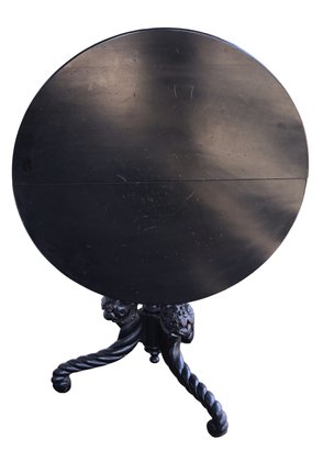Rare early 19thC tilt top table with twisted wood base and 3 foo dog heads. so extremely unique.