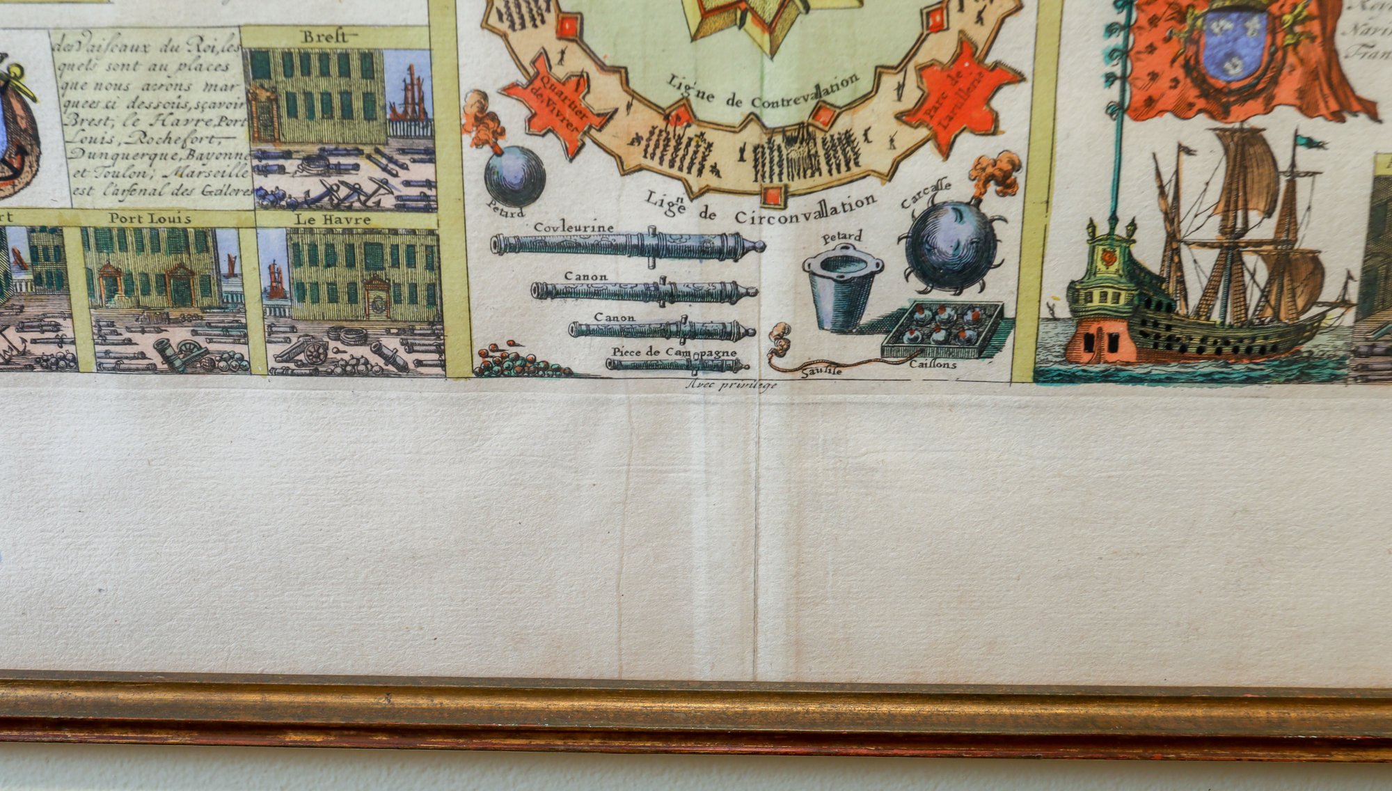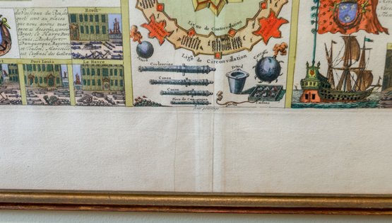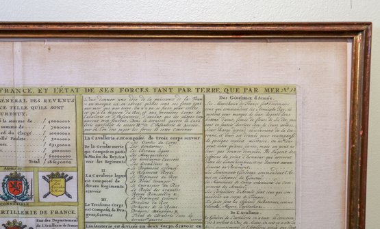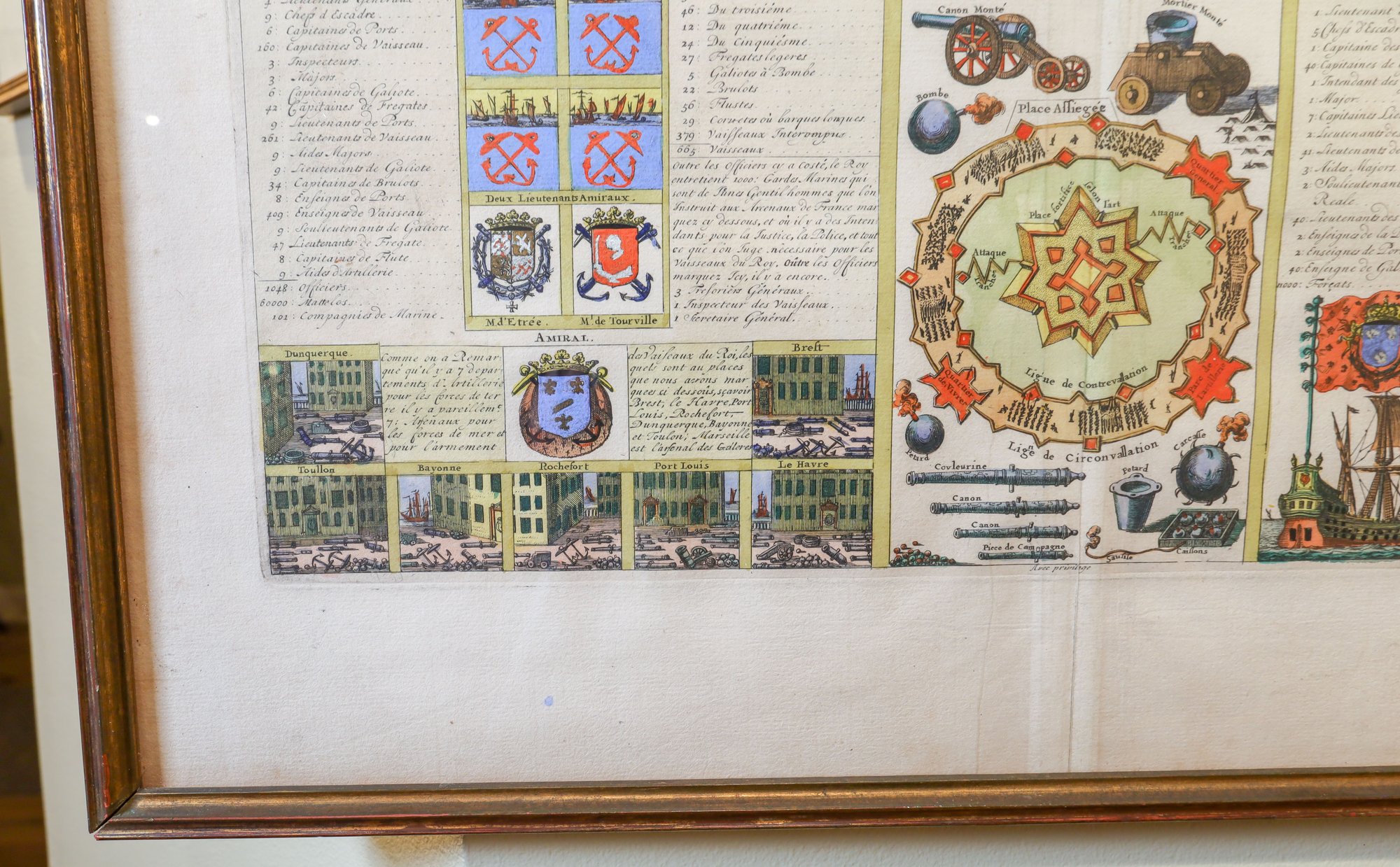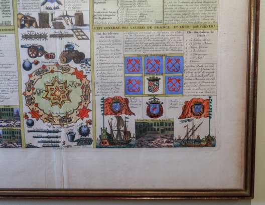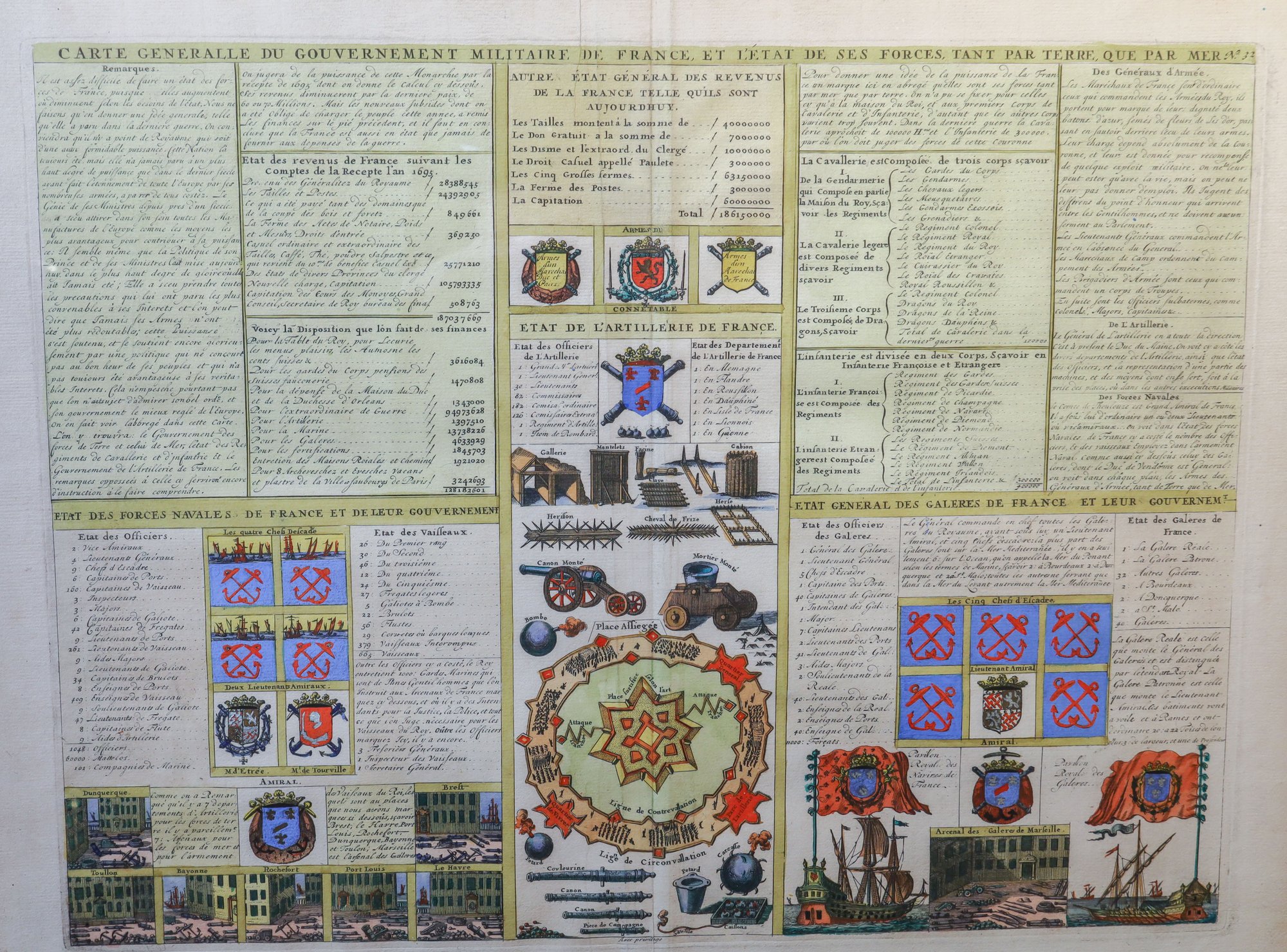 Rare 17th-18th century military map of France displaying revenues, artillery, ships, and infanterie, on paper, framed and in nice condition. From a private collection in NYC and measures 18" x 21".