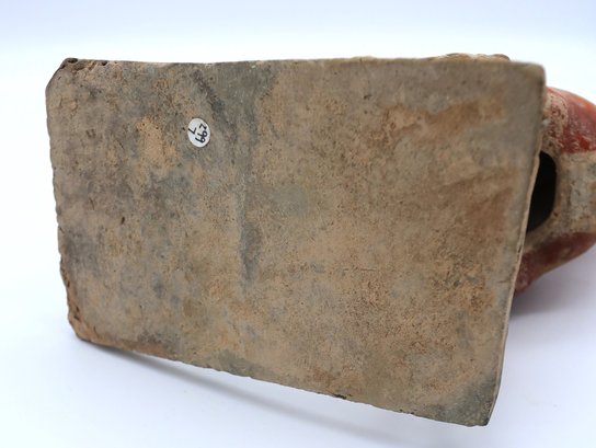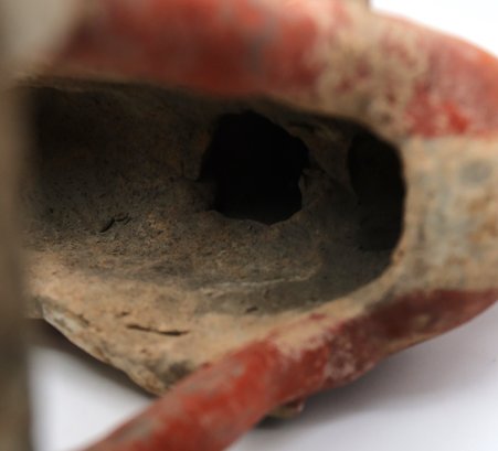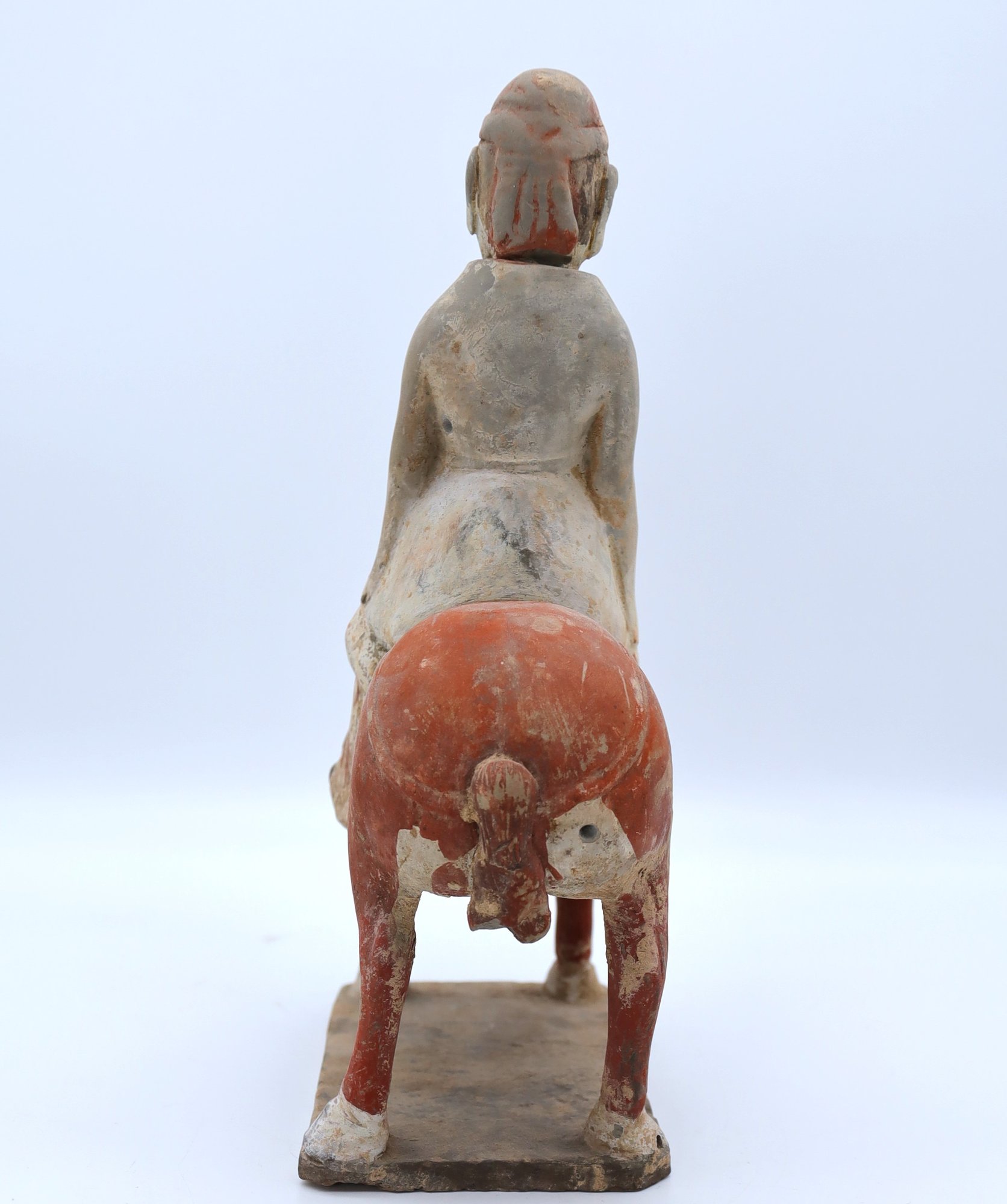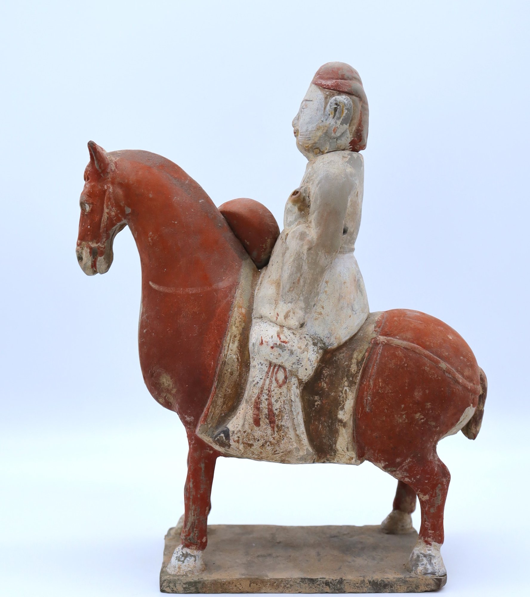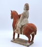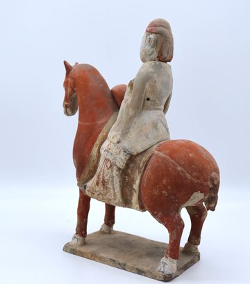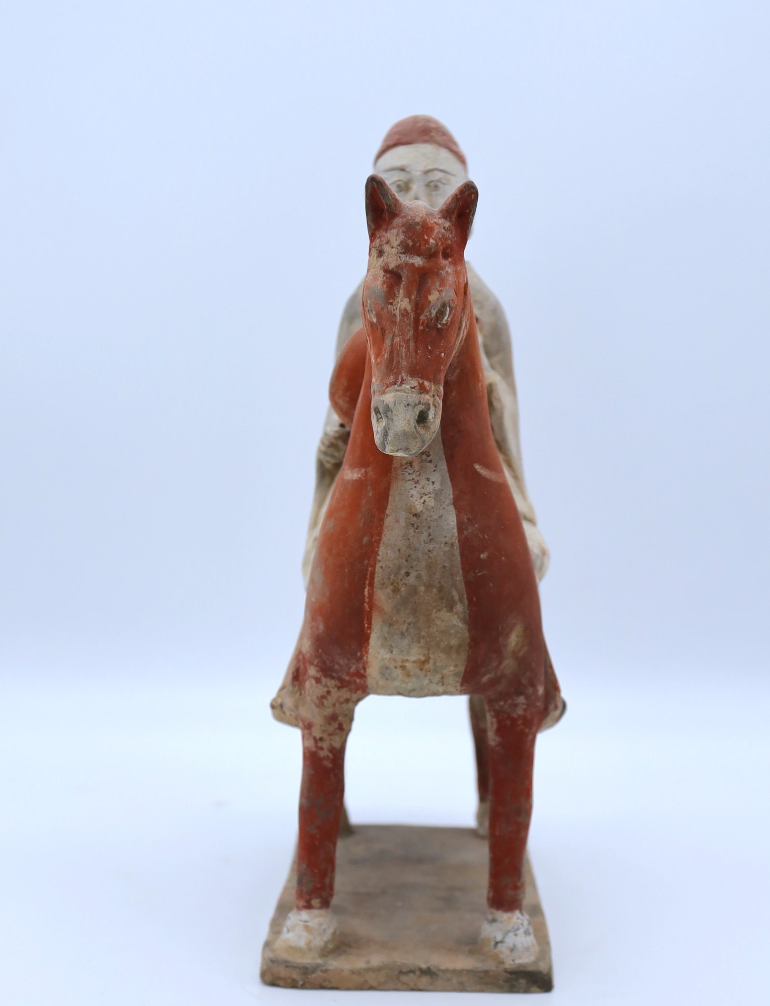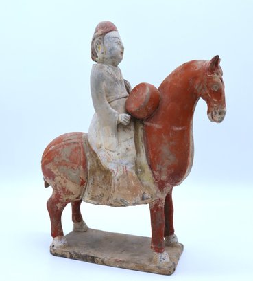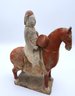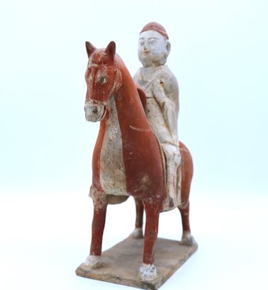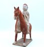 Rare pottery horse and rider holding a drum painted in a red pigment