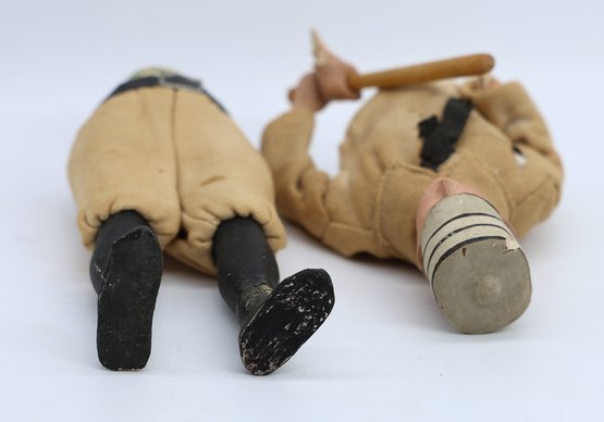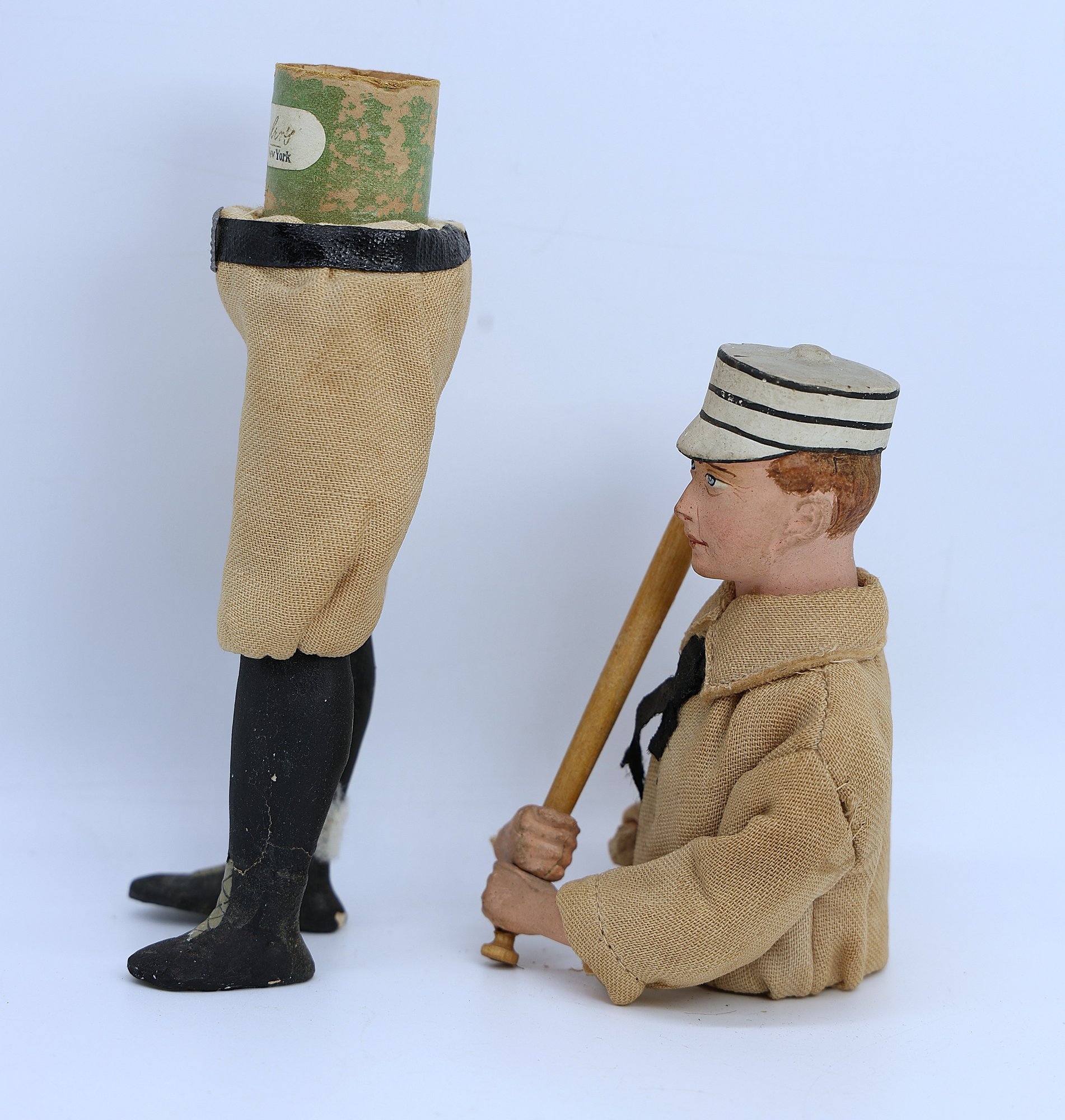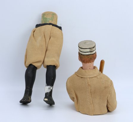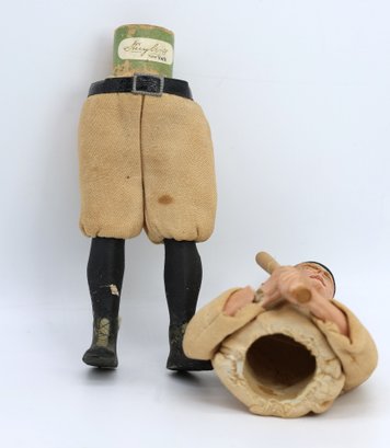Everything is amazing and original, just like the players of his era. His leather belt and buckle tie around the waist, and the pillbox hat has a knick but is otherwise nice. The wrist has damage and needs repair, and the legs show some paint loss, but overall, it’s not bad for being over 125 years old! It's hard to find another! Candy is not in the container. RARE! see photos for wear -