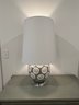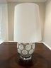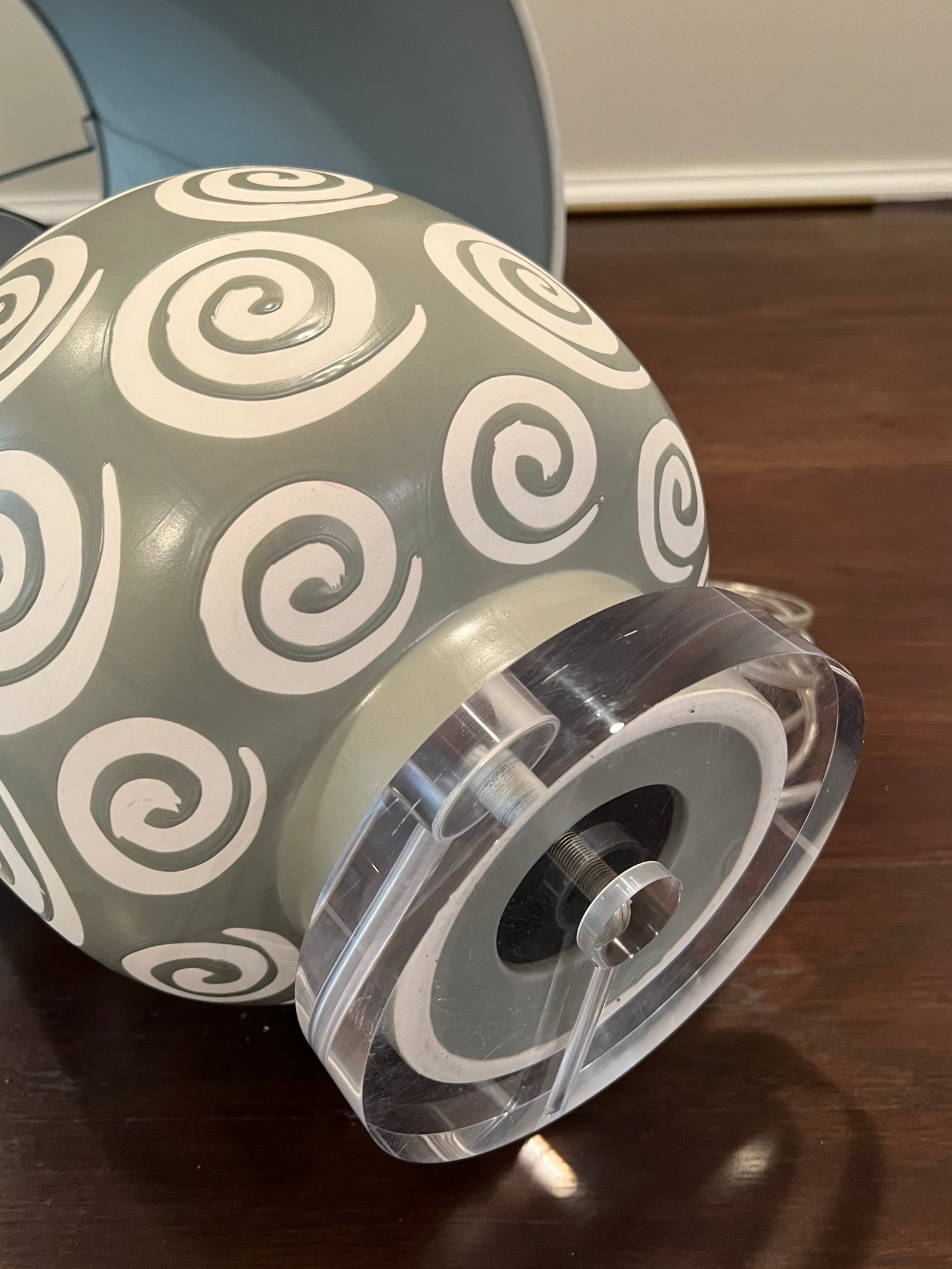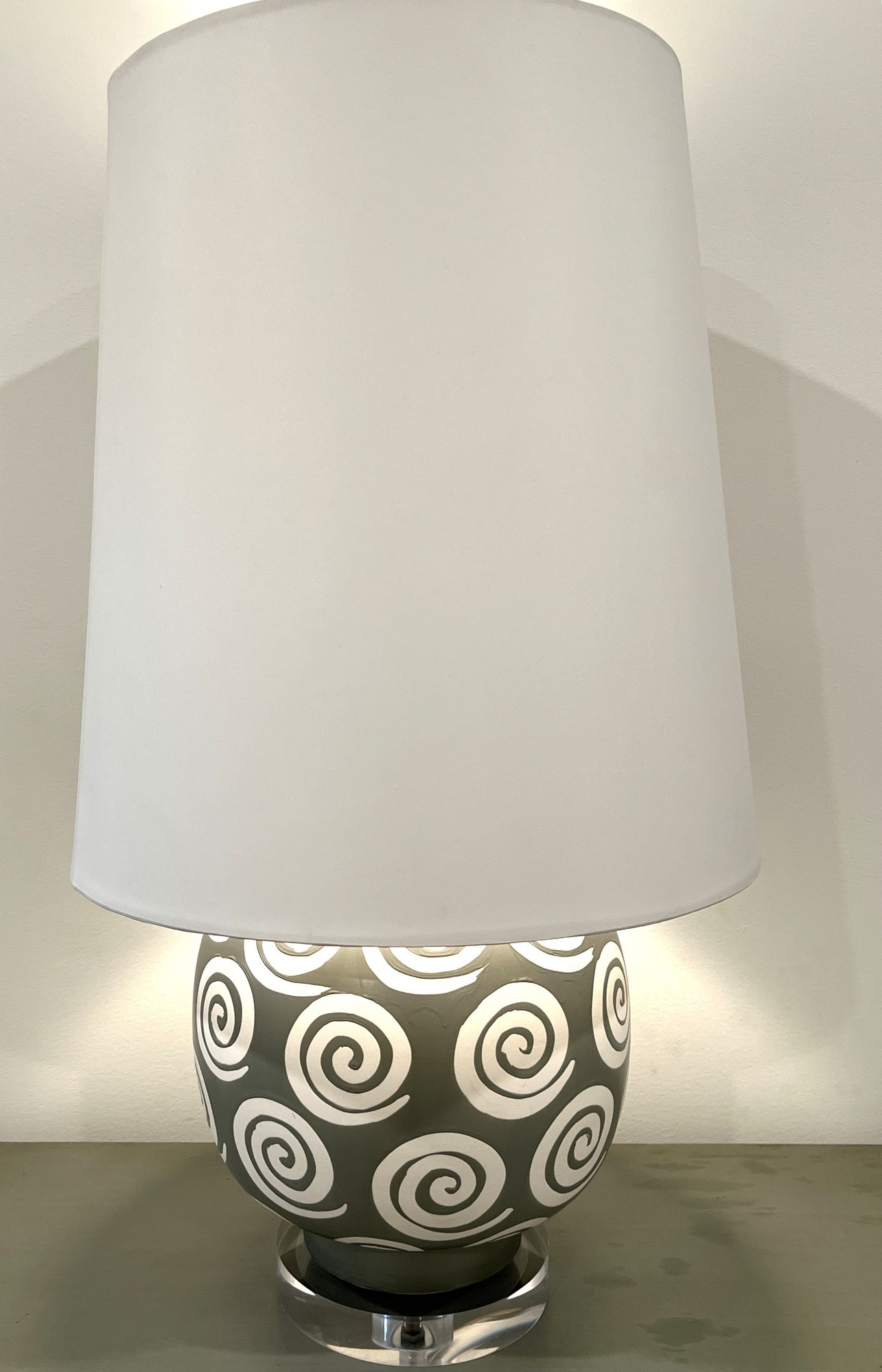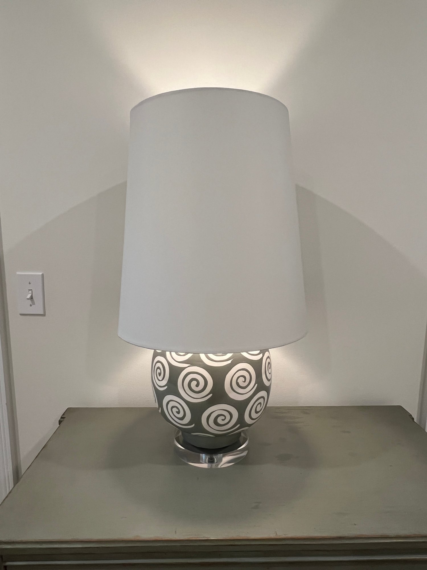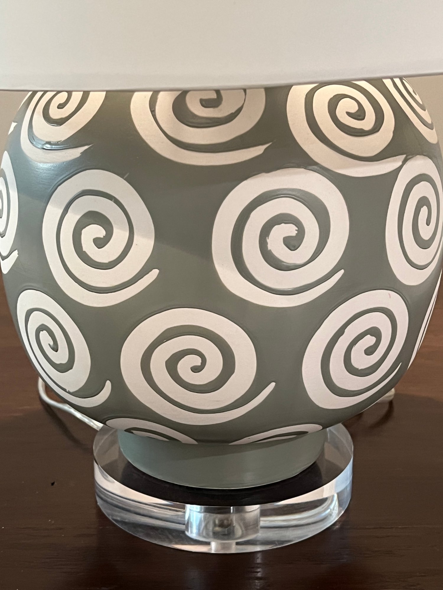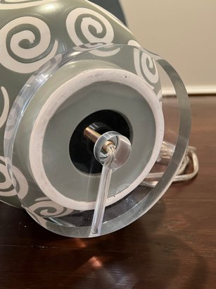 Green with white swirl pattern on acrylic base table lamp with white shade.