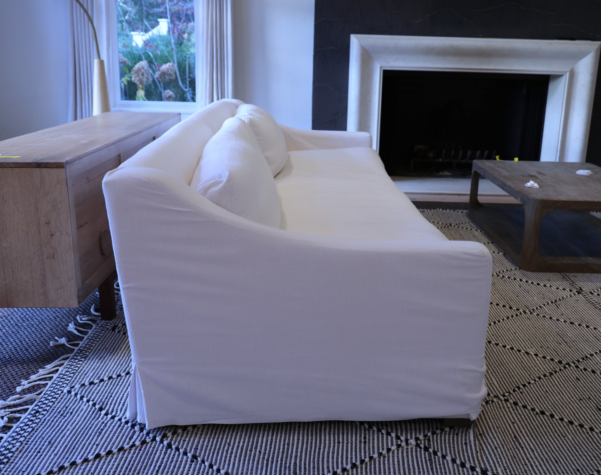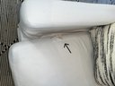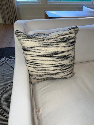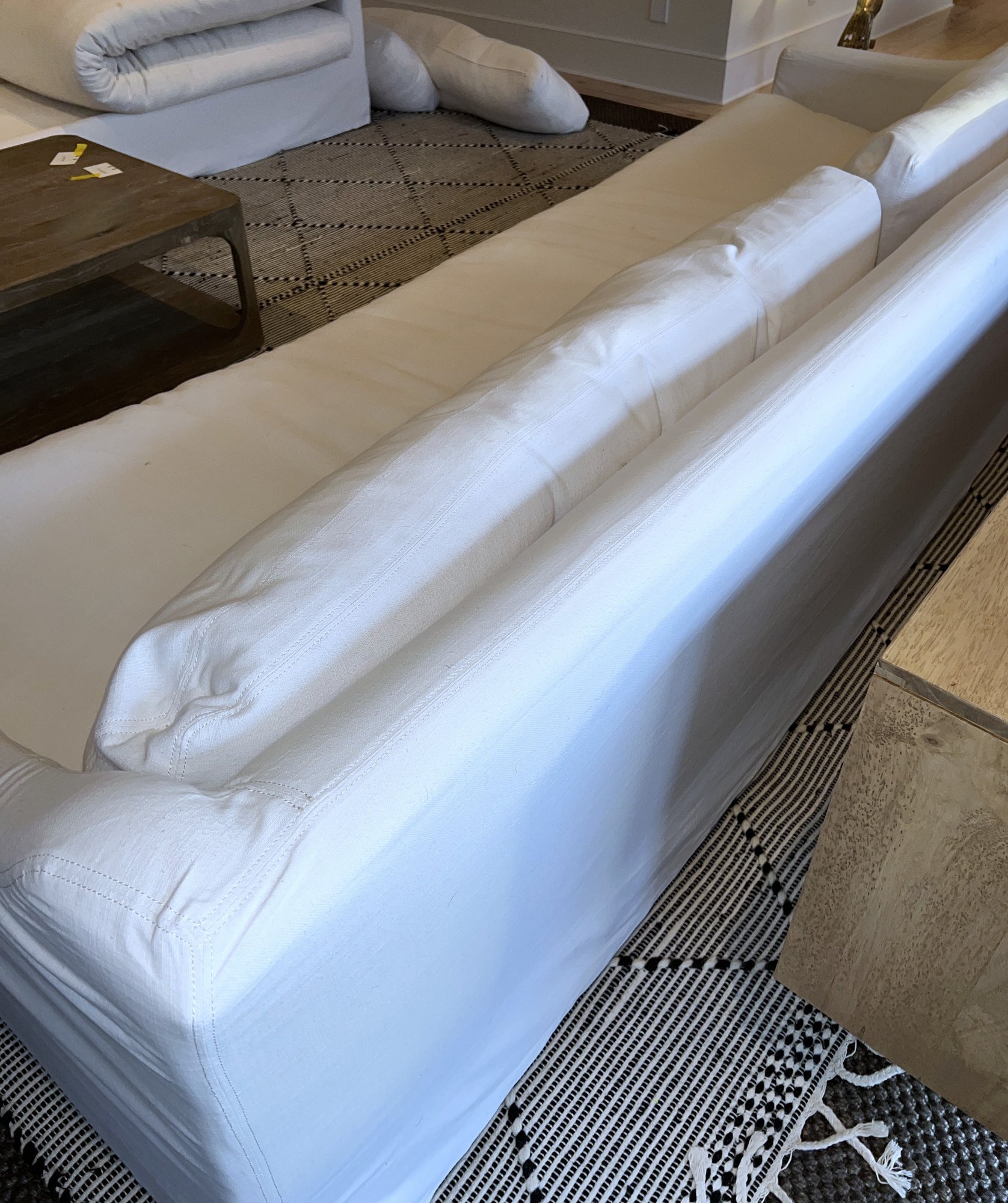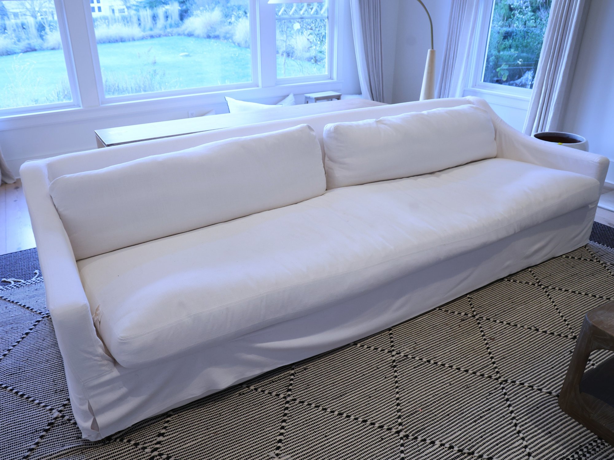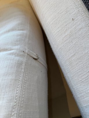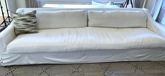 Restoration Hardware 10' Custom-made -Belgian classic slope arm. Fabric is perennial's classic linen weave in white. Filled with Down feathers for extreme comfort. Lot 20065 matches. All zippered pillows and sofa can be washed.