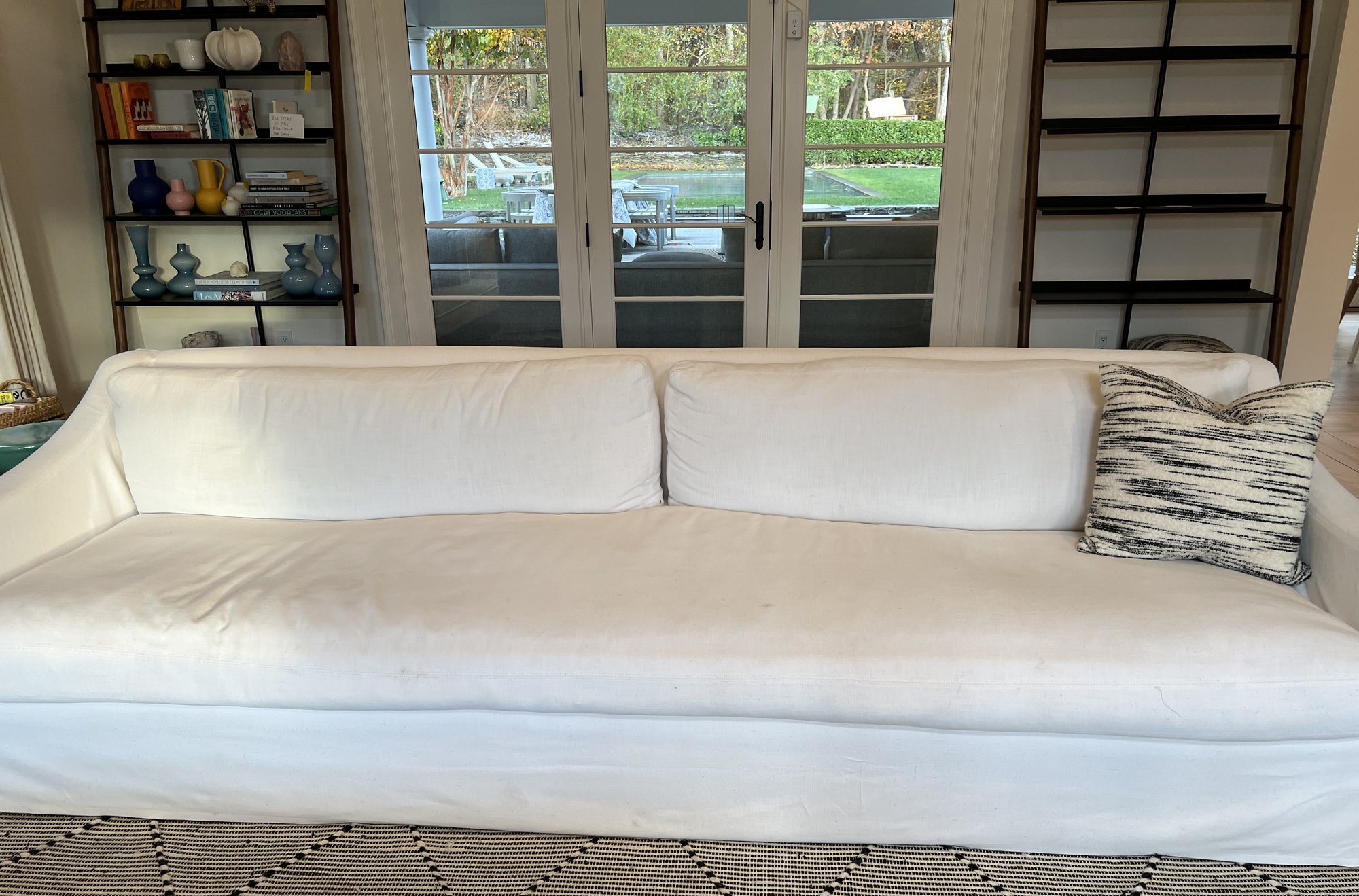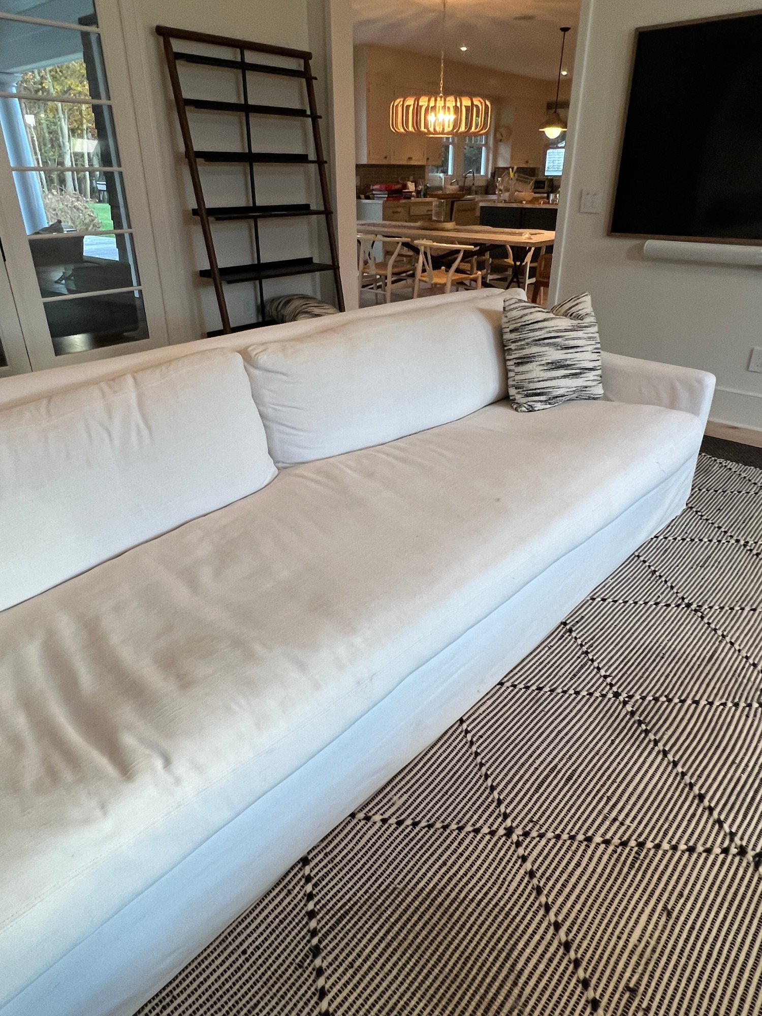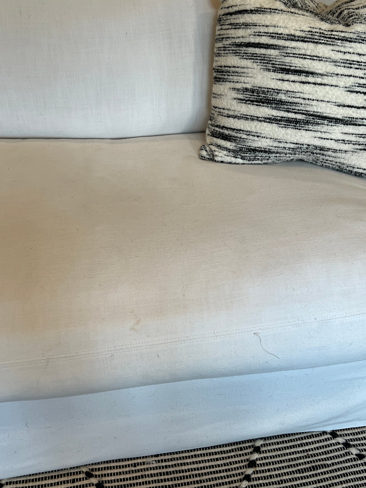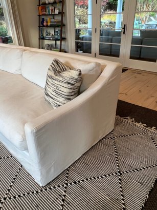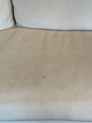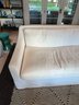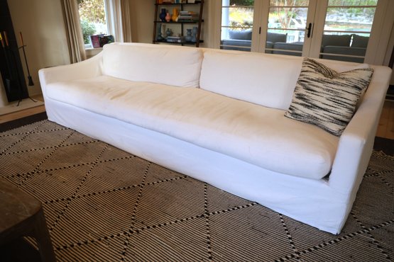 Restoration Hardware 10' Custom-made -Belgian classic slope arm. Fabric is perennial's classic linen weave in white. Filled with Down feathers for extreme comfort. Lot 20065 matches. All zippered pillows and sofa can be washed.