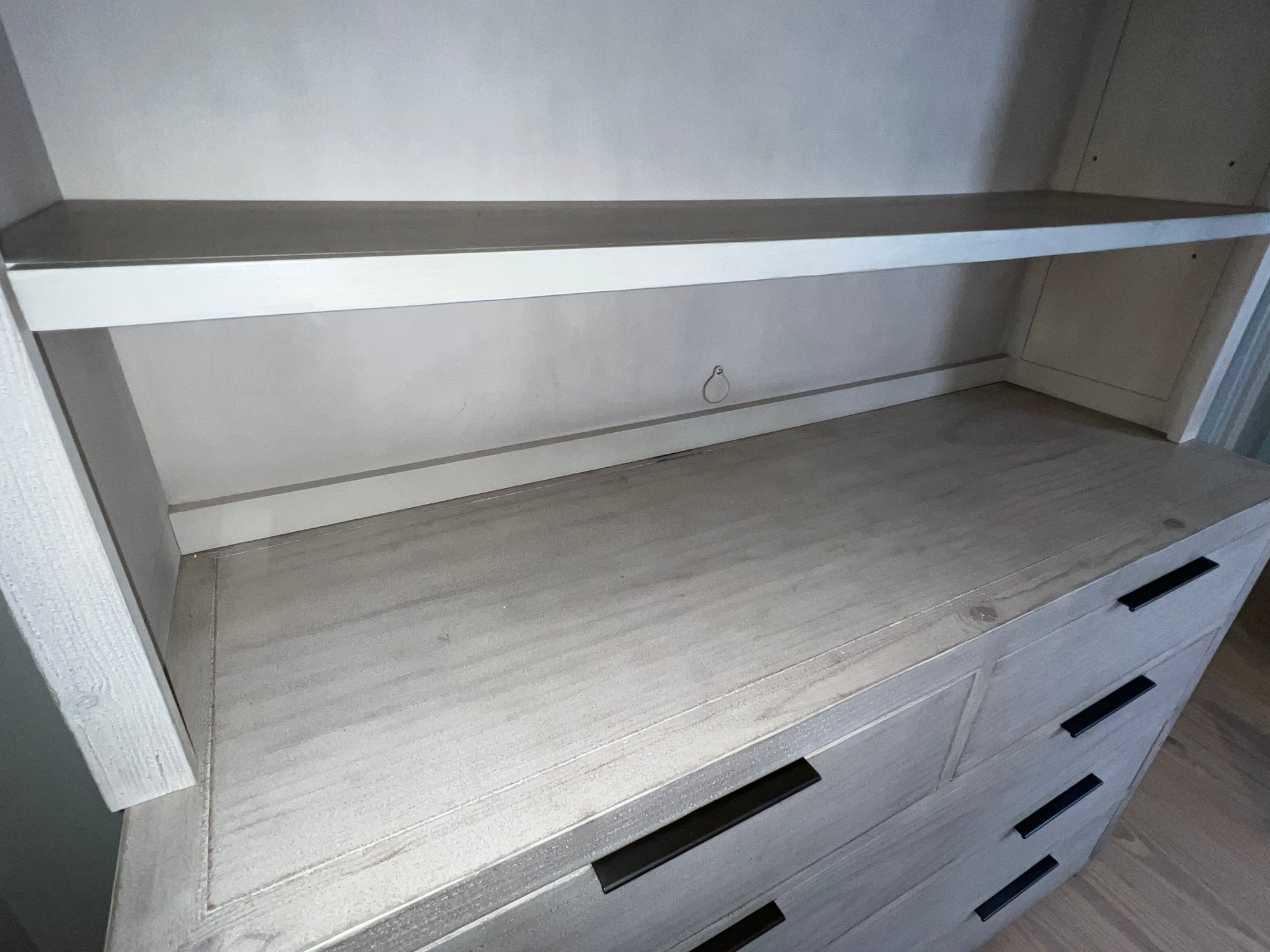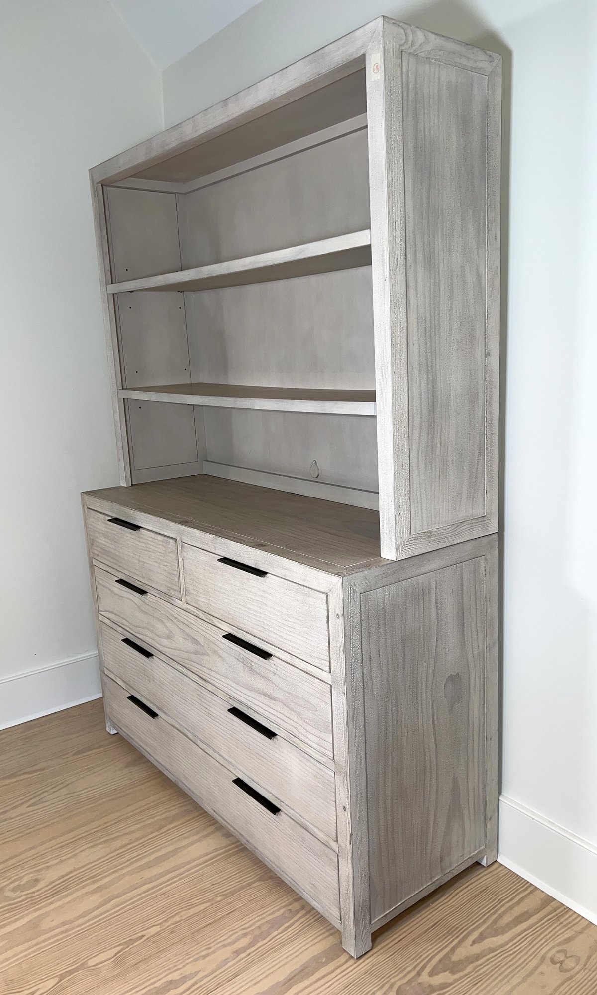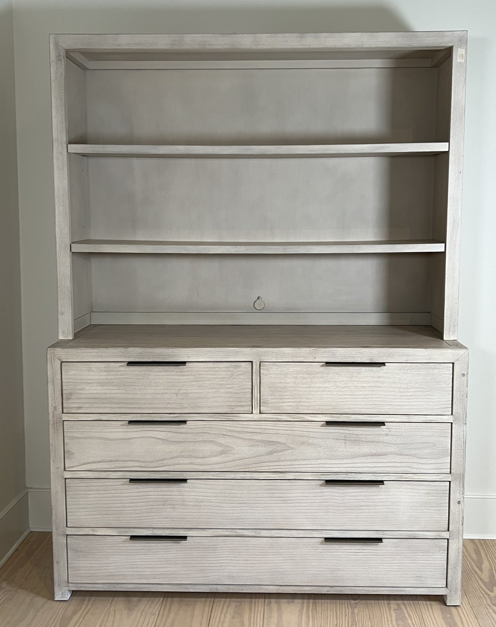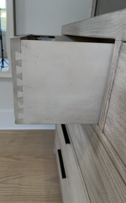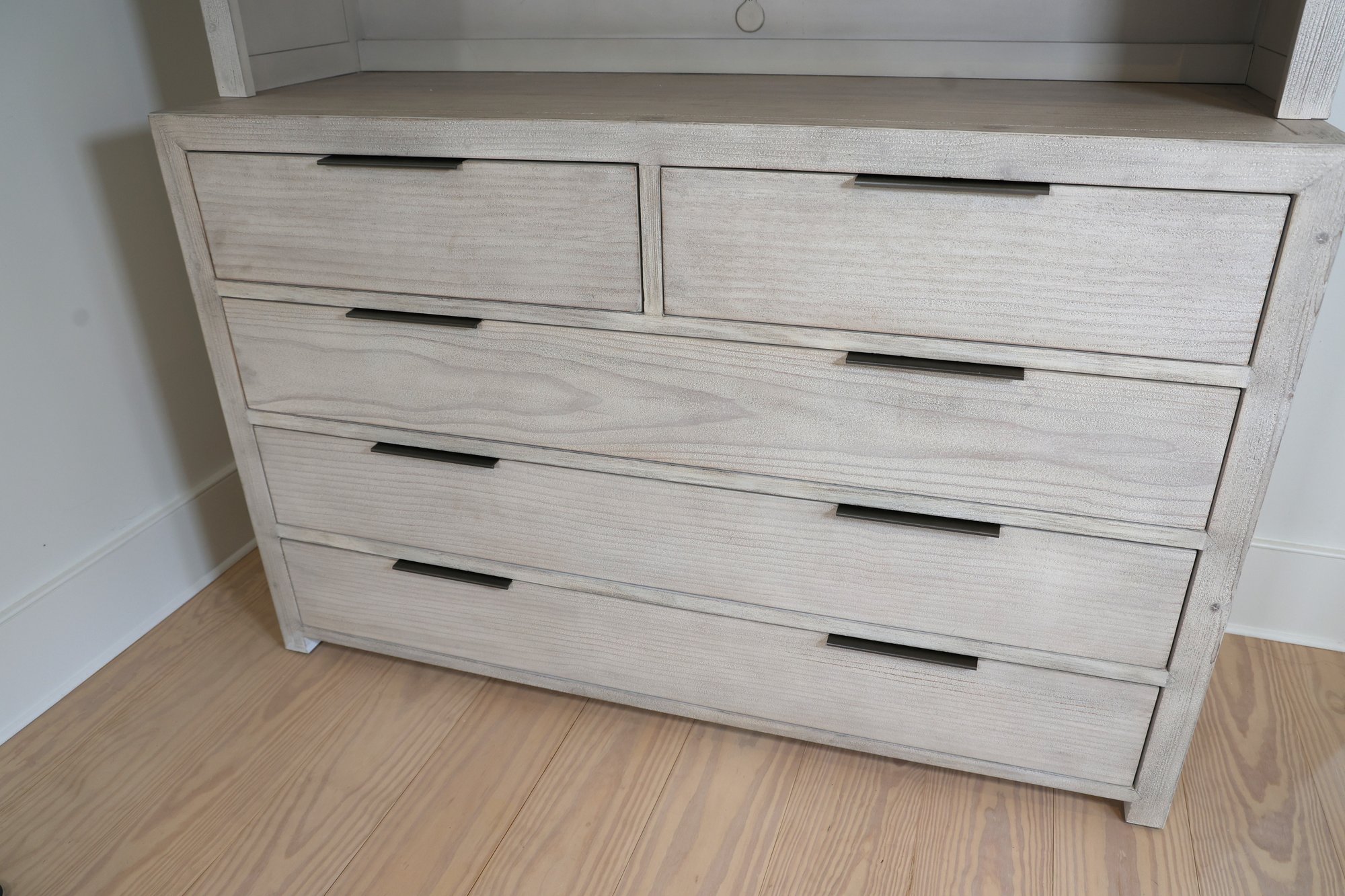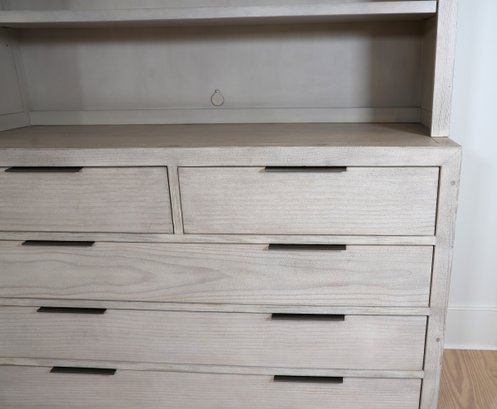 Restoration Hardware Teen Laguna wide two-piece dresser/Hutch in whitewash natural. Hand finished to achieve an authentic , timeworn texture. This has a drifted appearance which highlights the woods natural grains. Contemporary with clean lines, flat front drawers and slim pulls. Nice condition