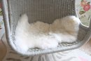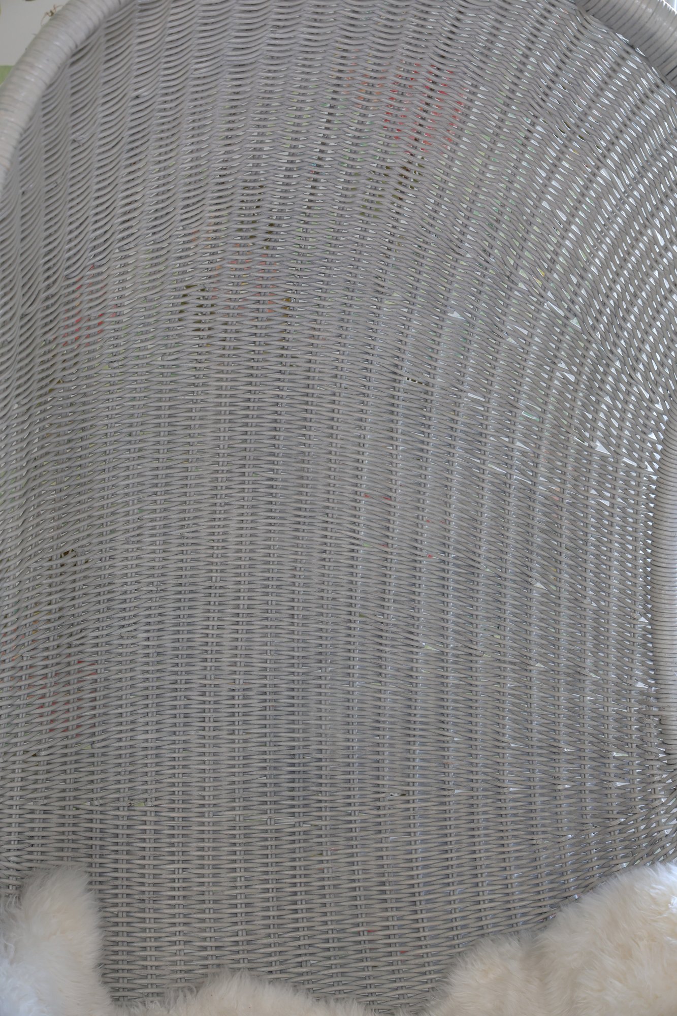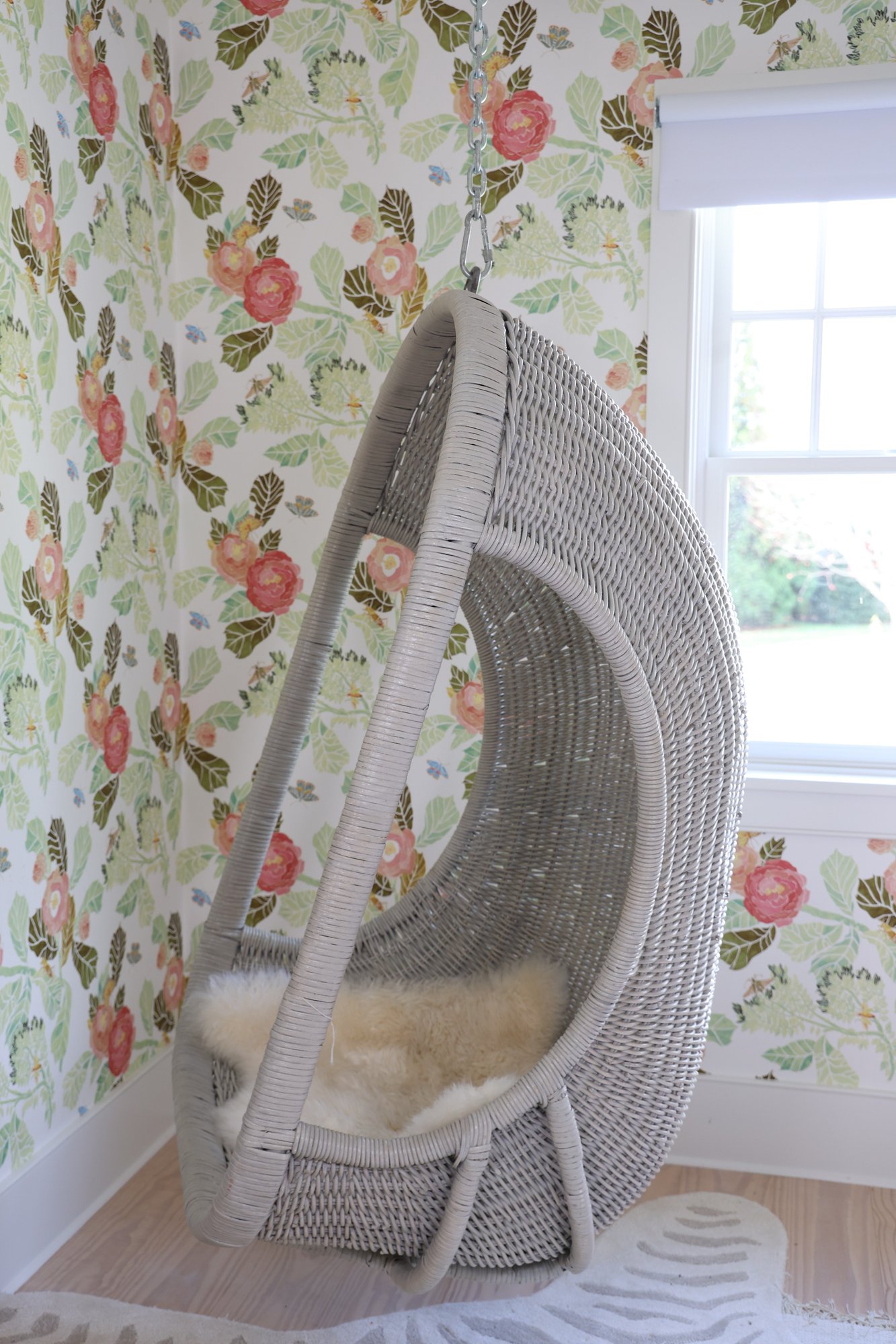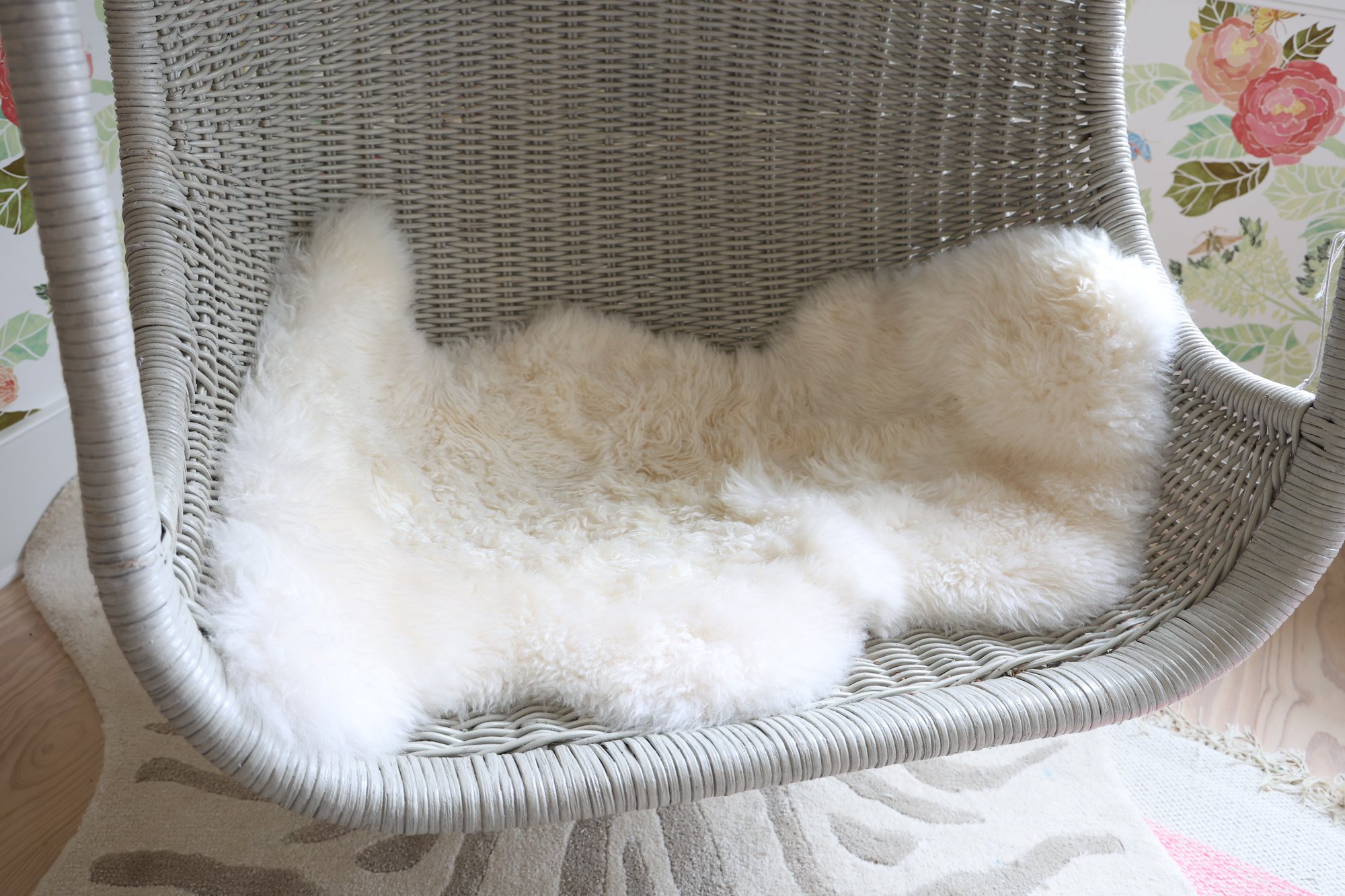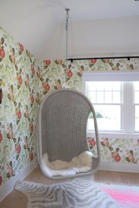 Restoration Hardware wicker swing perfect for nursery, kids, teen or porch! Generously proportioned. Very comfortable with great quality. Chain comes with the chair but ceiling hook does not. Comes with a sheepskin rug
