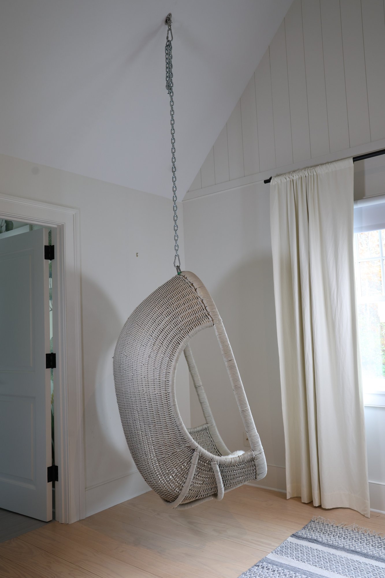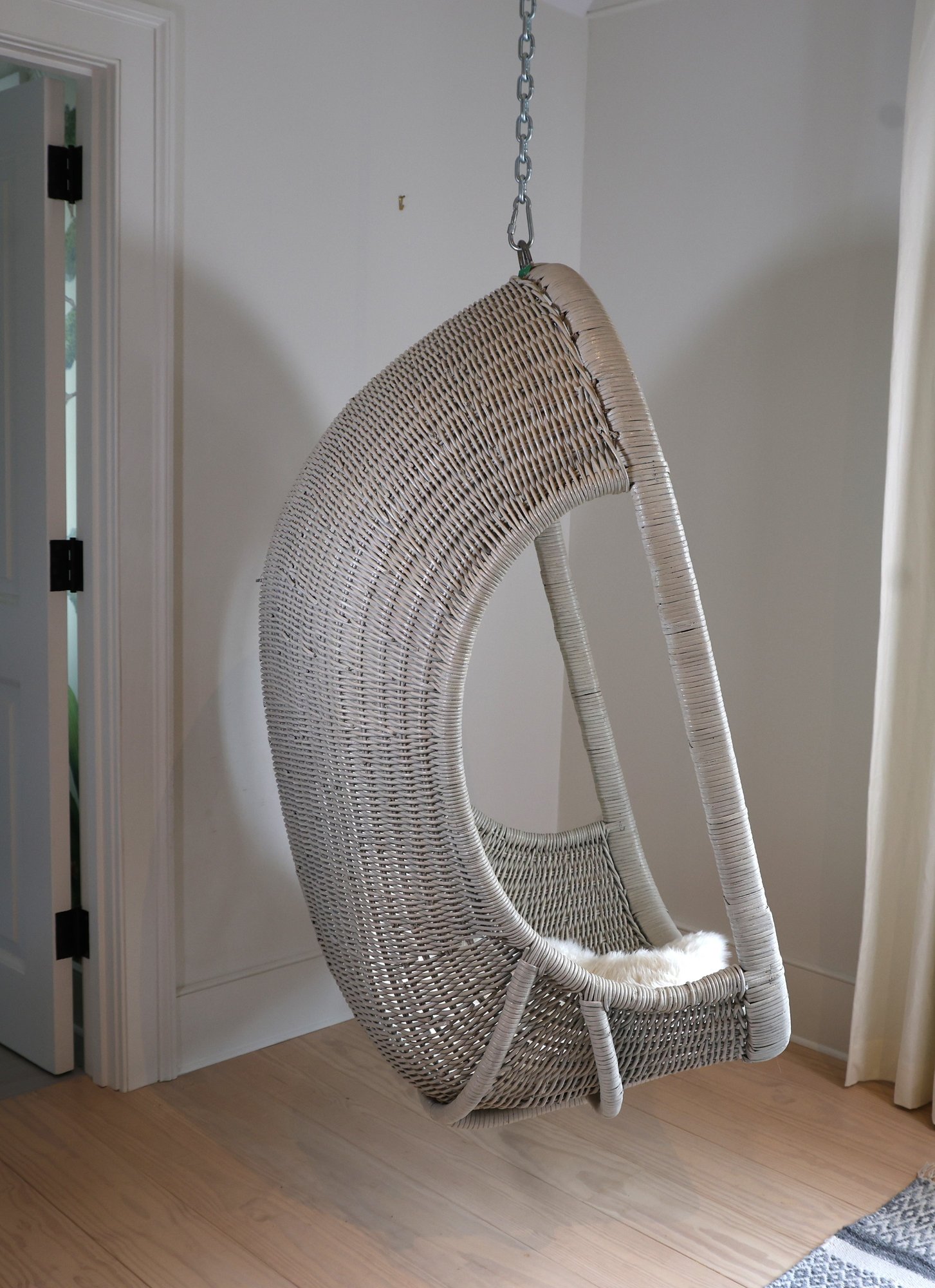Restoration Hardware wicker swing perfect for nursery, kids, teen or porch! Generously proportioned. Very comfortable with great quality. Chain comes with the chair but ceiling hook does not. Comes with a sheepskin rug