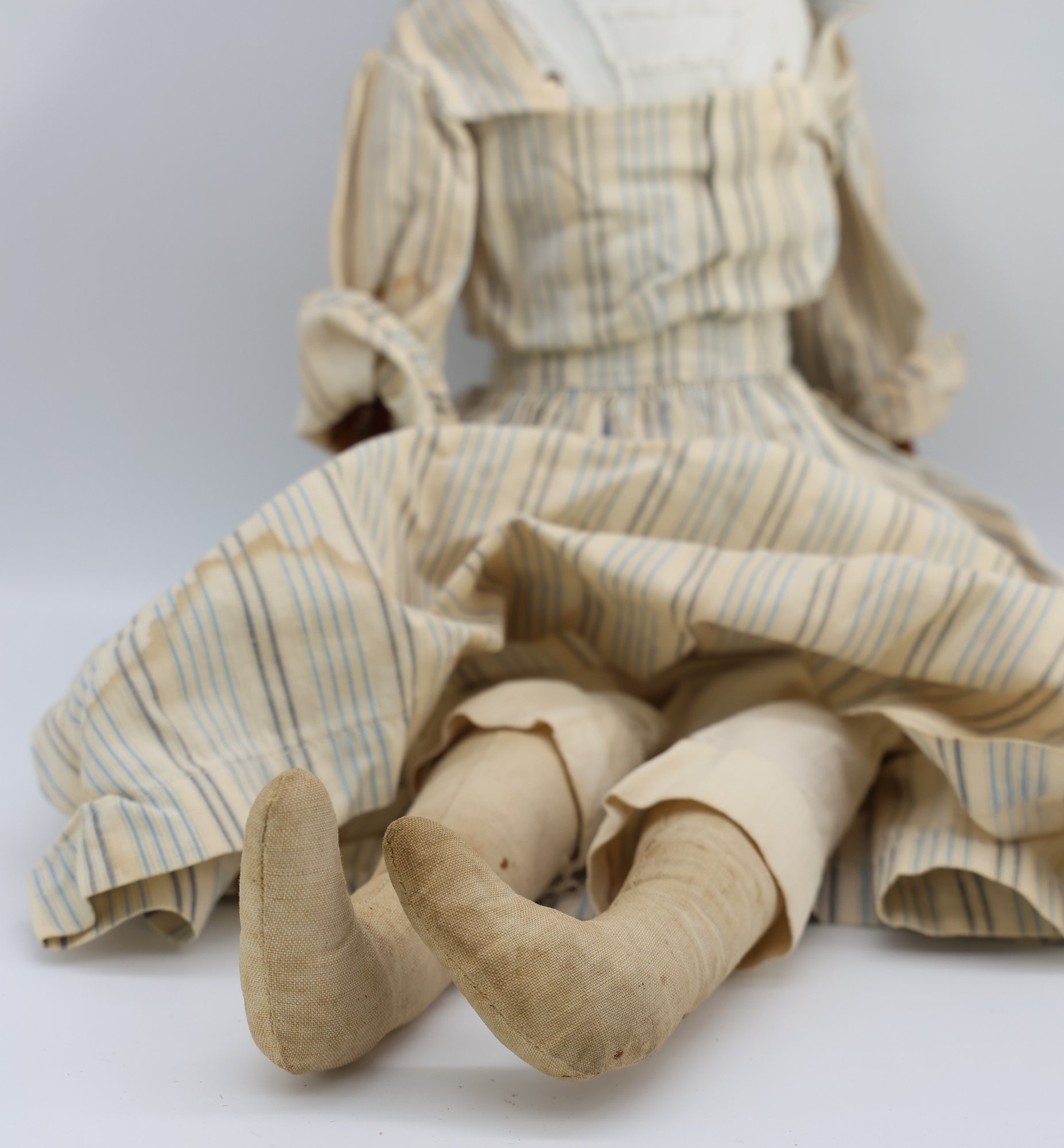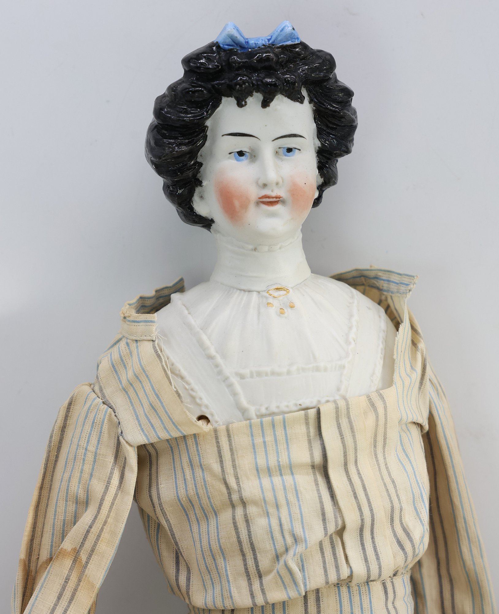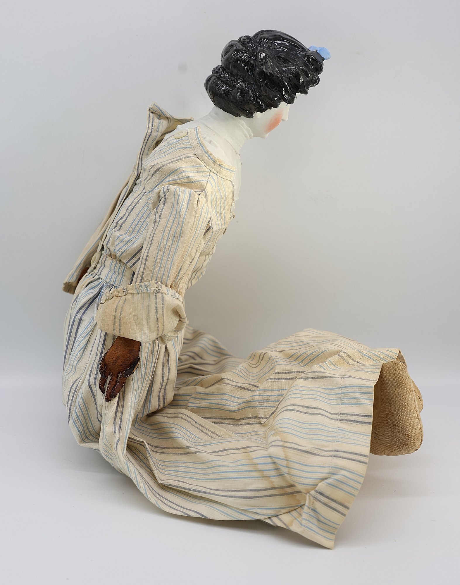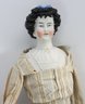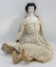 "Porcelain head, leather hands, cloth body and feet. Nice condition