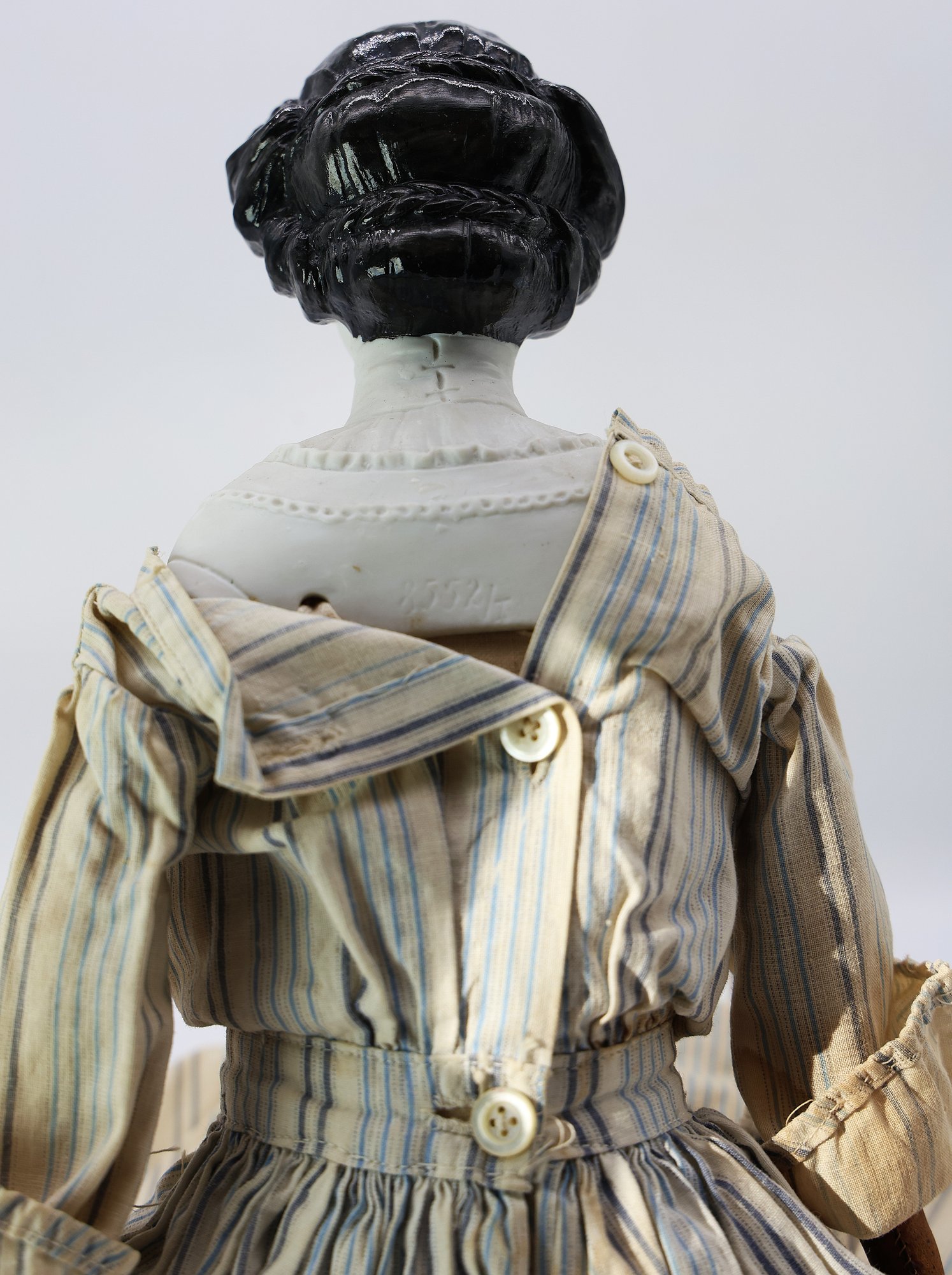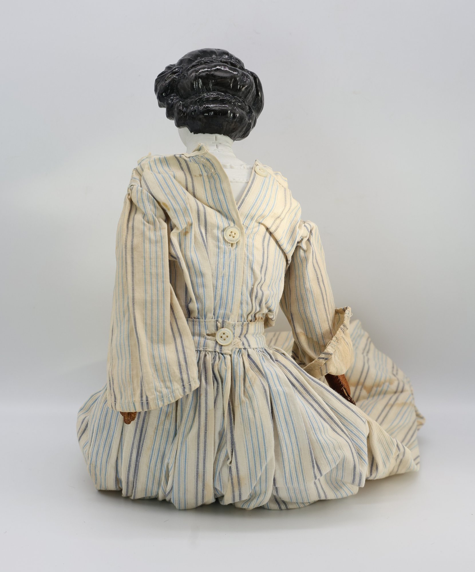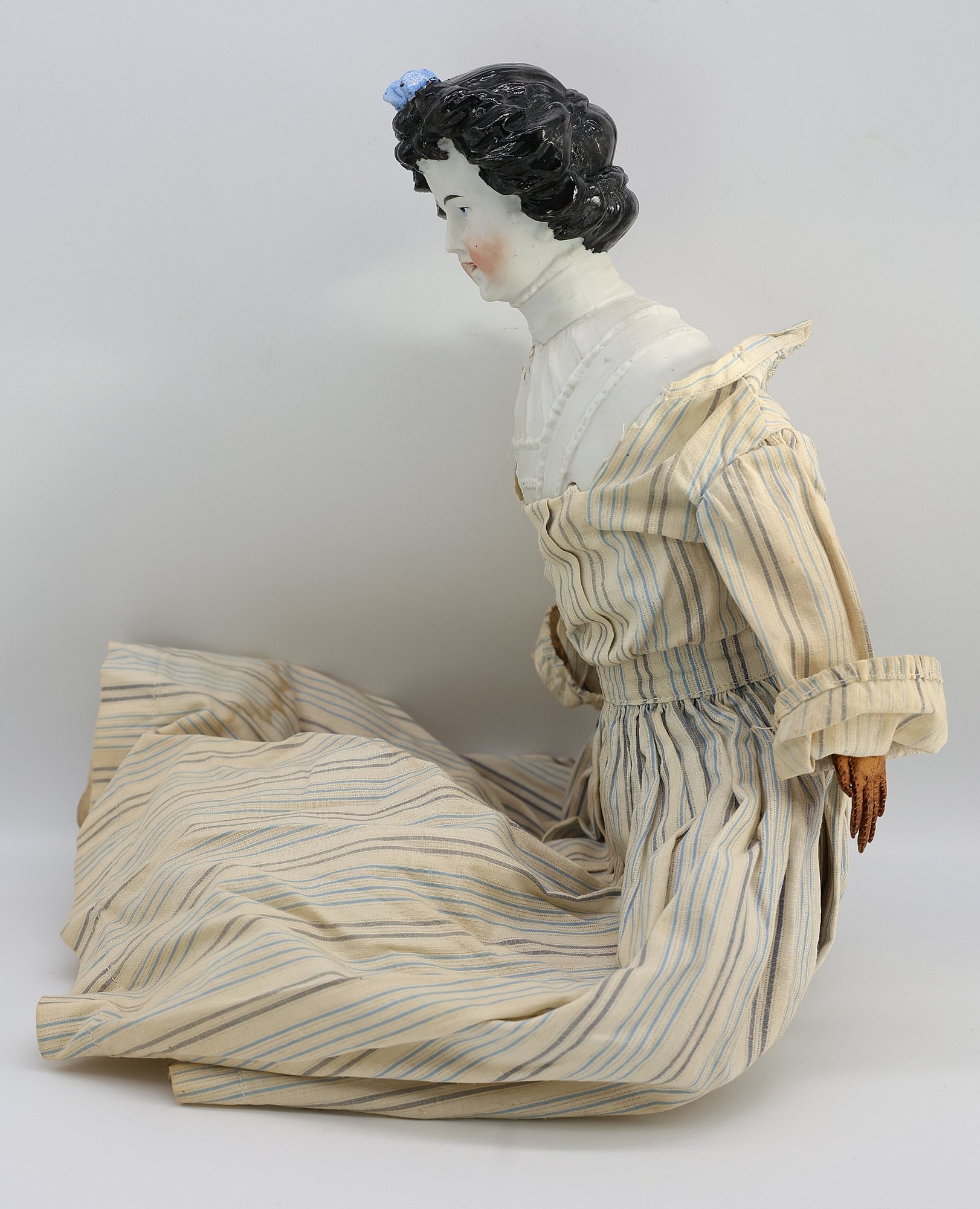 "Porcelain head, leather hands, cloth body and feet. Nice condition