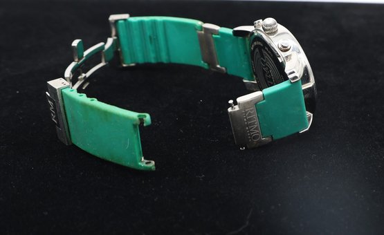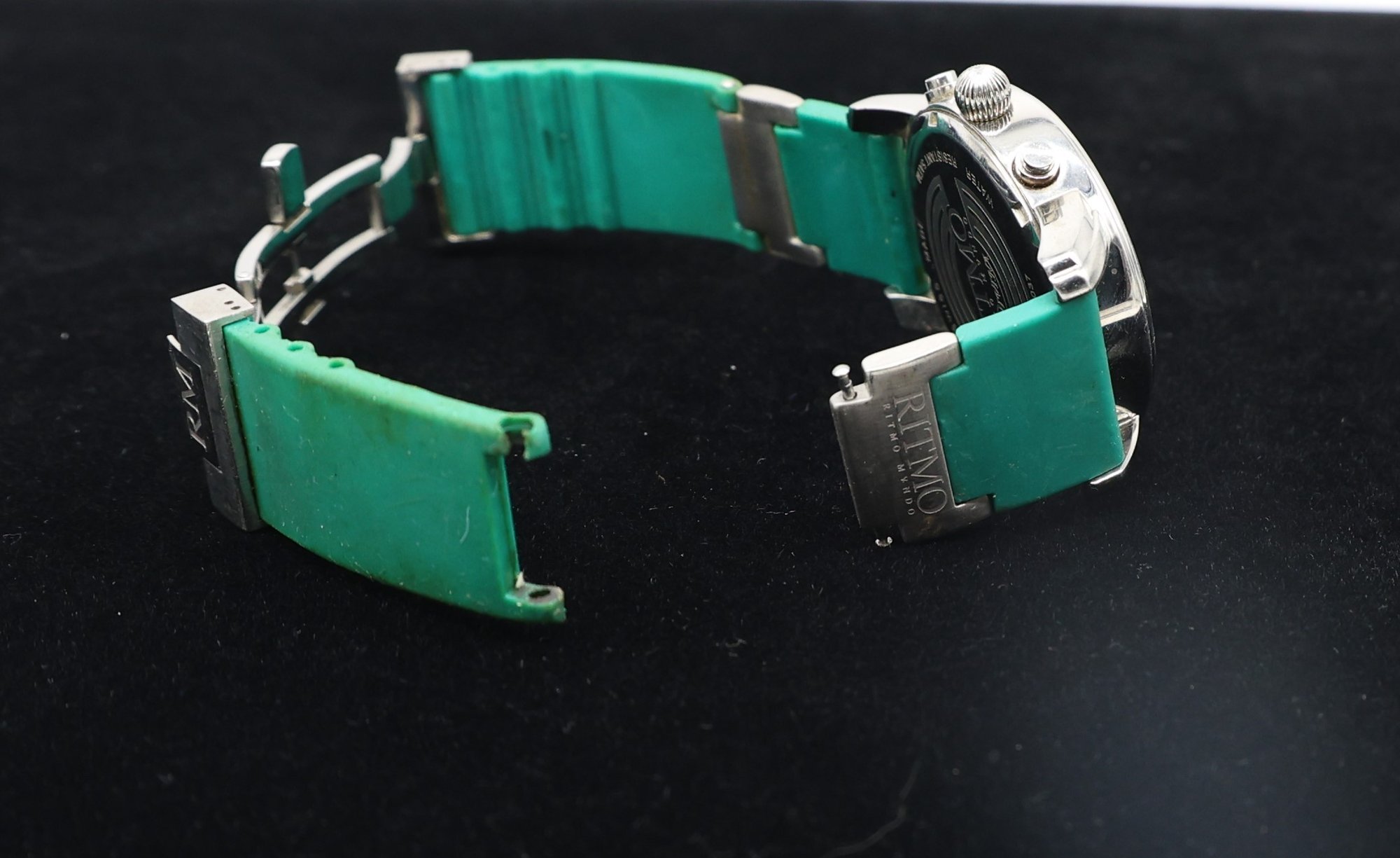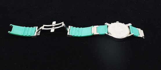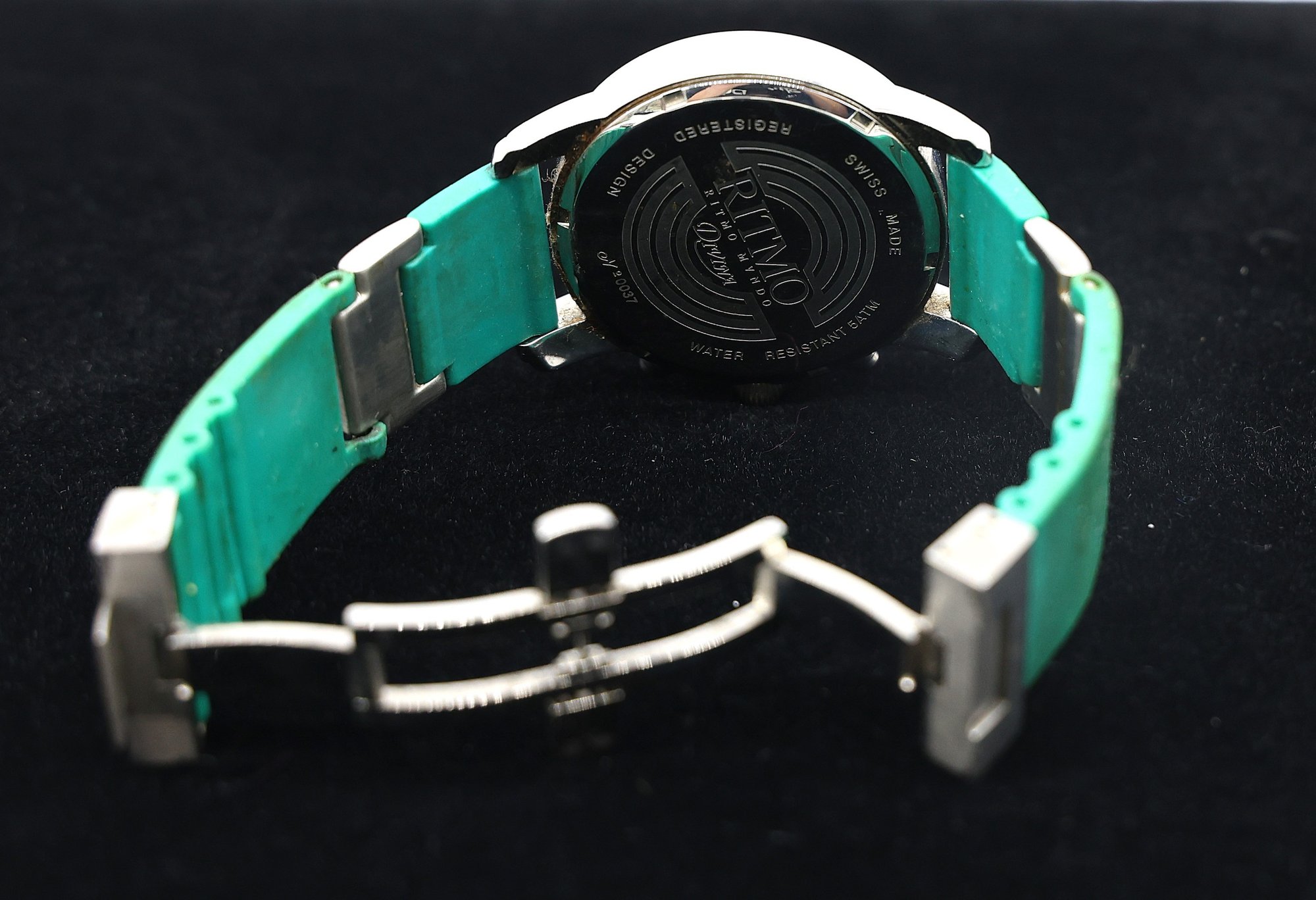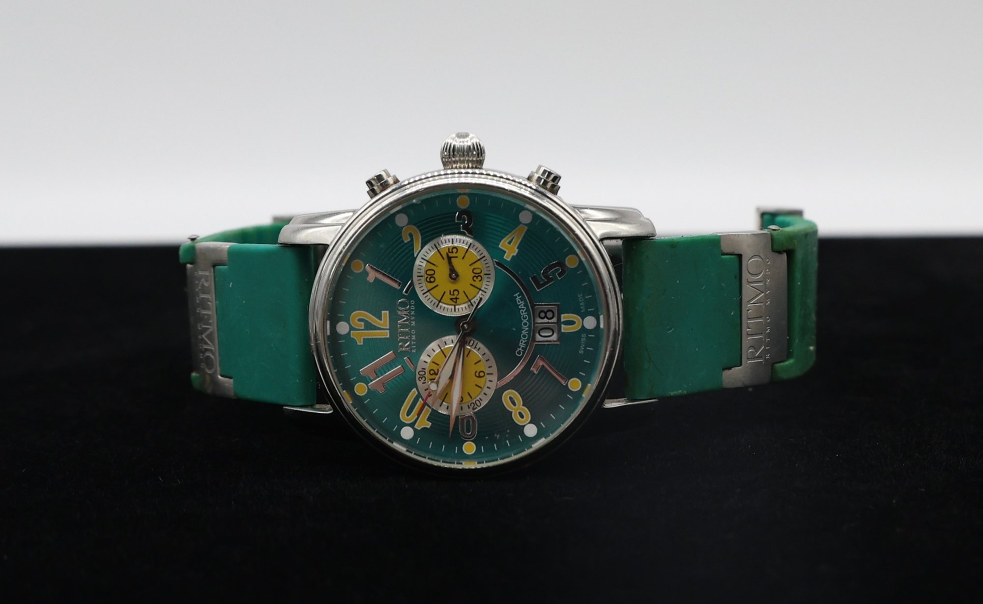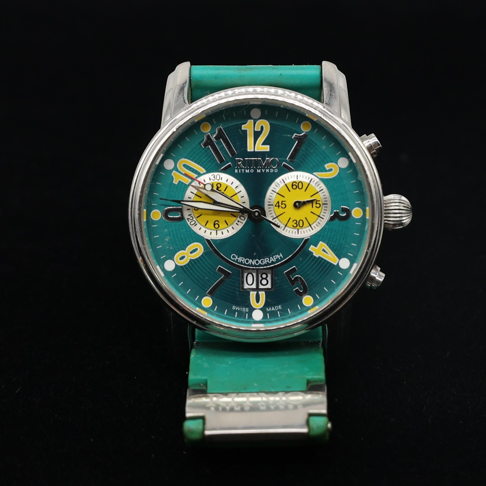 Ritmo Mundo Divine quartz Chronograph specifically from a series known for bold colors and a big Date and two sun dials for timing. Swiss made. Part of the band that links on has damage on one side.