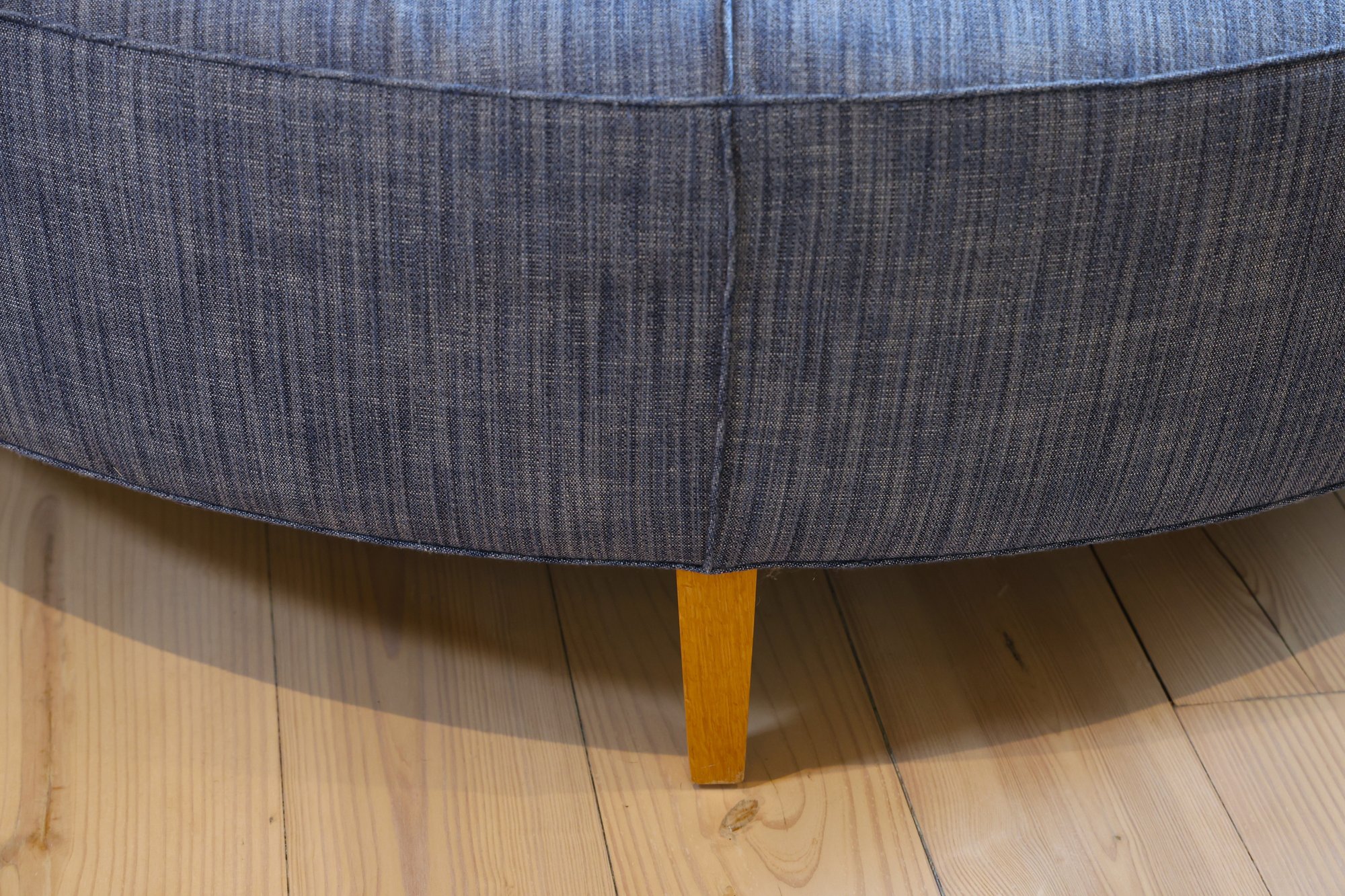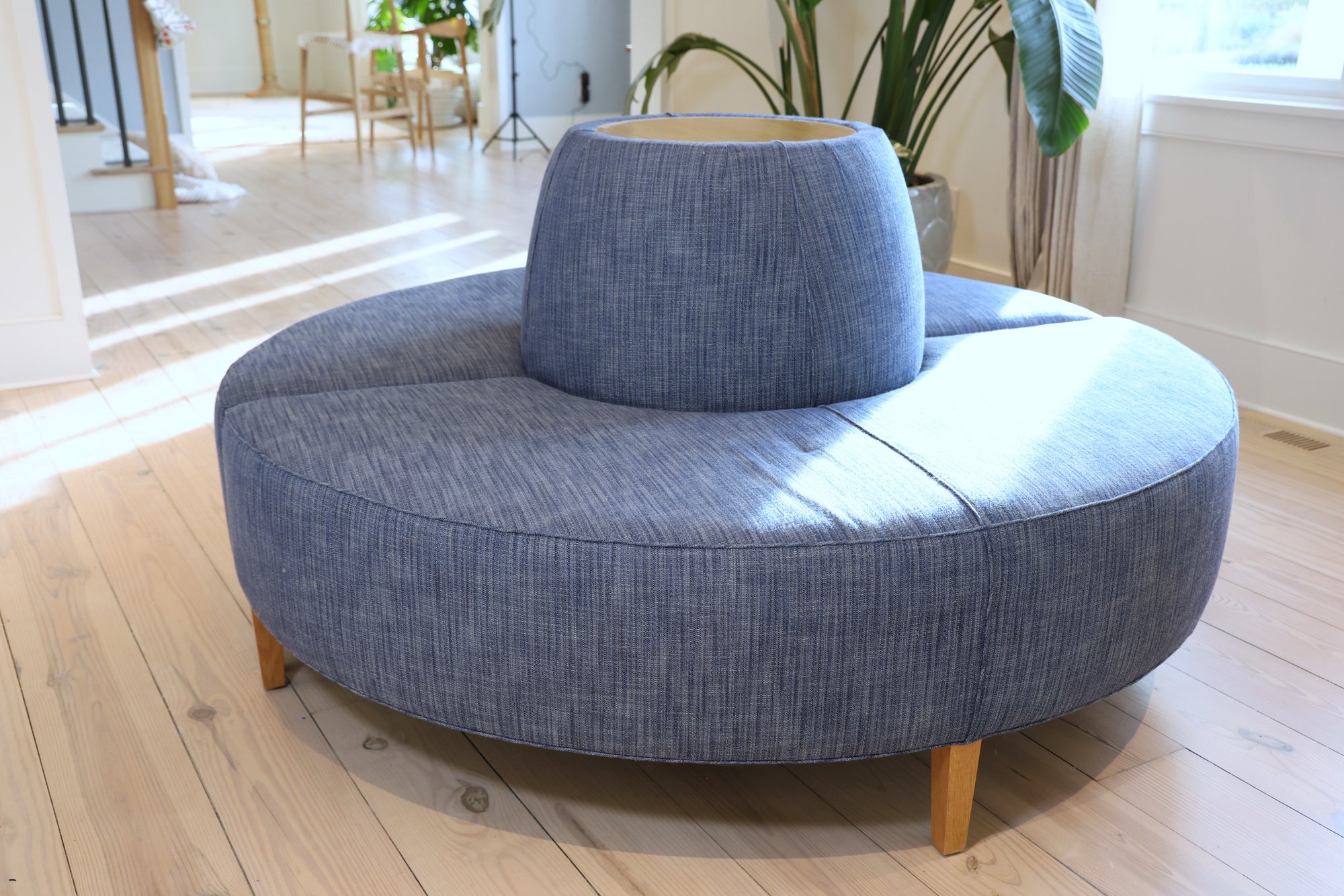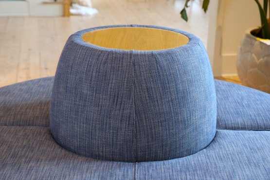 This contemporary design fits perfectly anywhere, especially in the foyer for waiting, putting on shoes, or casual conversation. It adds both visual interest and functional versatility. Upholstered in denim blue fabric with a subtle texture, the sofa is supported by several short, light-colored wooden legs. The center features a tall, integrated cylindrical section that serves as a table or backrest, with a light wood-colored top.