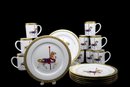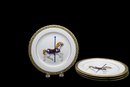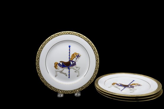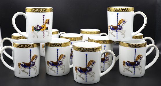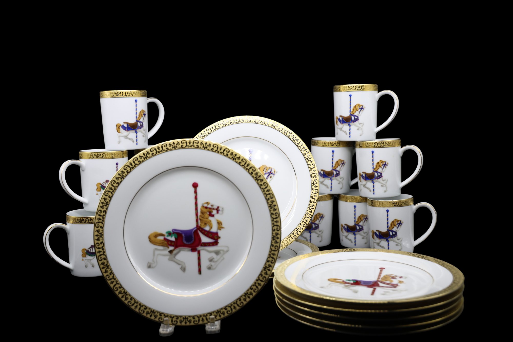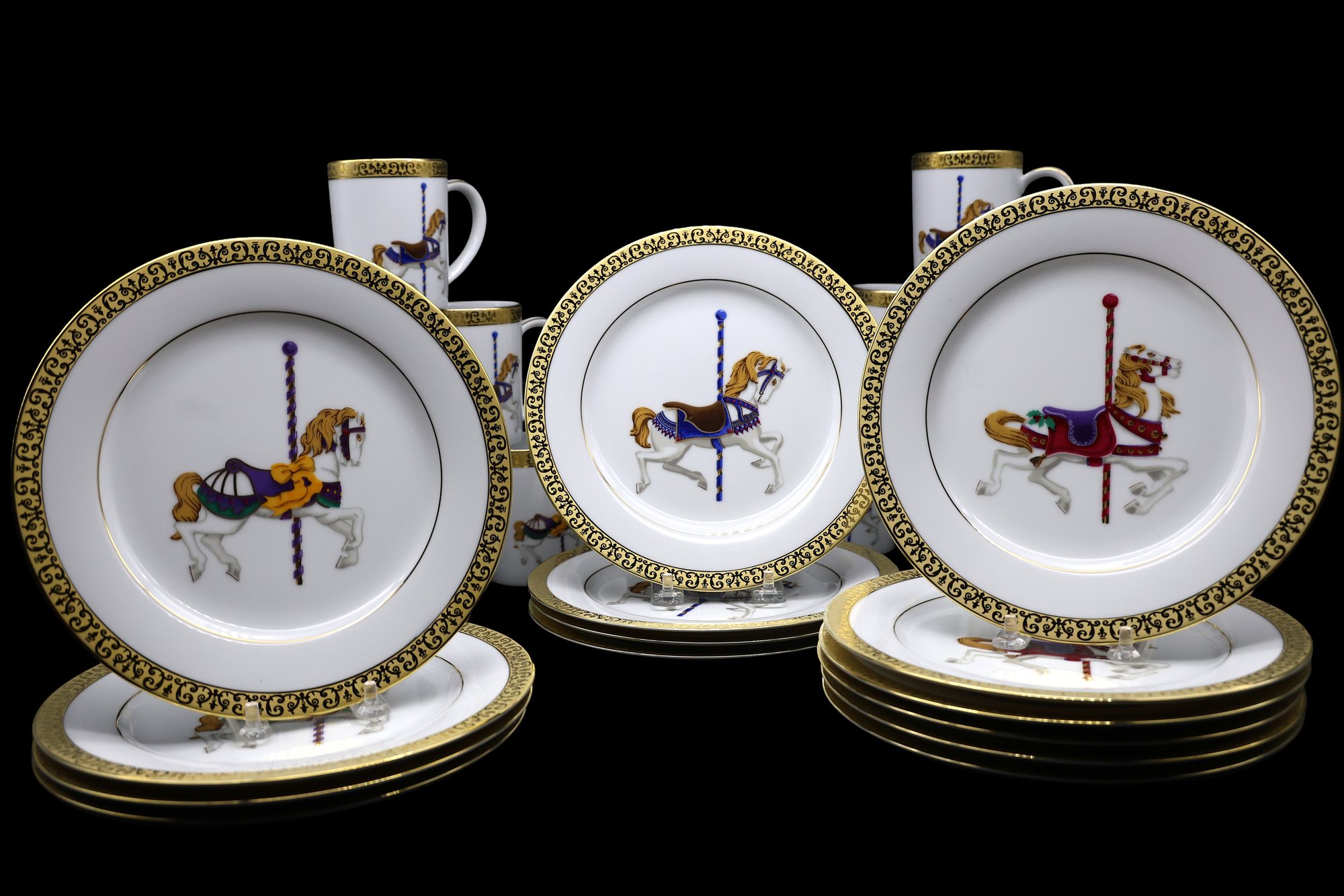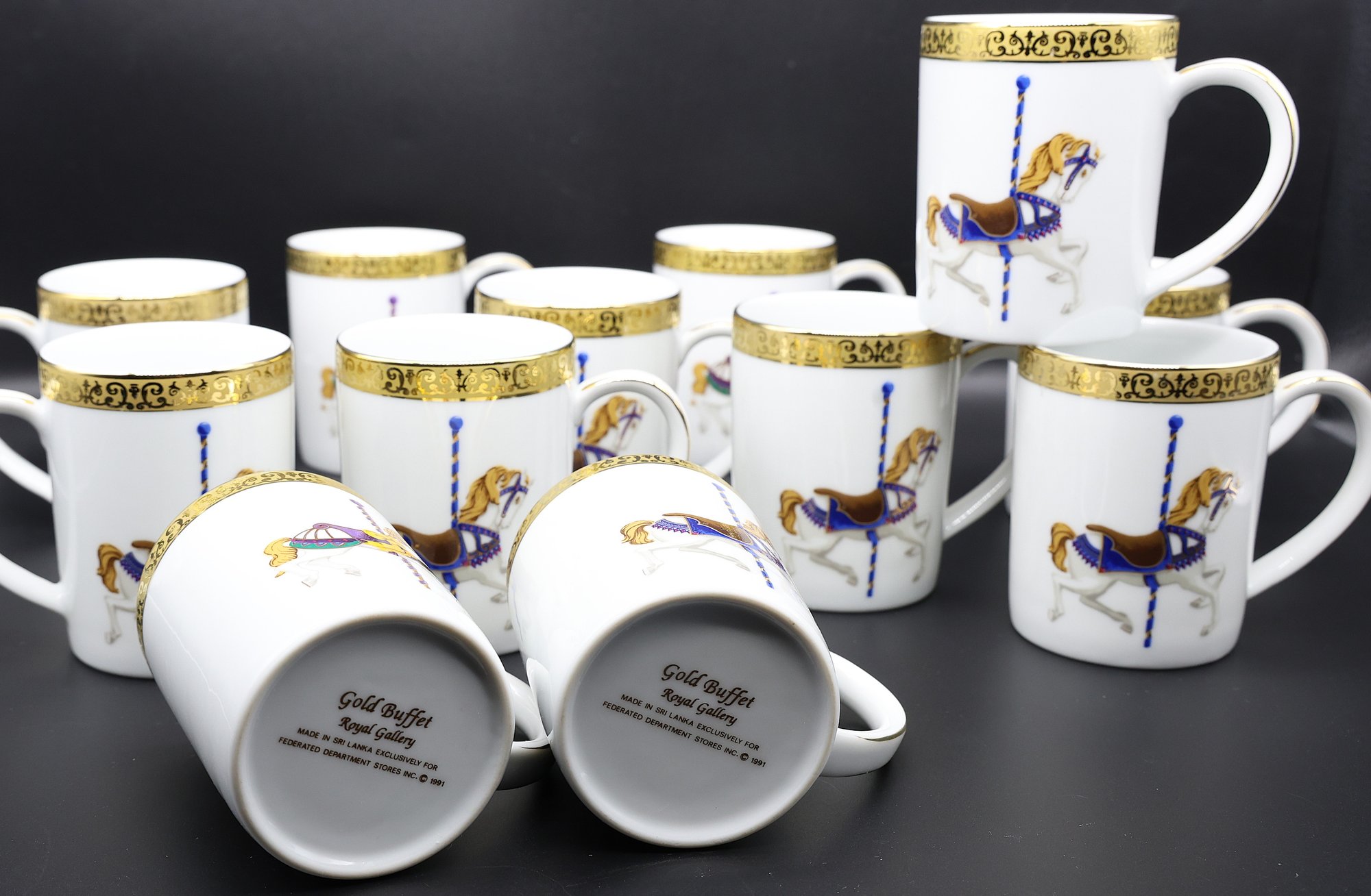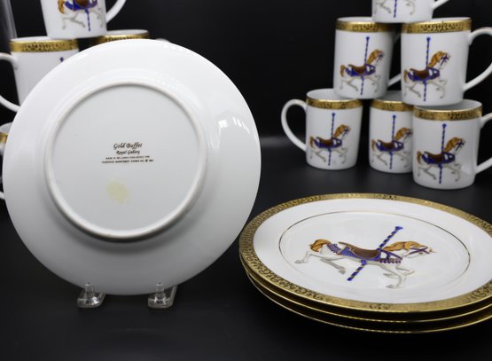 Gold Buffet Royal Gallery Carousel Horse porcelain dinnerware set, originally released in 1991. It features intricate carousel-horse illustrations on a white background, with a decorative gold-patterned rim. 12 -Salad/Dessert plates measure 8.5 inches, and there are 12 matching coffee/tea mugs that are 3.5 inches high.