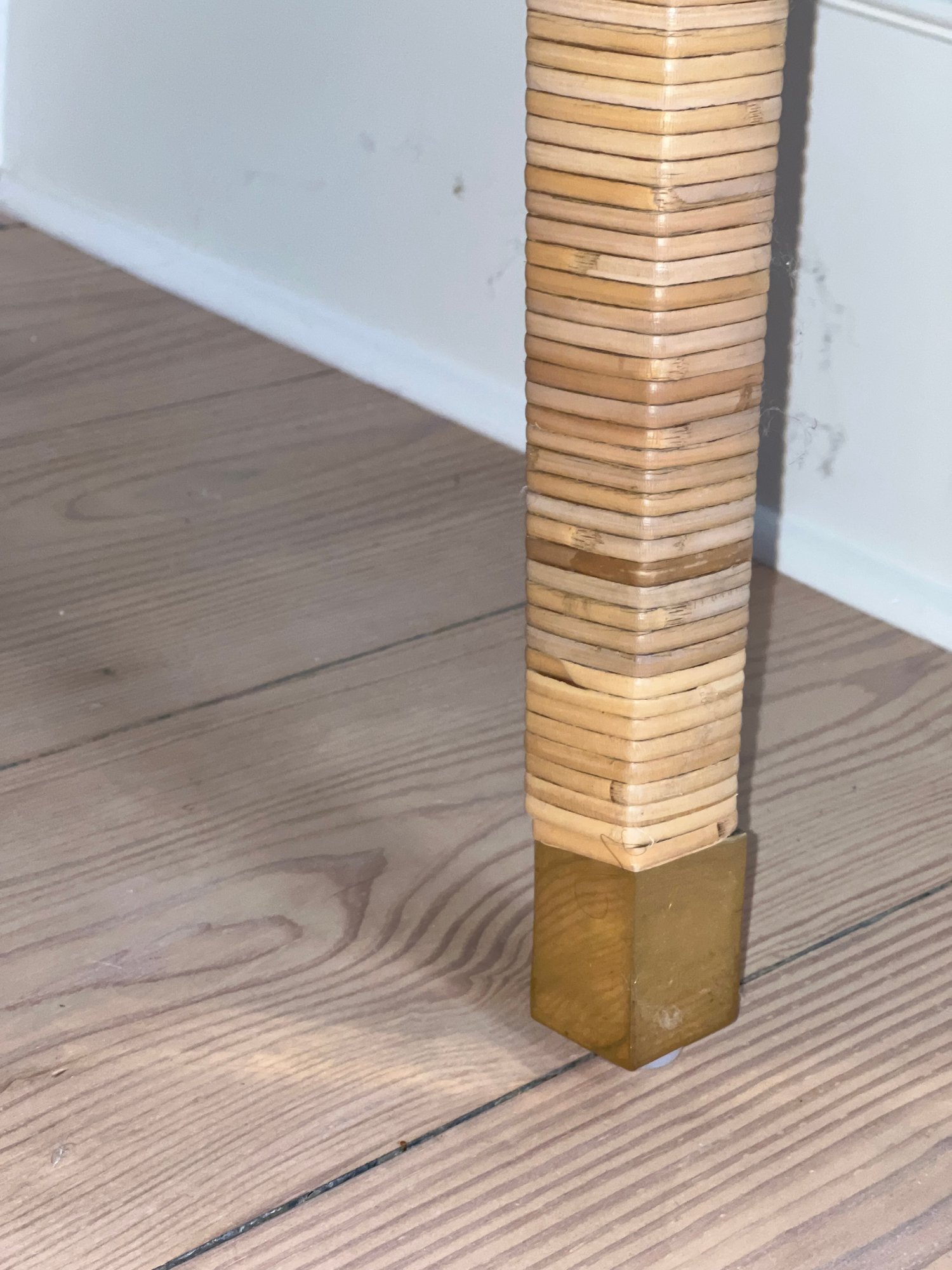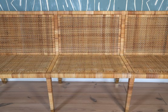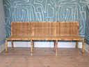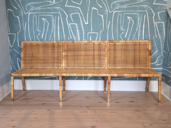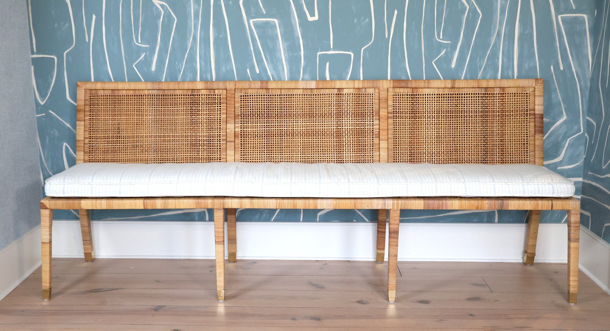 Lovely rattan bench with cushion (white & powder blue striped and piped). Can be used with or without the cushion. Nice condition to go in a hallway or even for a table for seating!