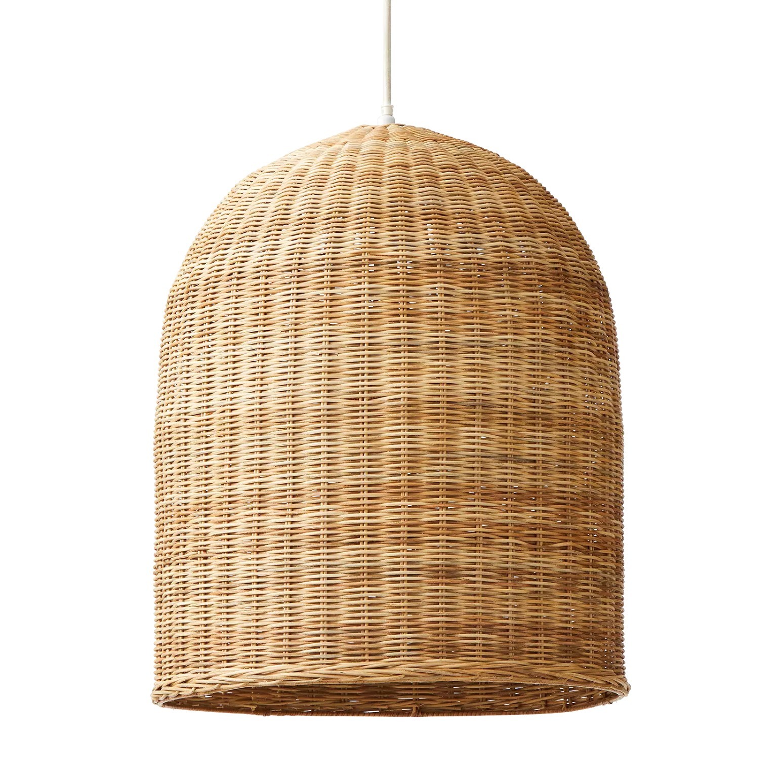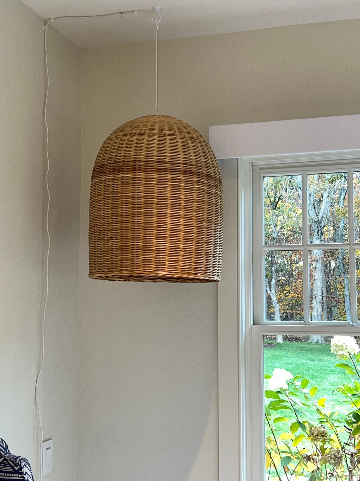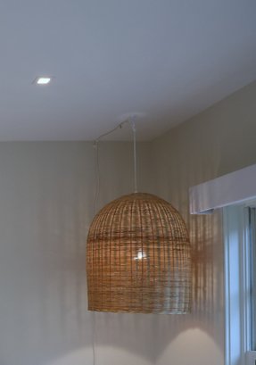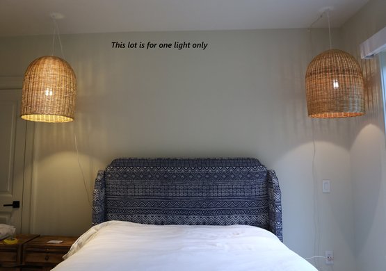 The Serena and Lily Santa Barbara rattan pendant fits naturally into any space. It features a classic, refined wicker weave. Lot 20094 is the same if needing two. It has a natural white cord with an on/off switch. This hangs on a ceiling hook and is plugged in (ceiling hook not included). Overall dimensions are 19" D x 24" H. It is working when tested.