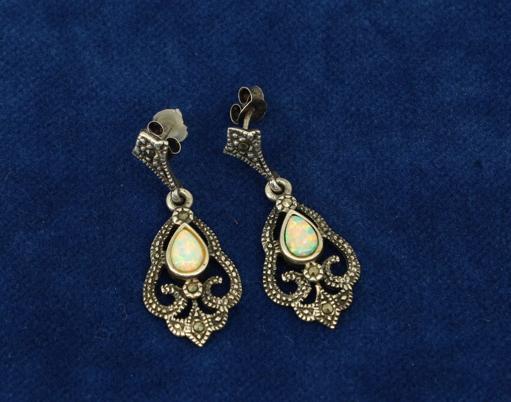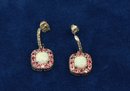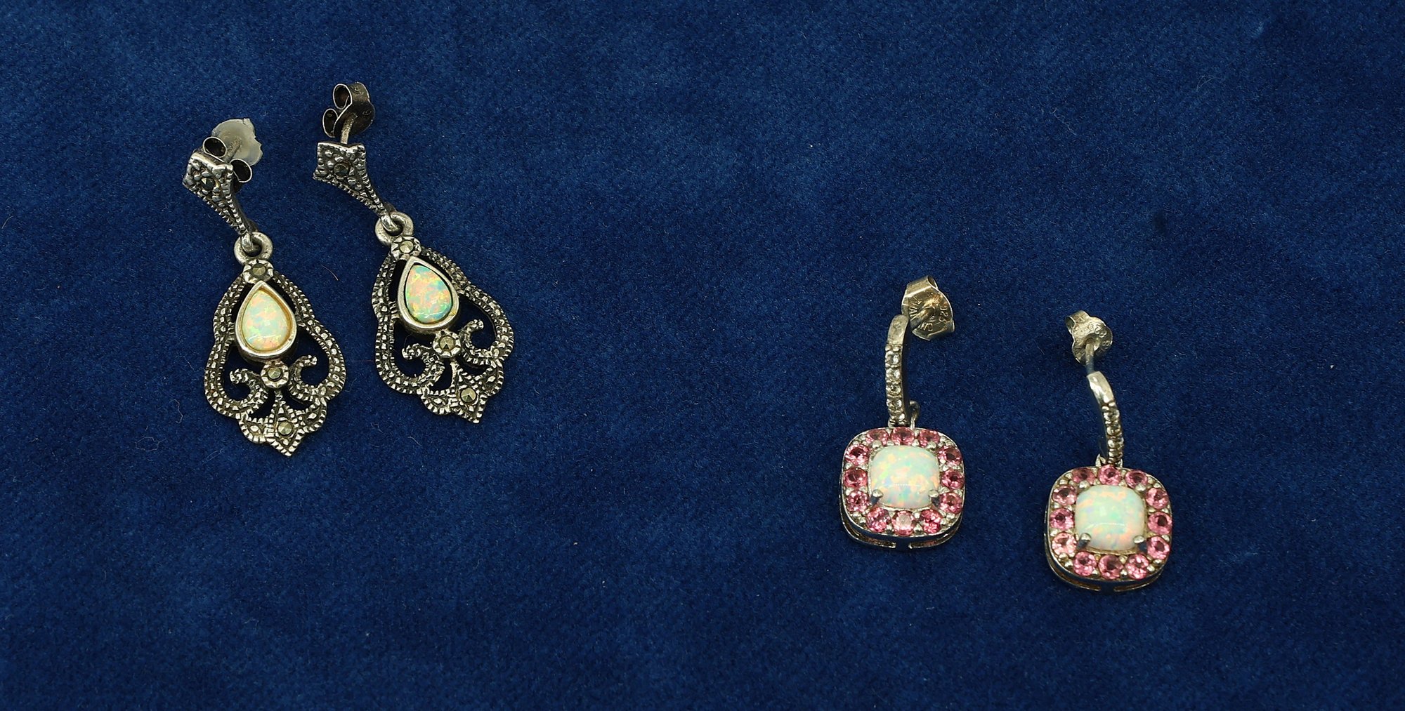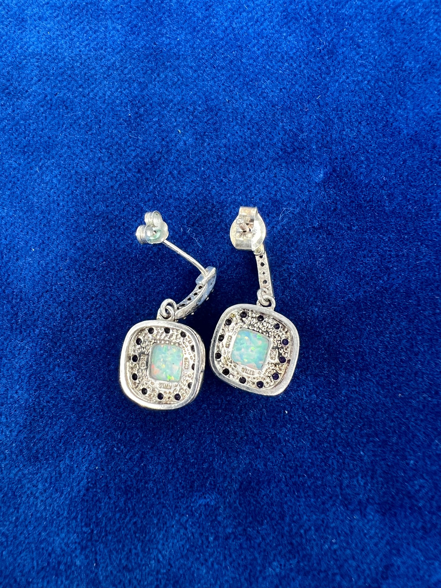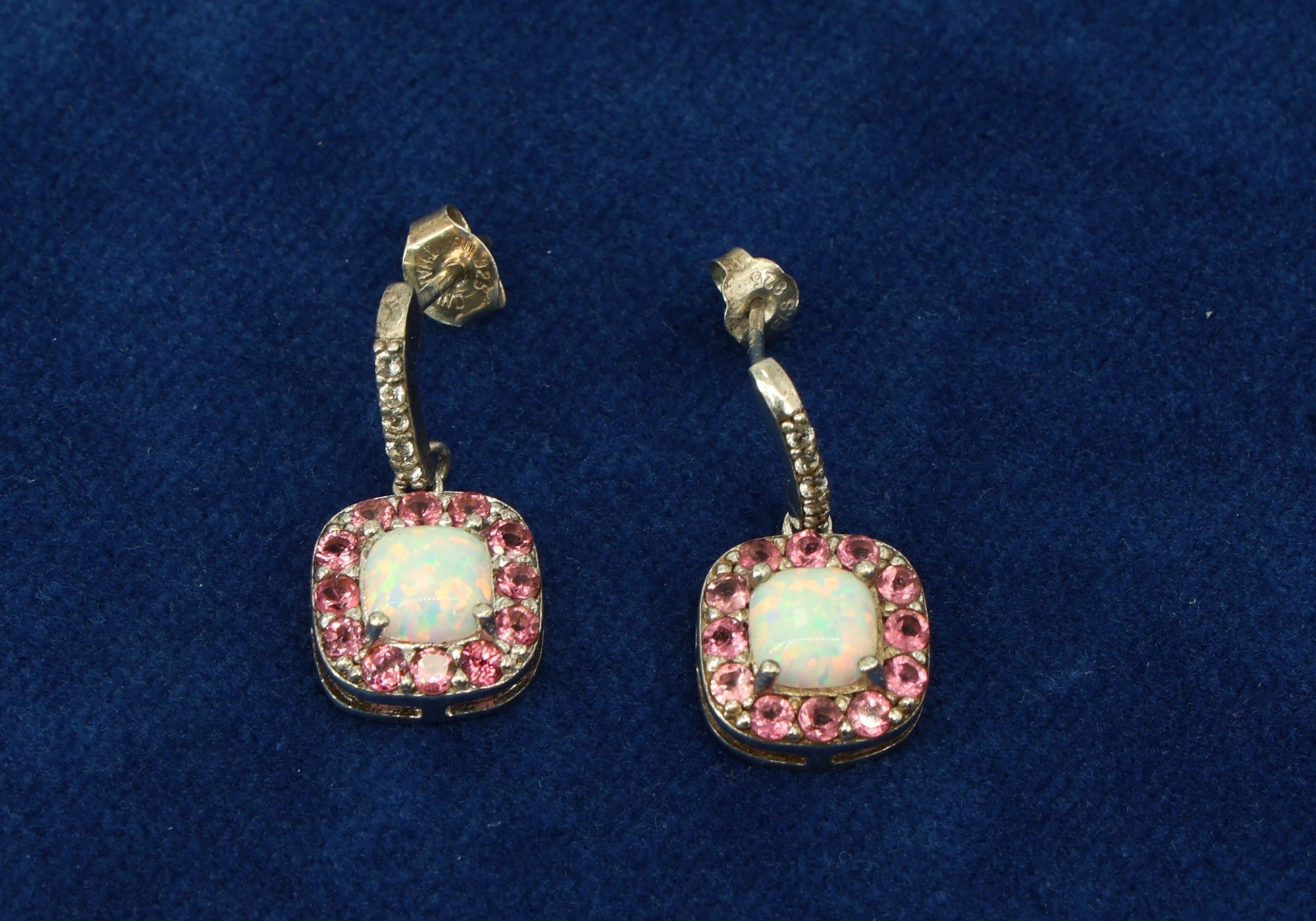 Sterling silver drop earring featuring a cushion-cut opal center surrounded by a pink tourmaline halo.