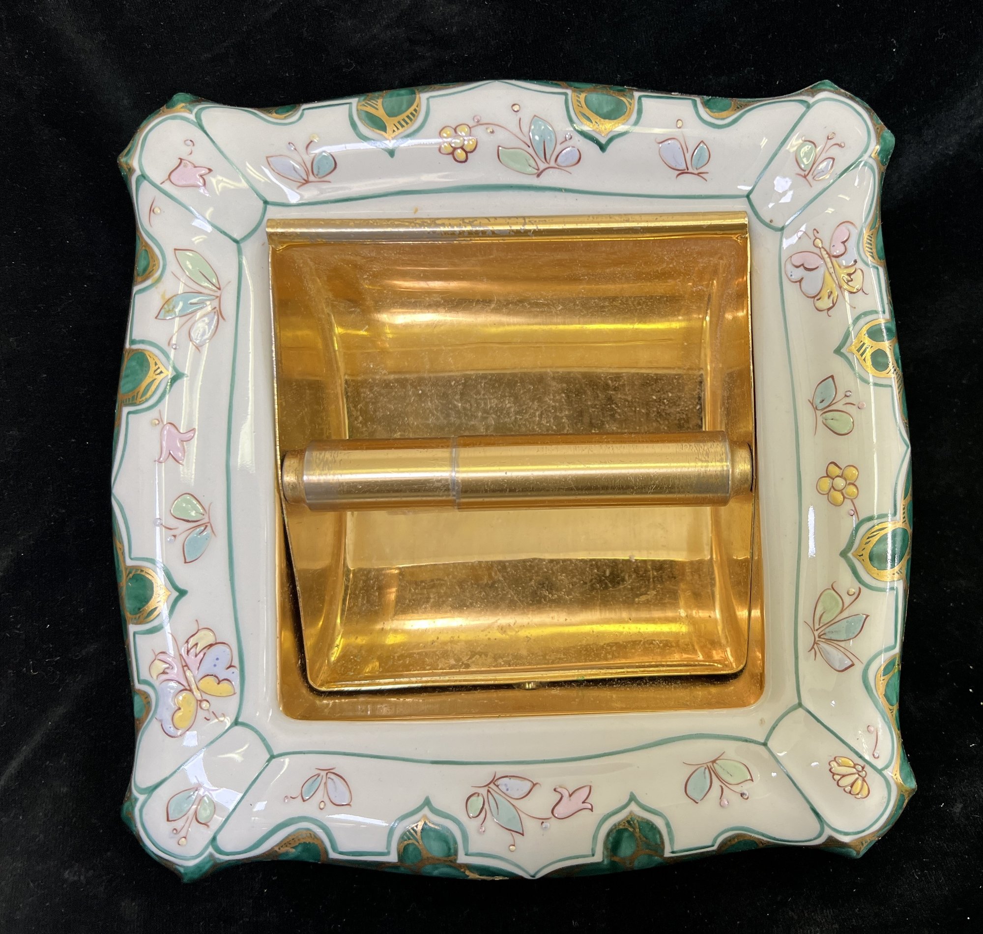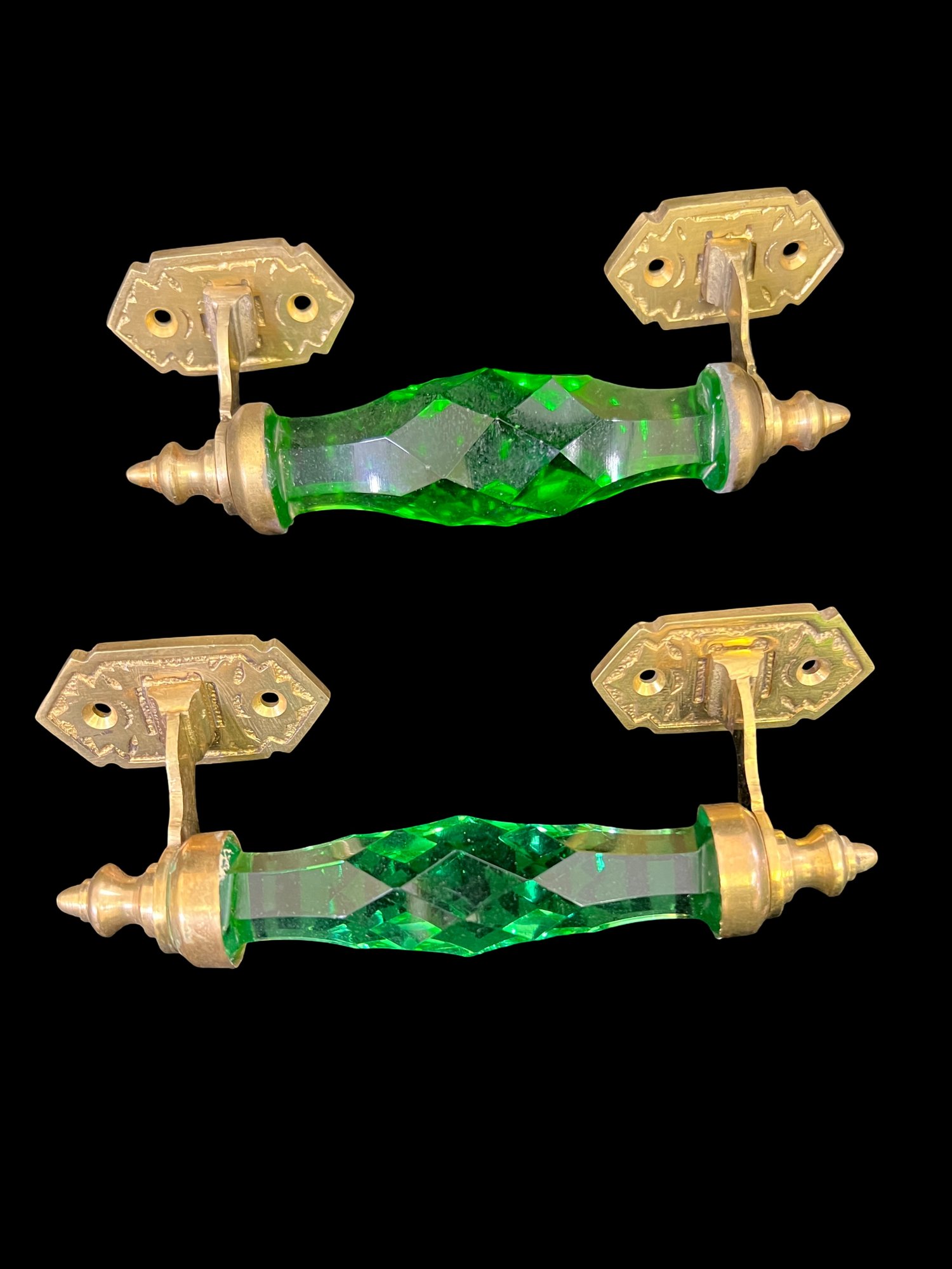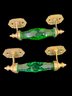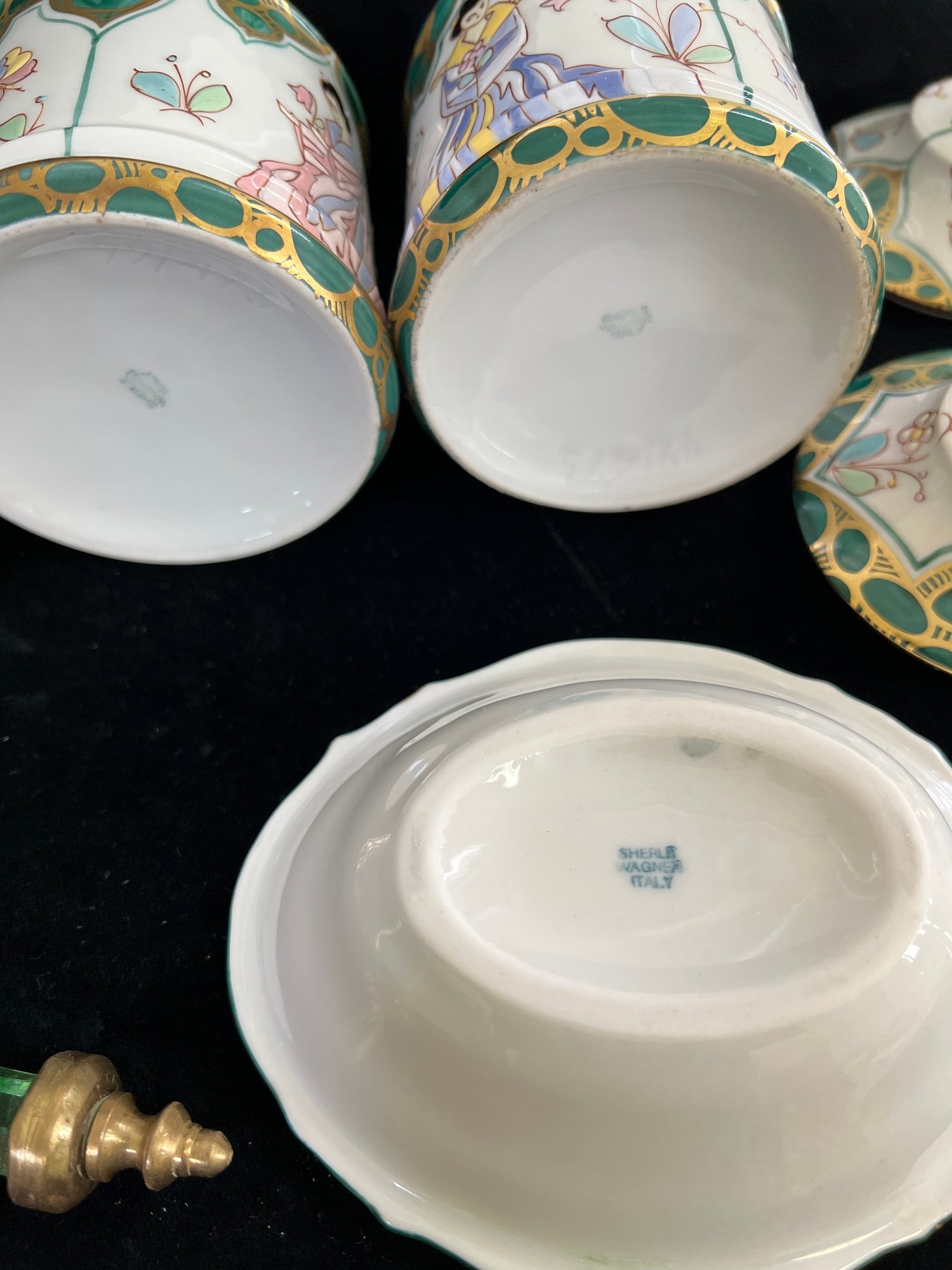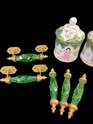 Vintage Sherle Wagner recessed toilet paper holder (8.5"sq) featuring a gold-plated interior and a hand-painted ceramic frame. It employs a Hall-Mack mechanism. The Sherle Wagner Chinoiserie bathroom set includes two covered jars (5.5"H) and a soap dish (5.5"W), all decorated with a green gilt border and a lady motif. Green glass (Not Sherle Wagner)knobs for cabinets or drawers, and green cut-glass handles with brass fittings, are also part of the collection. The handles have a faceted, diamond-cut design in vibrant green glass and are mounted on brass brackets with decorative plates. Sherle Wagner is renowned for its luxury hardware and bath accessories, exemplifying fine craftsmanship.
