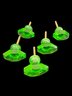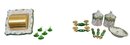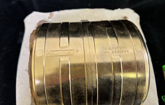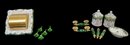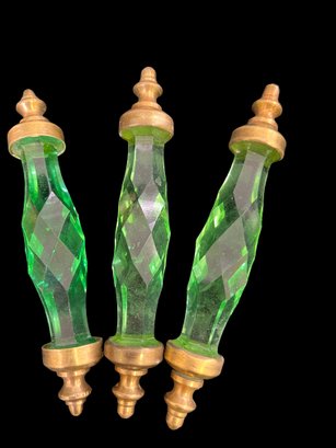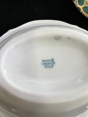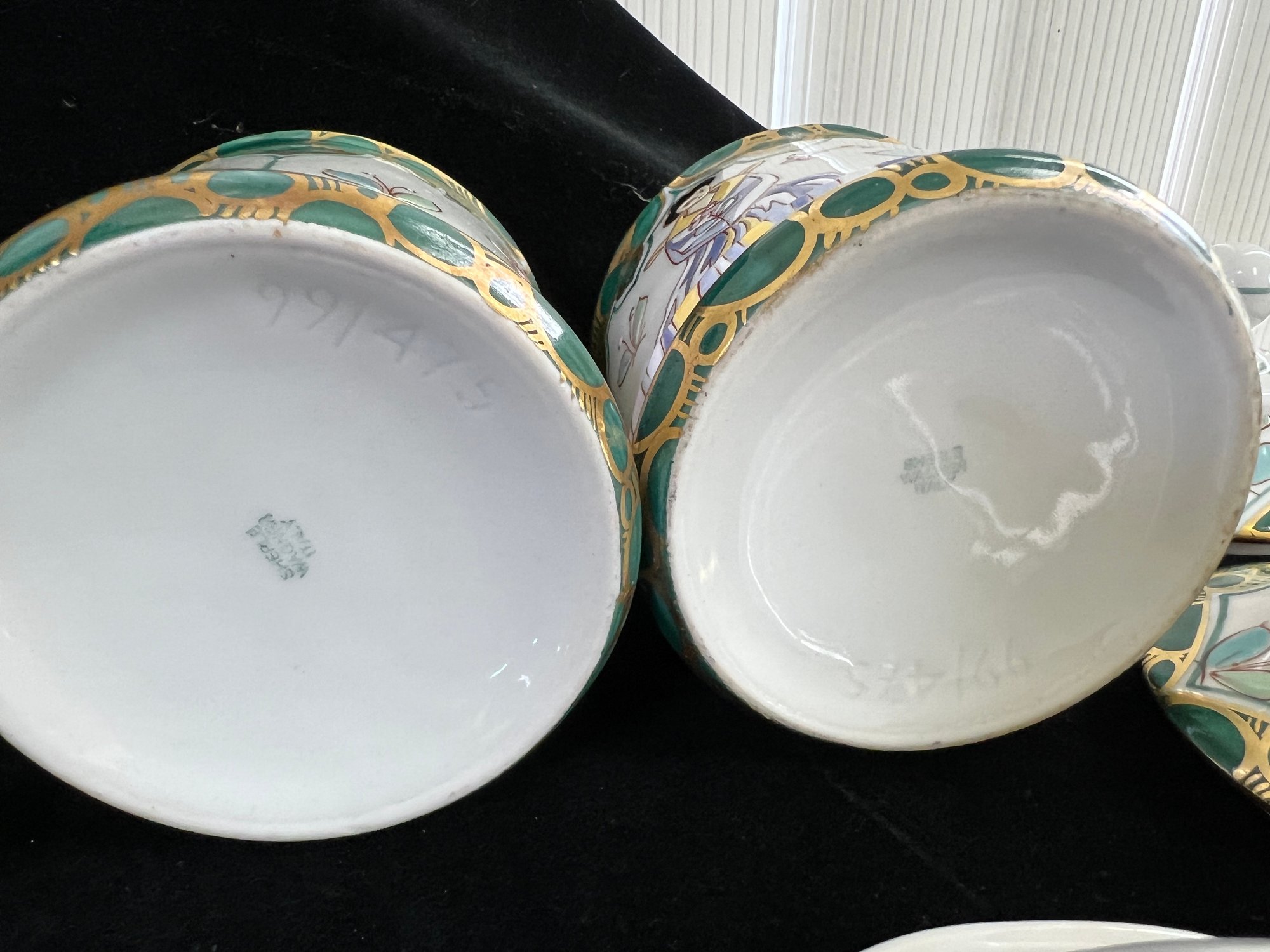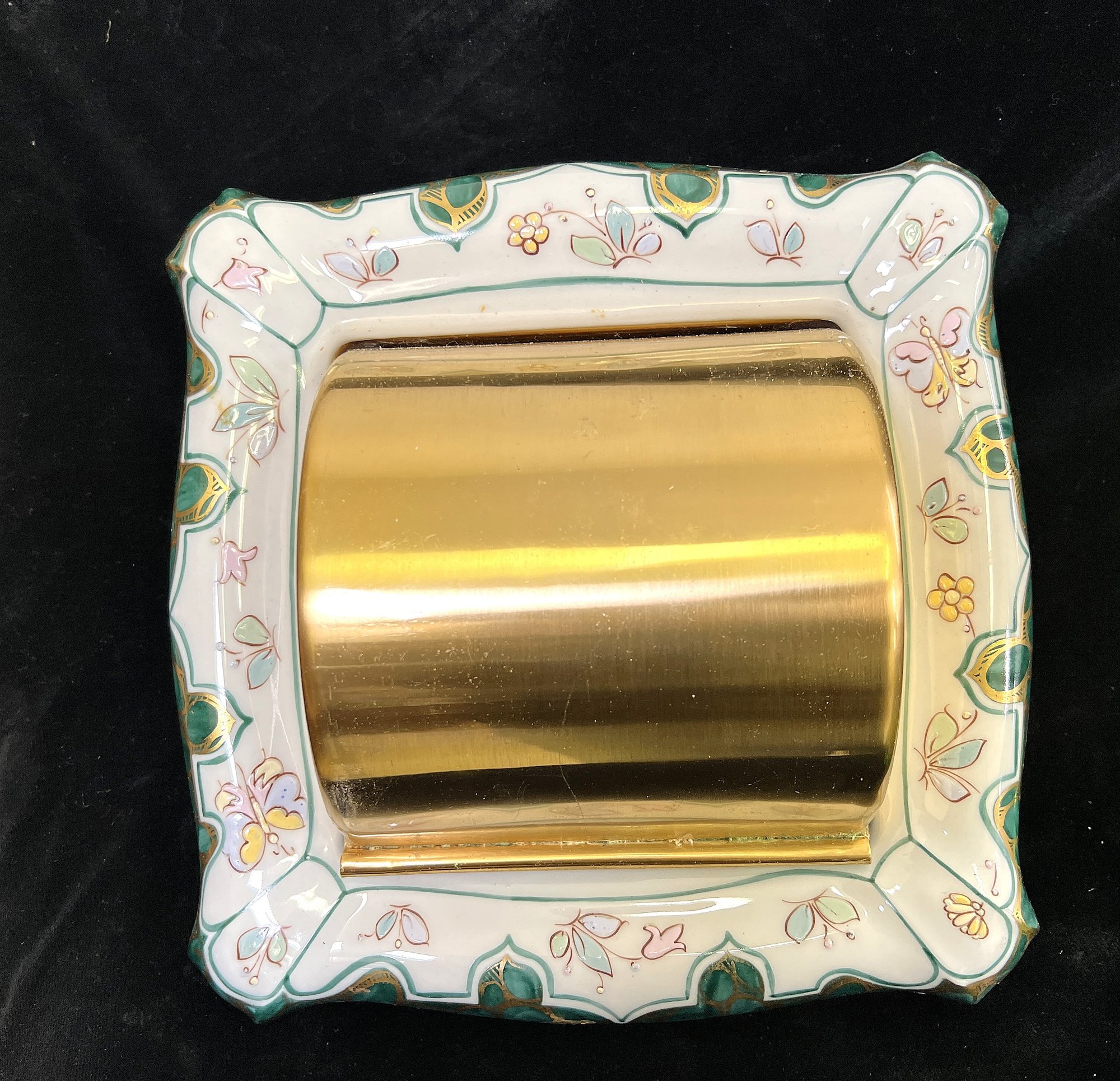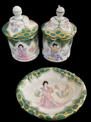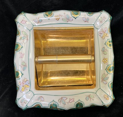 Vintage Sherle Wagner recessed toilet paper holder (8.5"sq) featuring a gold-plated interior and a hand-painted ceramic frame. It employs a Hall-Mack mechanism. The Sherle Wagner Chinoiserie bathroom set includes two covered jars (5.5"H) and a soap dish (5.5"W), all decorated with a green gilt border and a lady motif. Green glass (Not Sherle Wagner)knobs for cabinets or drawers, and green cut-glass handles with brass fittings, are also part of the collection. The handles have a faceted, diamond-cut design in vibrant green glass and are mounted on brass brackets with decorative plates. Sherle Wagner is renowned for its luxury hardware and bath accessories, exemplifying fine craftsmanship.