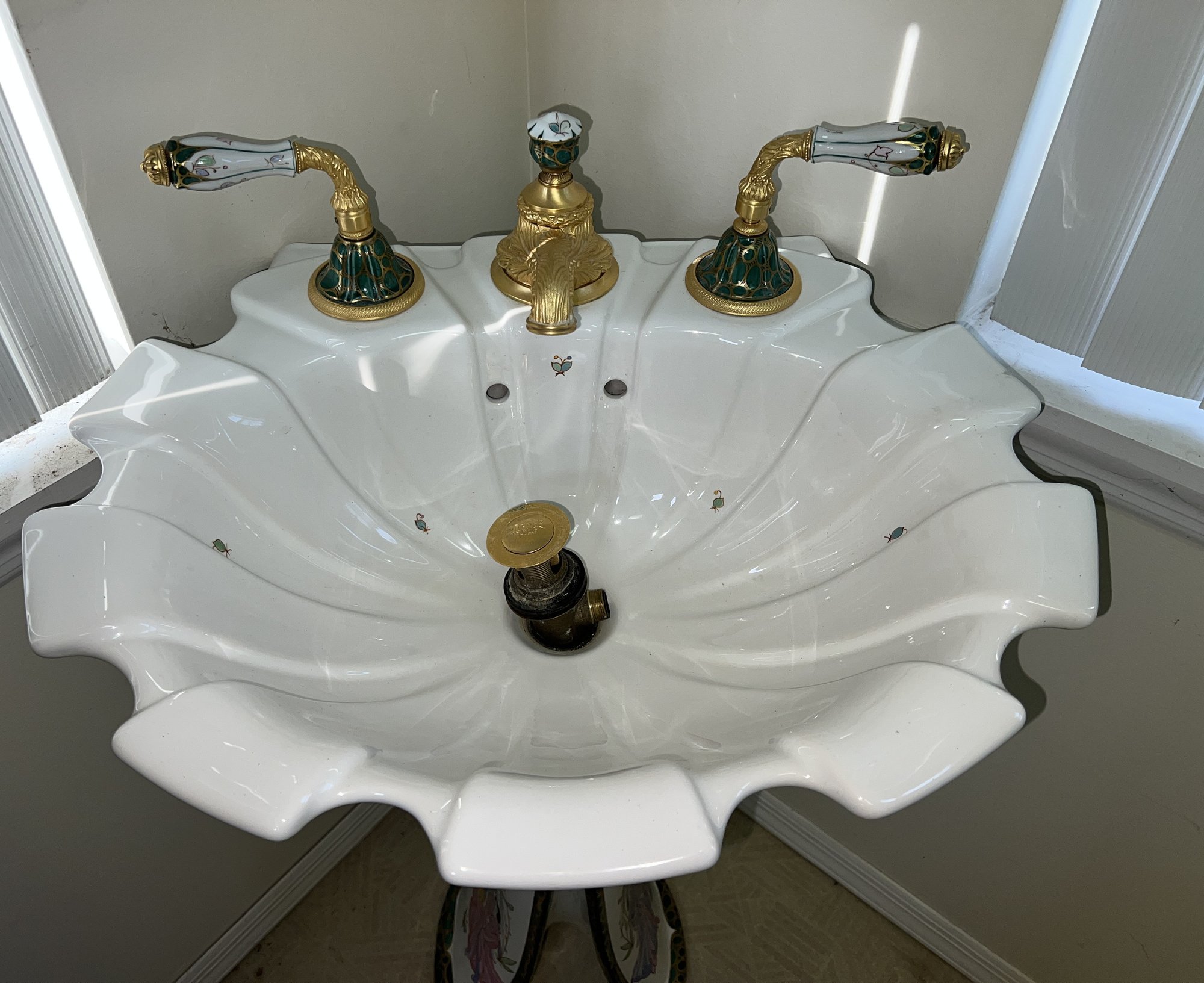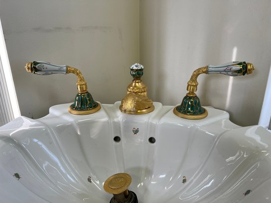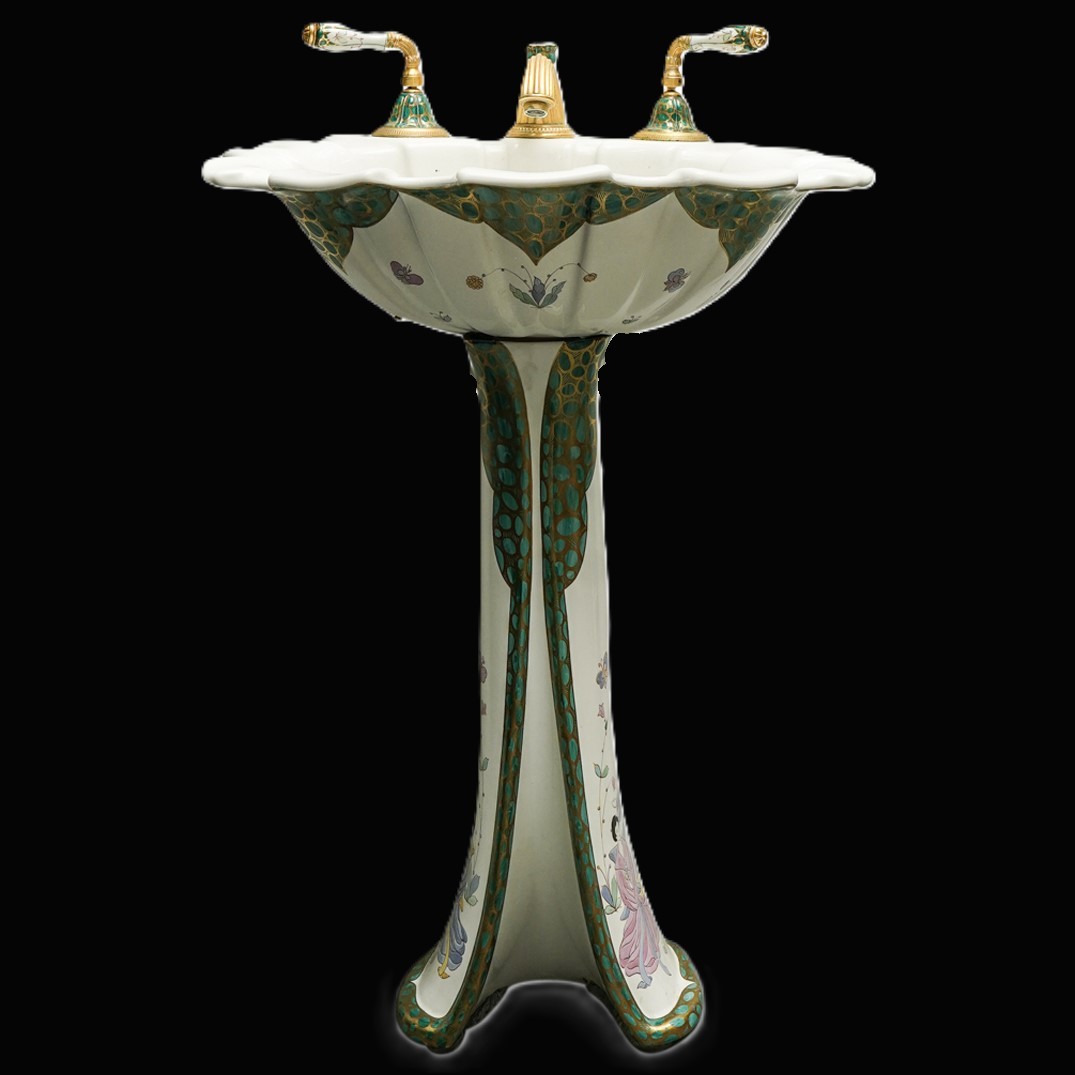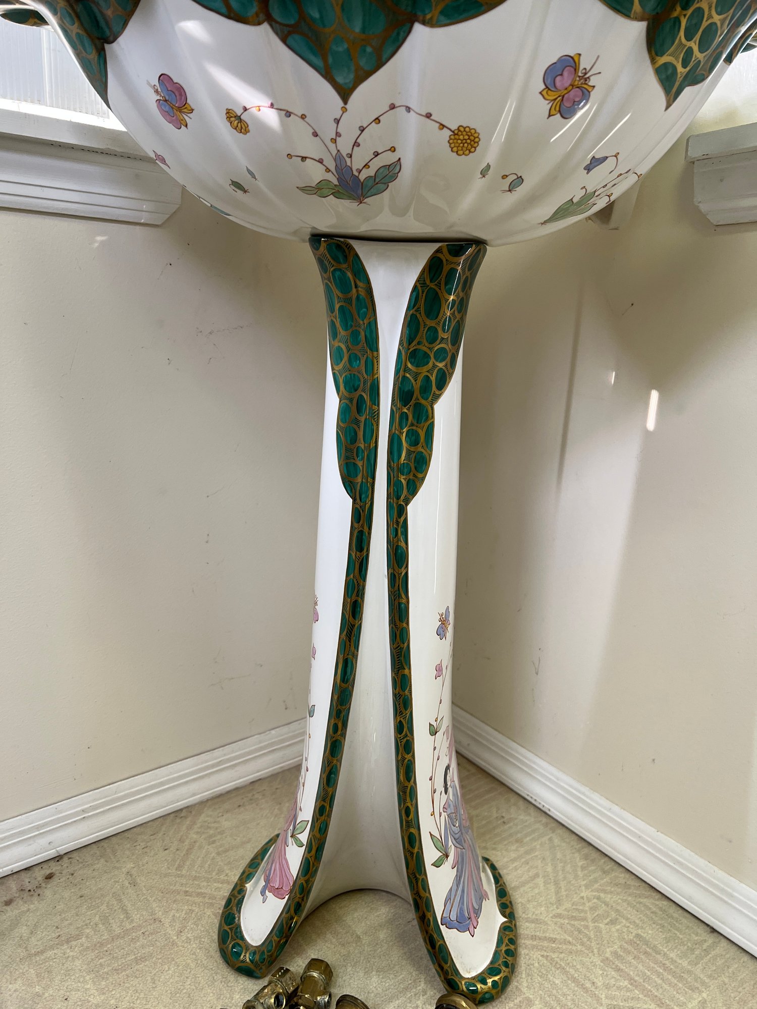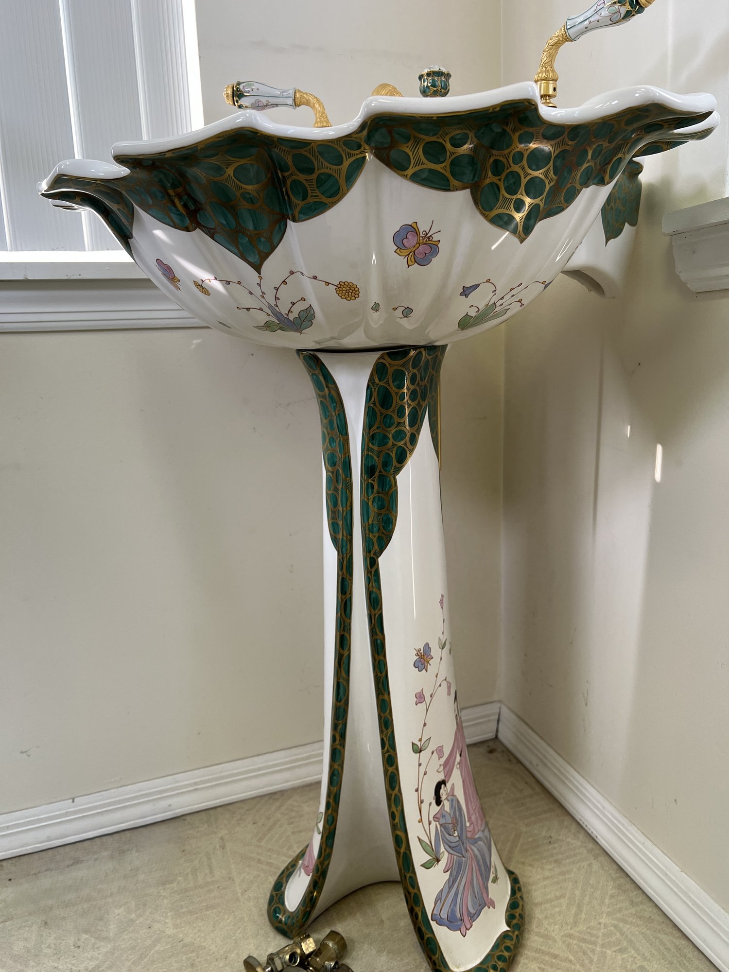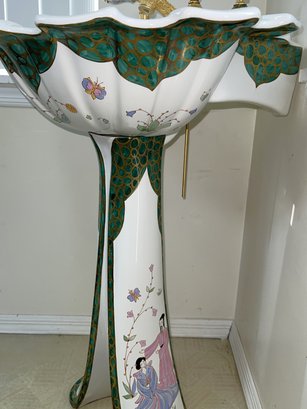 Sherle Wagner International is a luxury heritage brand founded in 1945, known for high-end bath accessories. The sink and pedestal are hand-painted in the "Chinoiserie - Green" pattern, featuring flowers, foliage, a butterfly, and Asian figures.