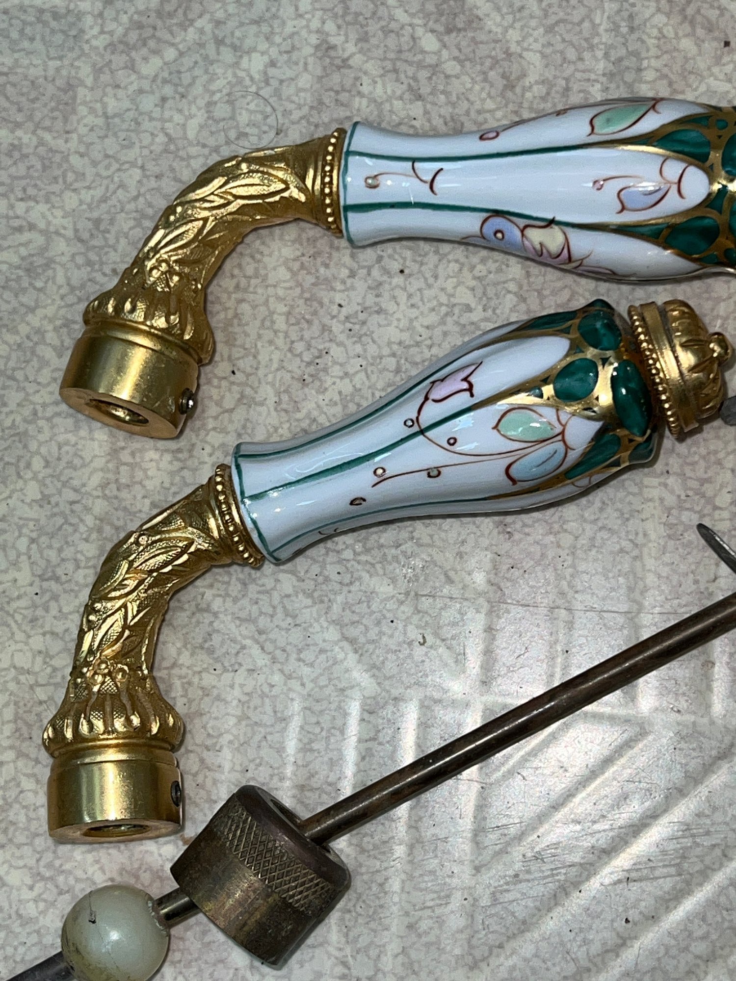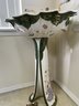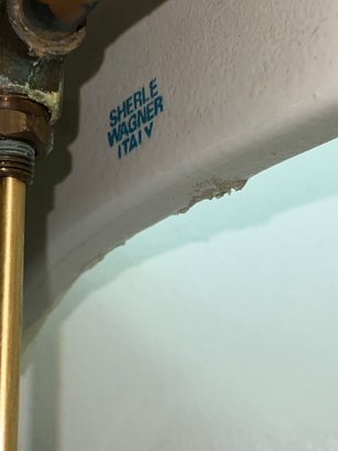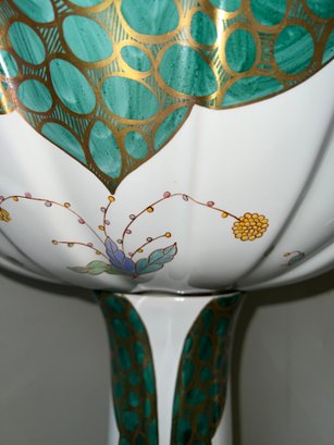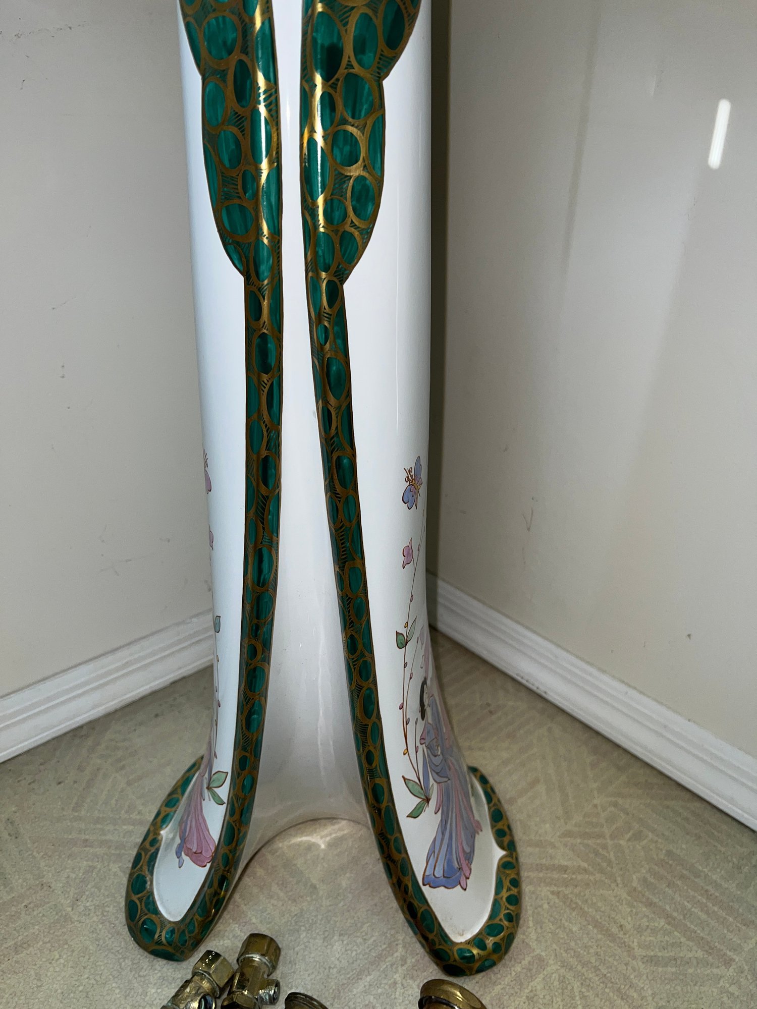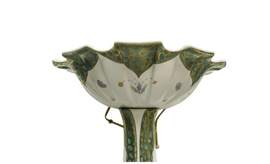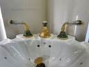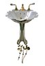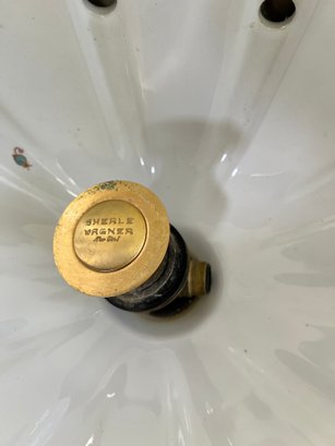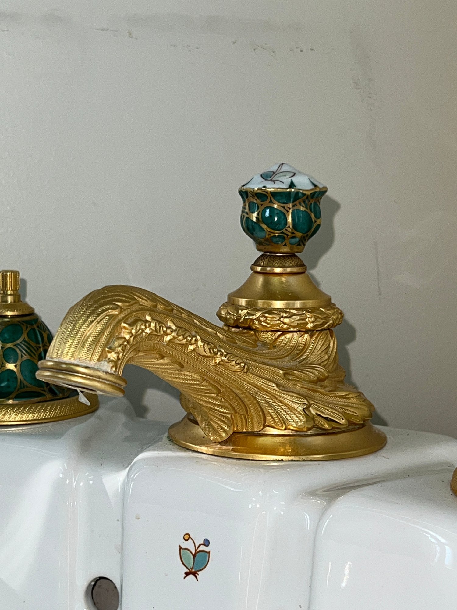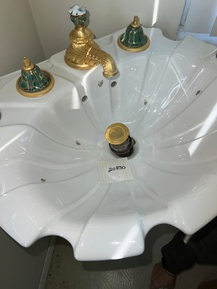 Sherle Wagner International is a luxury heritage brand founded in 1945, known for high-end bath accessories. The sink and pedestal are hand-painted in the "Chinoiserie - Green" pattern, featuring flowers, foliage, a butterfly, and Asian figures.