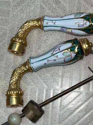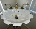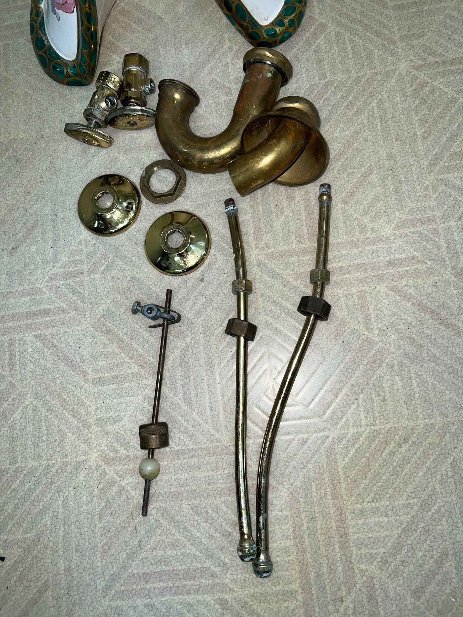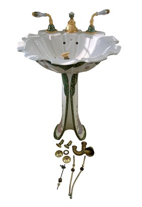 The set includes a porcelain basin (sink) and a matching pedestal leg. This includes hardware, such as faucet handles and stoppers.