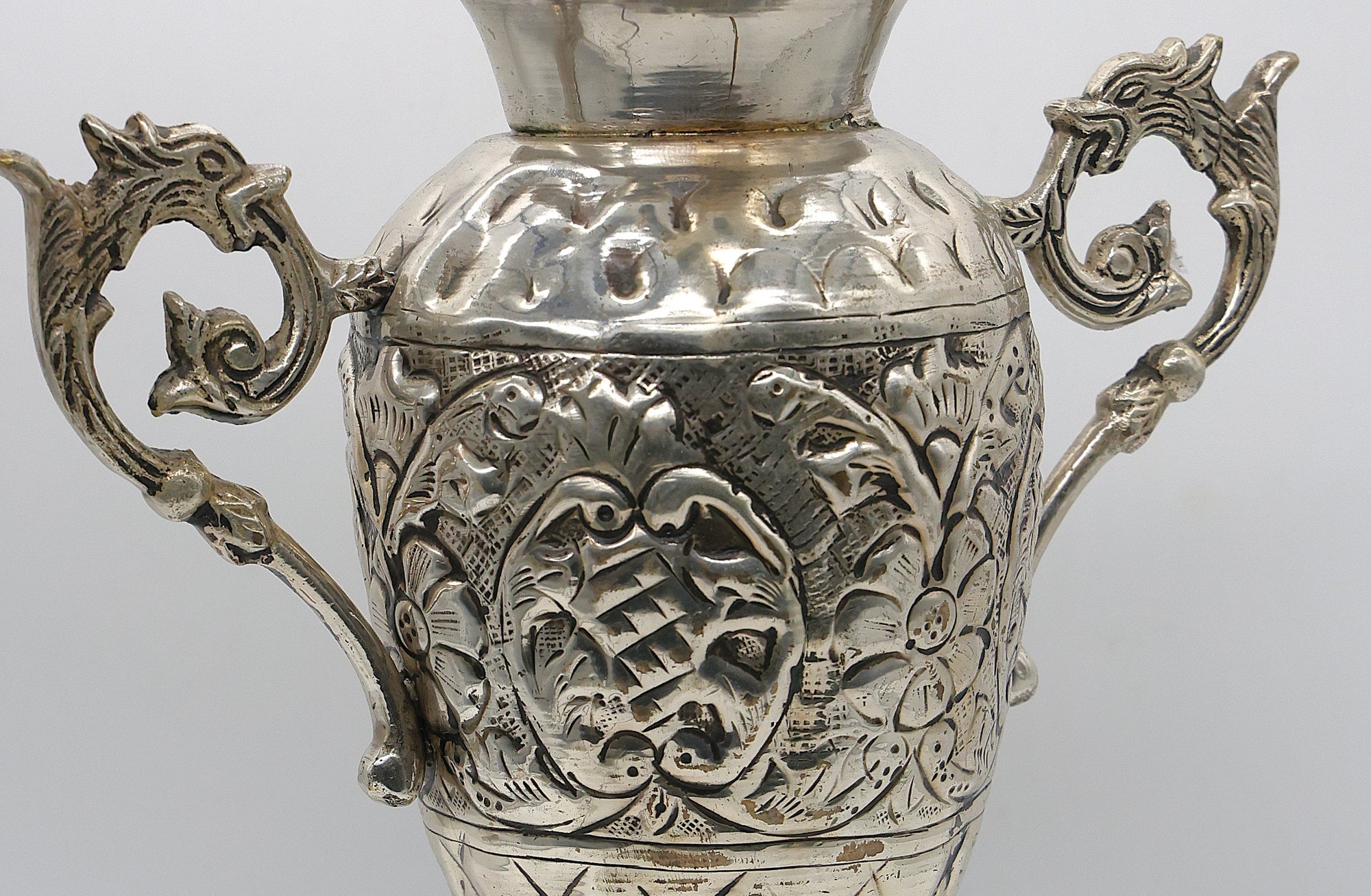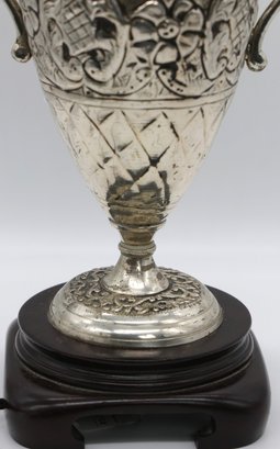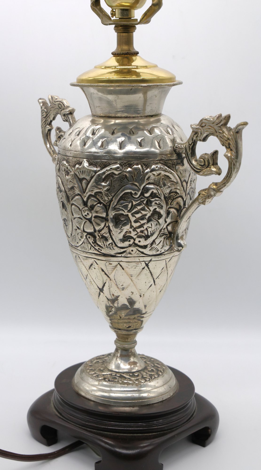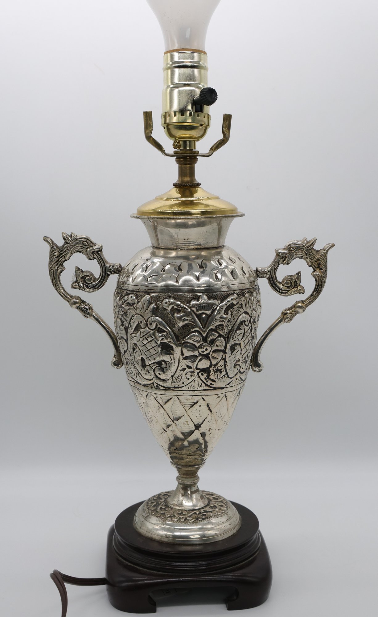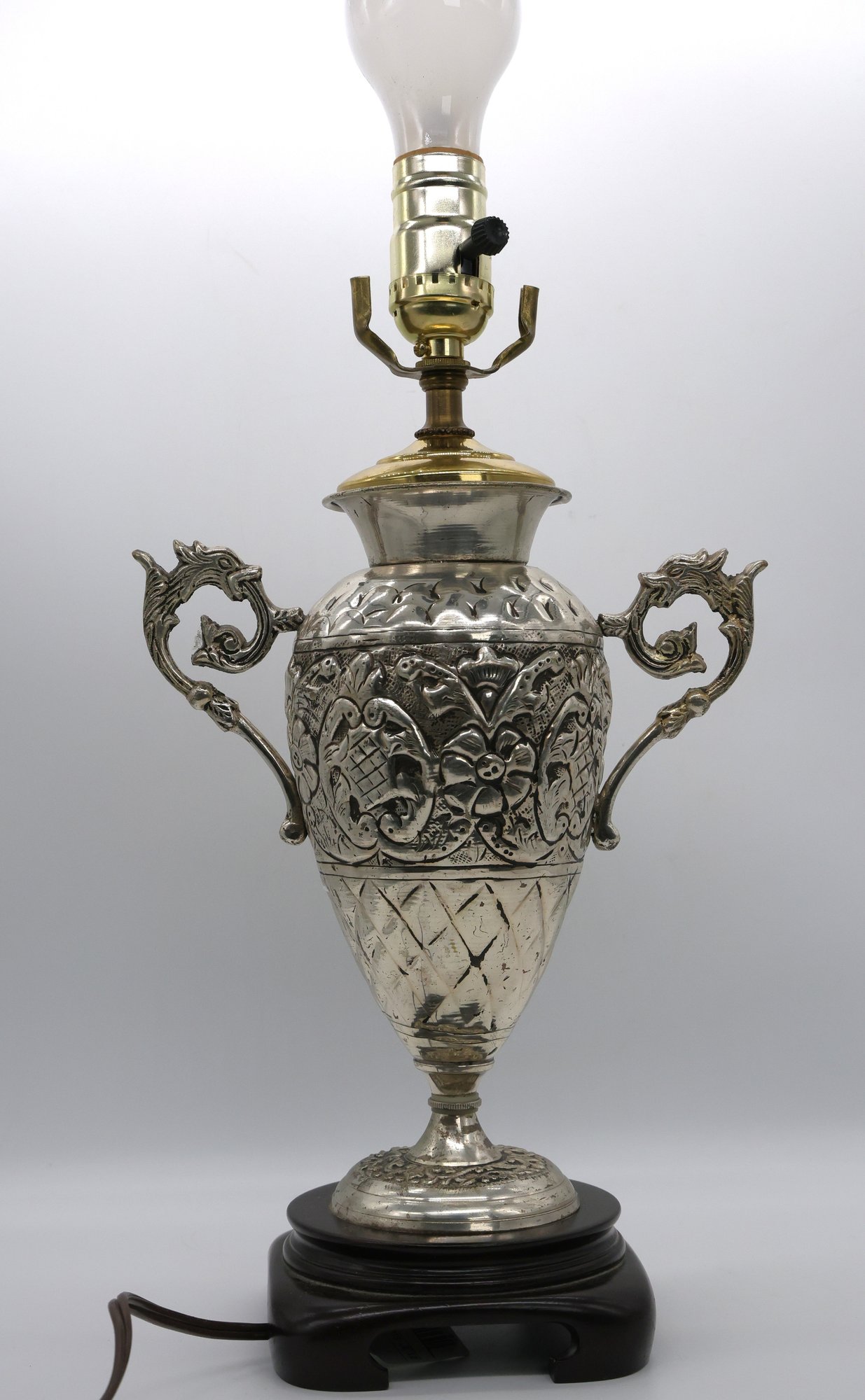 A silver-plated table lamp converted from a decorative urn or trophy cup, decorated with repoussé floral and geometric patterns and ornate handles. It has intricate relief-style ornamentation on the body and handles, reminiscent of Persian or Chinese export styles. The lamp appears to be made of a silver alloy or silver plate and mounted on a dark wooden base. -16"H Working when tested