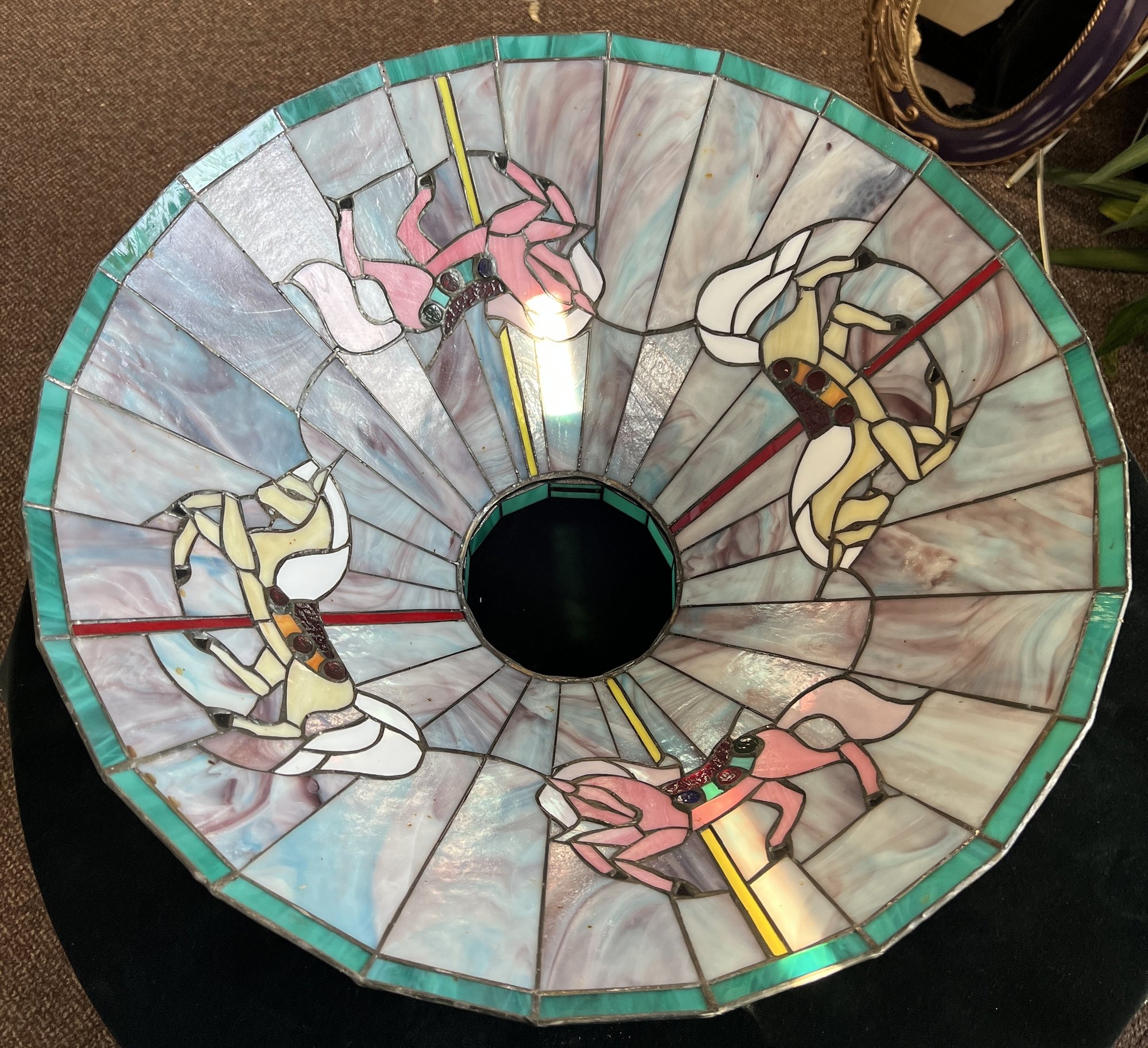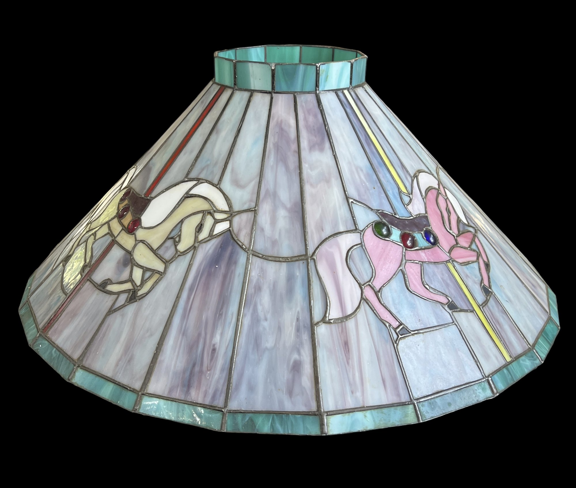 It features a carousel-horse design in various colors, including pink, white, and purple
