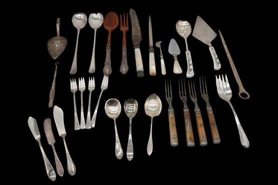 4 mother of pearl handle utensils - 1- citrus peeler, 2 serving and one with sterling bolster dessert server