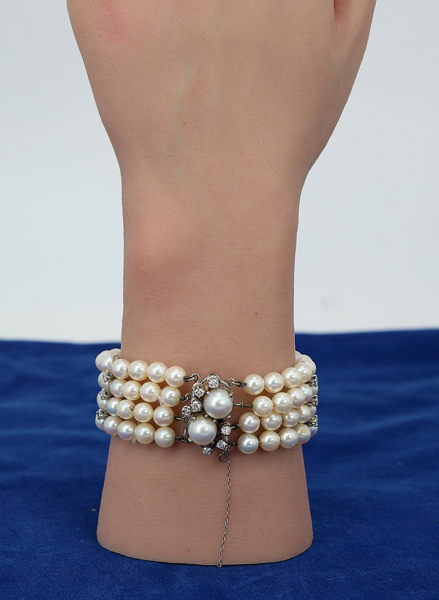Clasp features approx. 9mm pearls and six diamonds, approx. .15ct each and safety chain