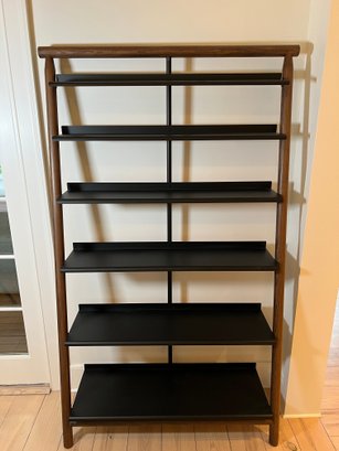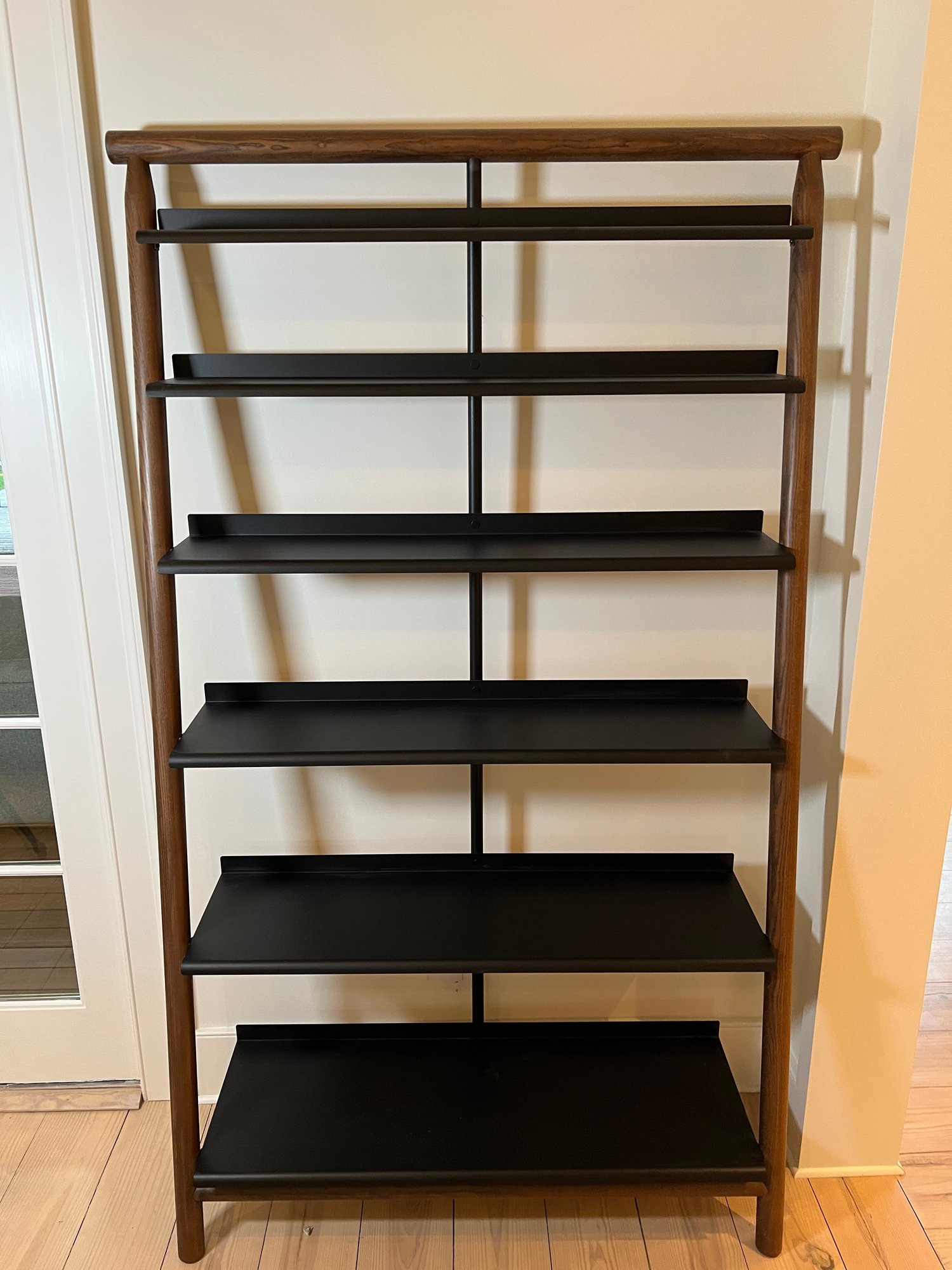 Materials include a wood frame and sheet-steel shelves.