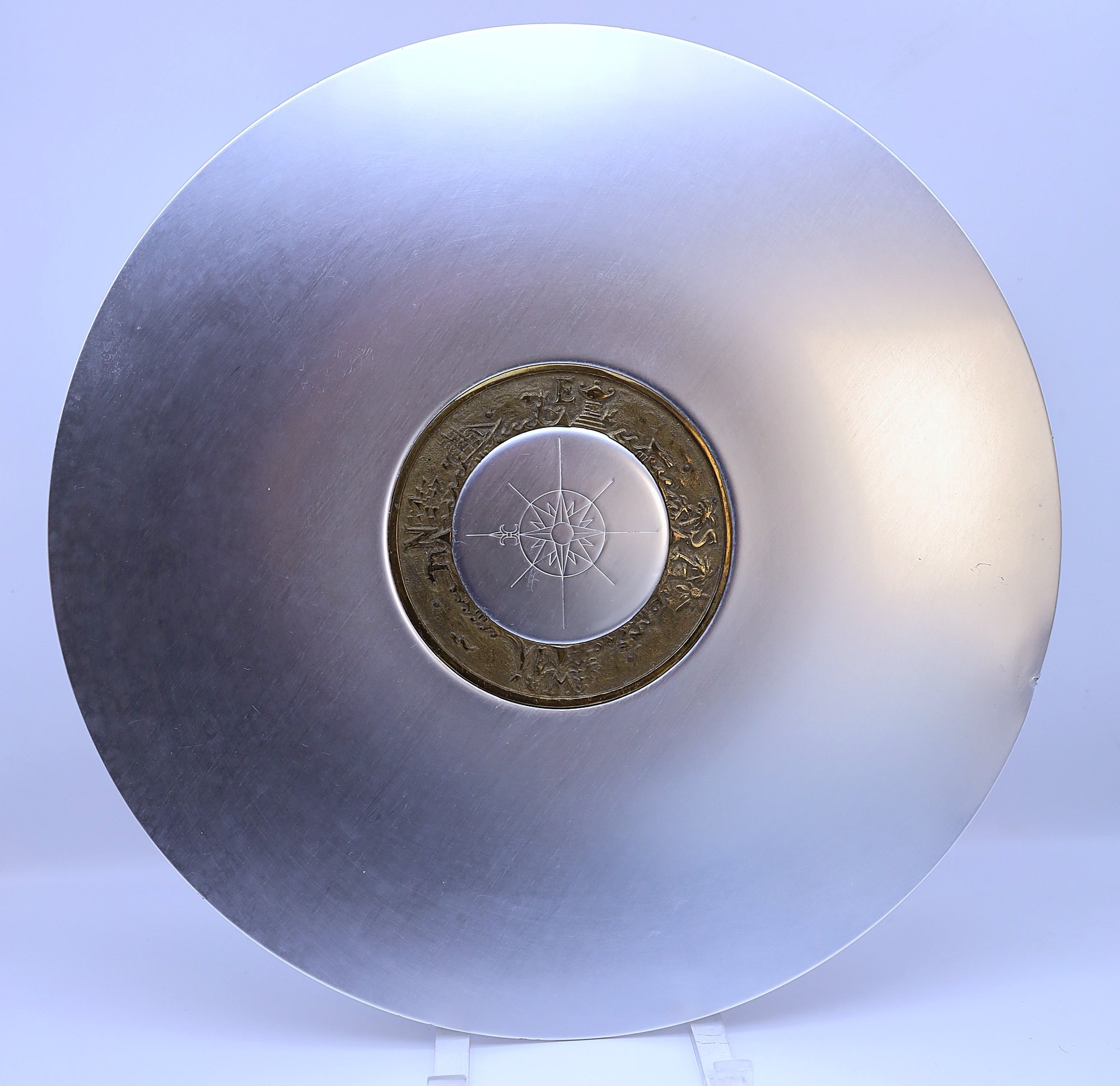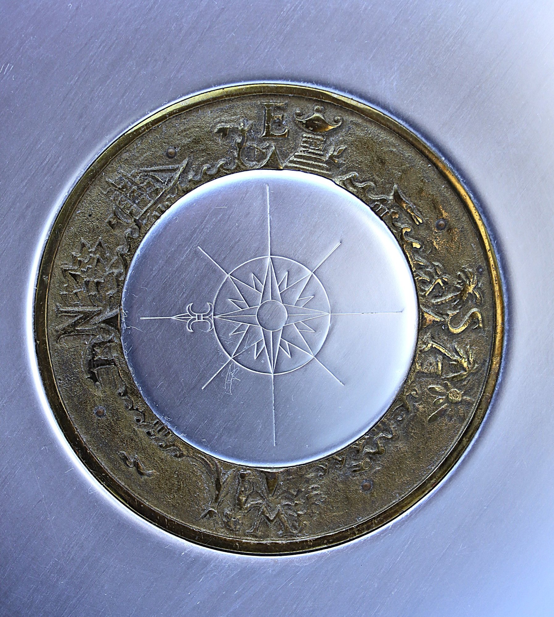 RARE 1930s Kensington Round Circular Brass & Aluminum Etched Tray Plate with NSEW Compass - 15"D