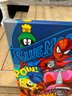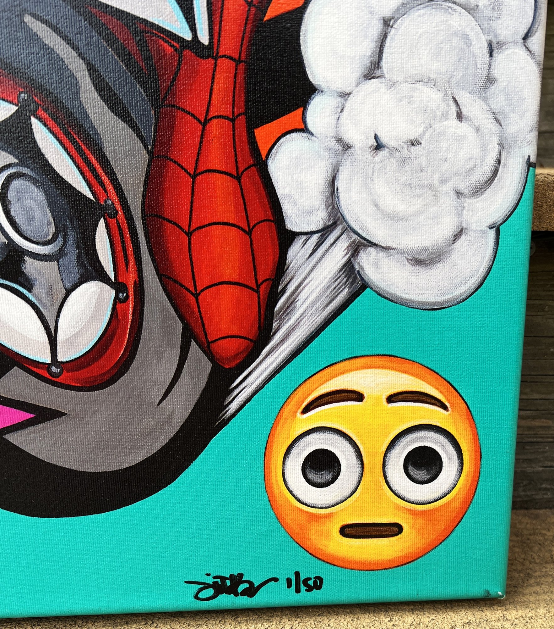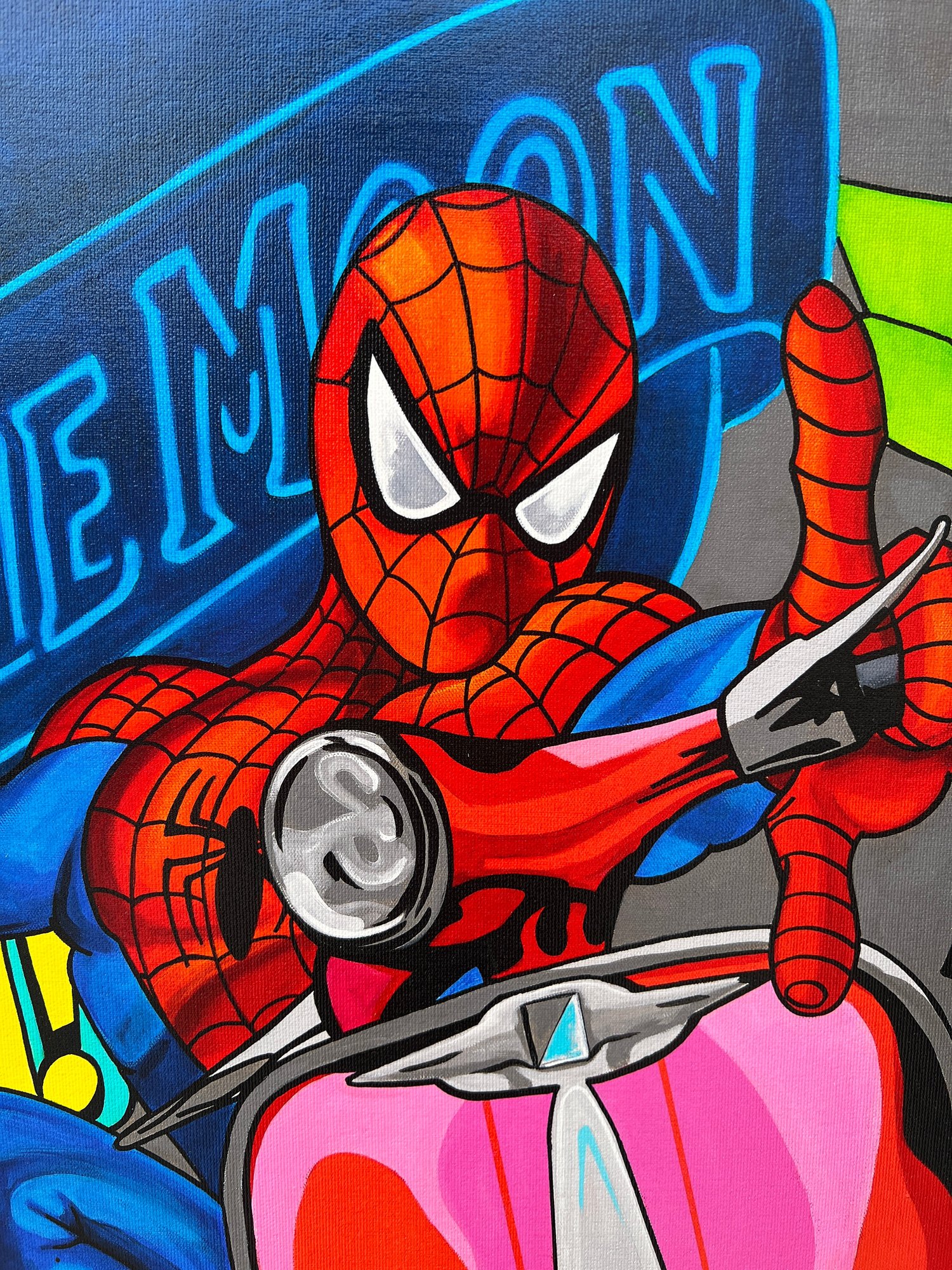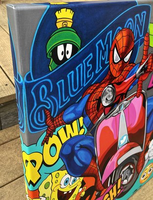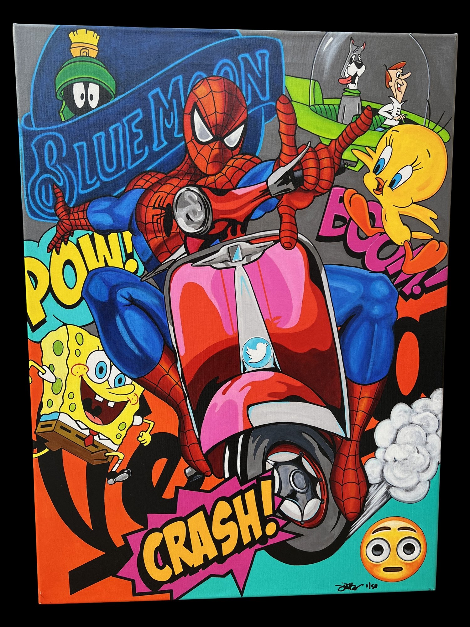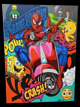 Spider-Man is prominently depicted riding a pink-and-red scooter. The scene also includes Tweety Bird, Bugs Bunny, Marvin the Martian, and SpongeBob SquarePants. The artwork incorporates comic-book sound effects like "POW!" and "CRASH!" along with modern symbols such as the old Twitter logo and an emoji.