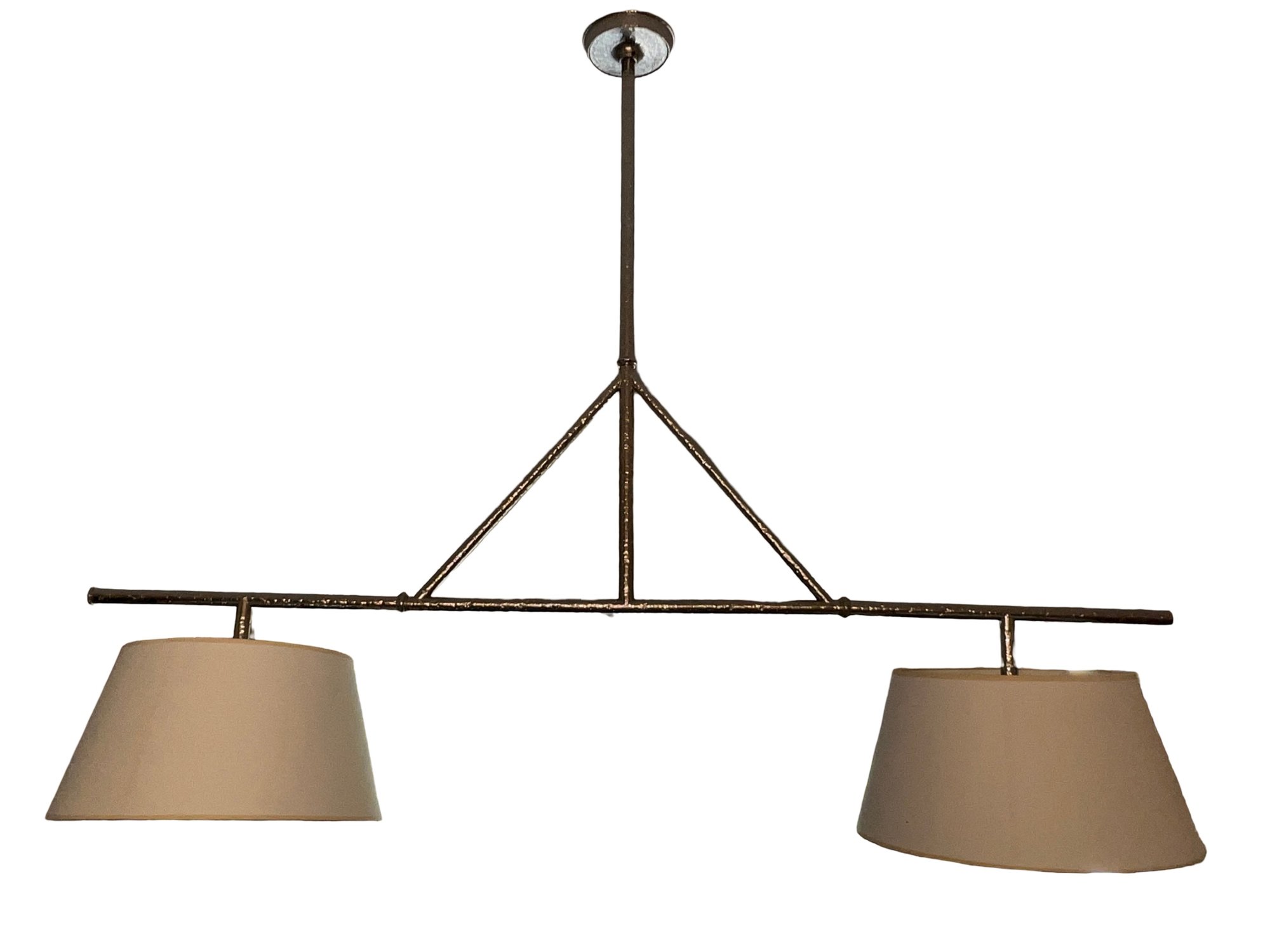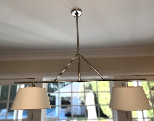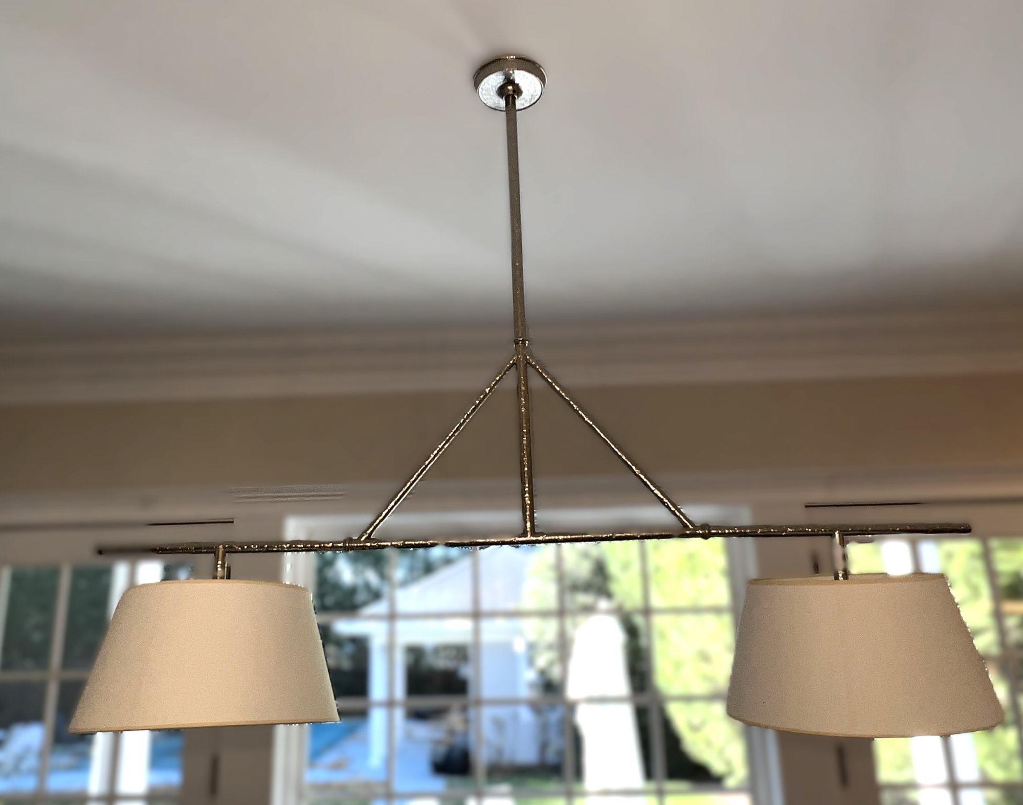 pendant light fixture in polished nickel Suzanne Kasler Collette for Visual Comfort Signature. Comes with two white shades- Light fixtures working when tested and will be removed once sold for you.