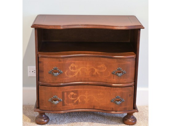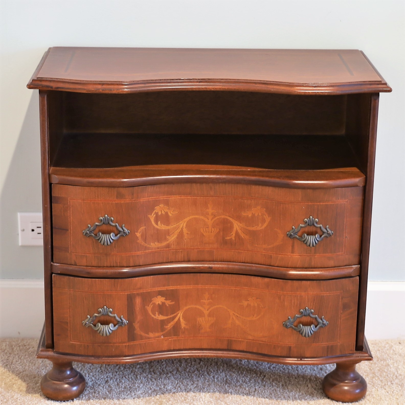 This lovely small cabinet has 2 drawers with a cubby above them and 4 bun feet.