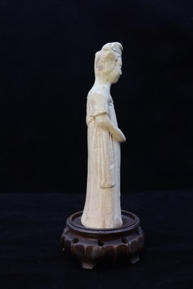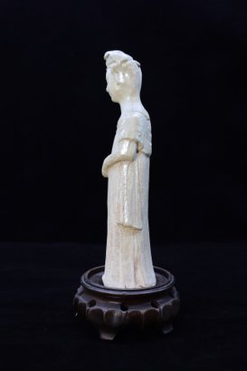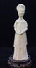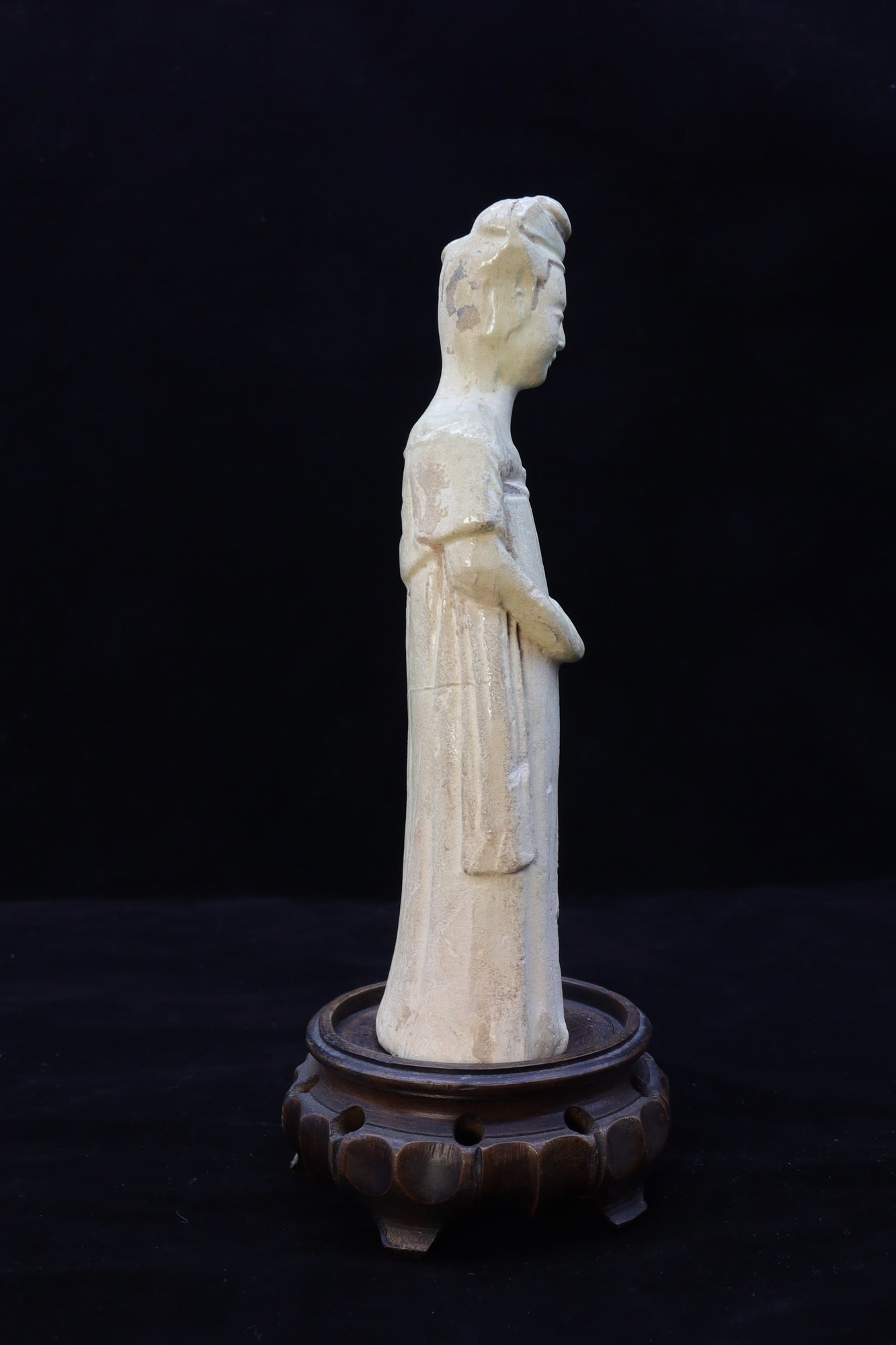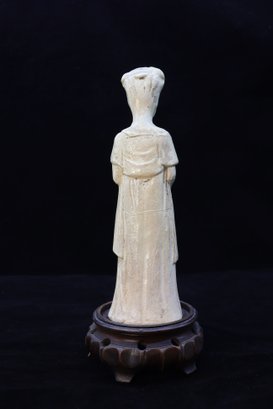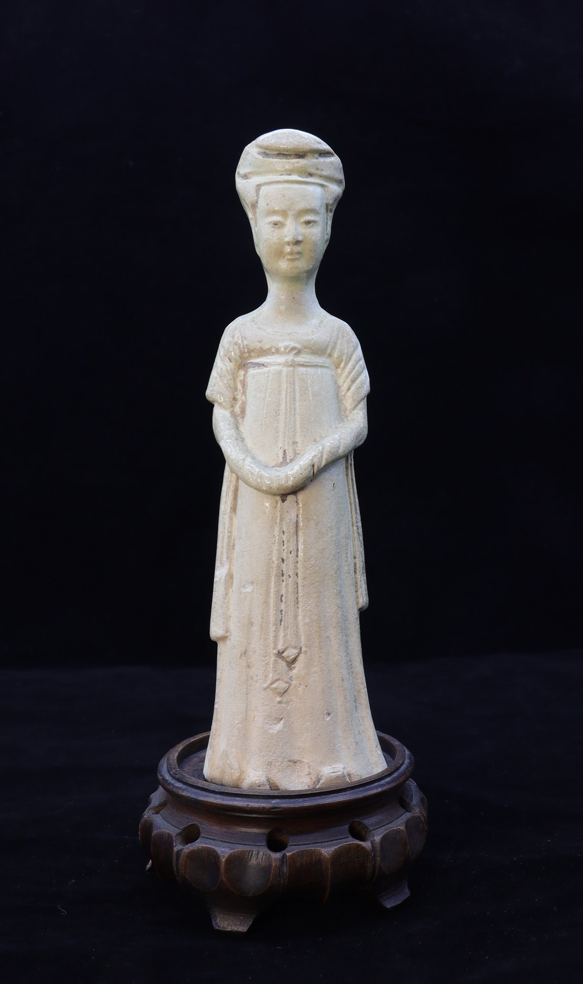 Tang Dynasty Chinese court lady cream color pottery. Such models were placed in tombs of high status to ensure a safe journey to the afterlife. She has a flowing robe and hair up. Straw glaze reminiscent of celadon, weathered from age and exposure. 7.5"H